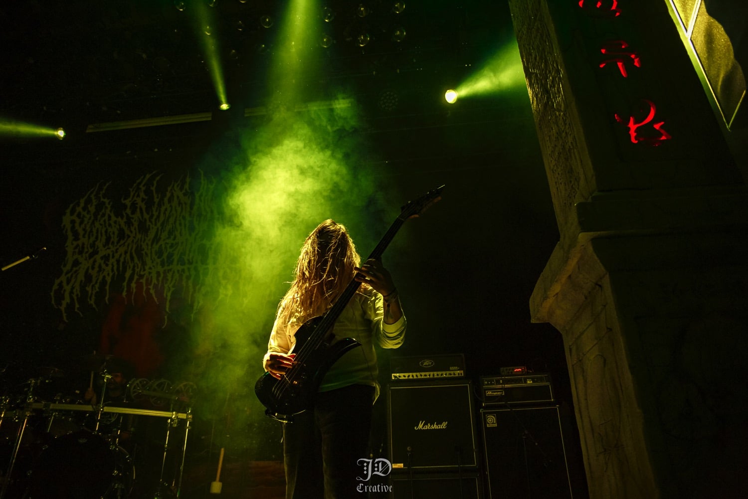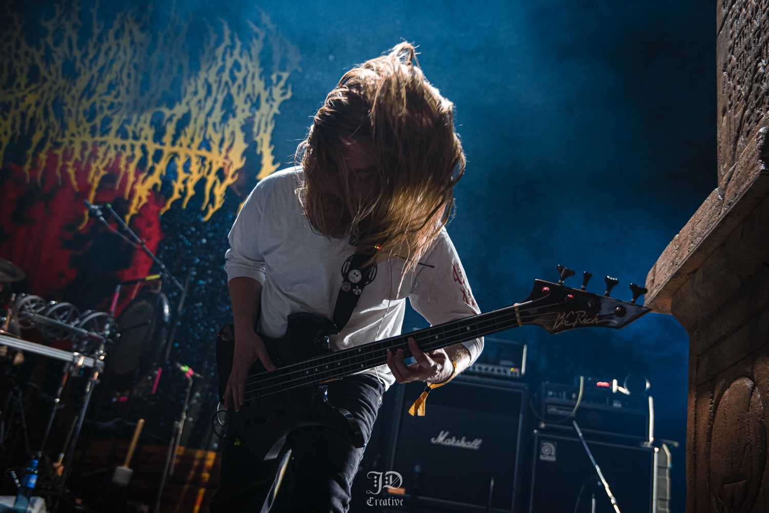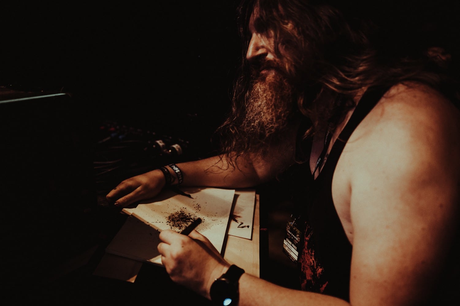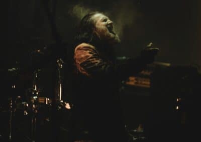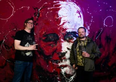 A későbbiekben hallhattunk egy csodálatos dalt, Kathrine Shepard, a Sylvaine énekesnőjének tolmácsolásában, melyet ha jól tudom, eddig csak a temetésen adott eddig elő. Mindenki elcsendesült, miközben bődületes energiák vibráltak a levegőben, sosem gondoltam volna, hogy ennek részese lehetek. Szót kapott még Jan-Martin egyik gyerekkori jóbarátja, Anders Odden, a Cadaver gitáros / énekese is, aki remek humorával és sztorijaival igazán bensőséges hangulatot teremtett. A szervezők közül szintén többen mikrofont ragadtak és meséltek Jan-Martin-ról. A megemlékezés végén a közönség soraiból bárki felmehetett a színpadra, hogy megossza baráti történetét, mondanom sem kell szép számmal voltak, akik éltek a lehetőséggel, így együtt emlékeztünk meg a fesztivál első emberéről. A teremből kijőve egy hatalmas Jan-Martin Jensen portré feszült a falon, melyet Kim Diaz Holm norvég festőművész készített a megemlékezésre, ő szintén mesélt pár sztorit, illetve a munkafolyamatokba is beleláthattunk, hogy hogyan készült ez a műalkotás. Alább meg is lehet tekinteni: