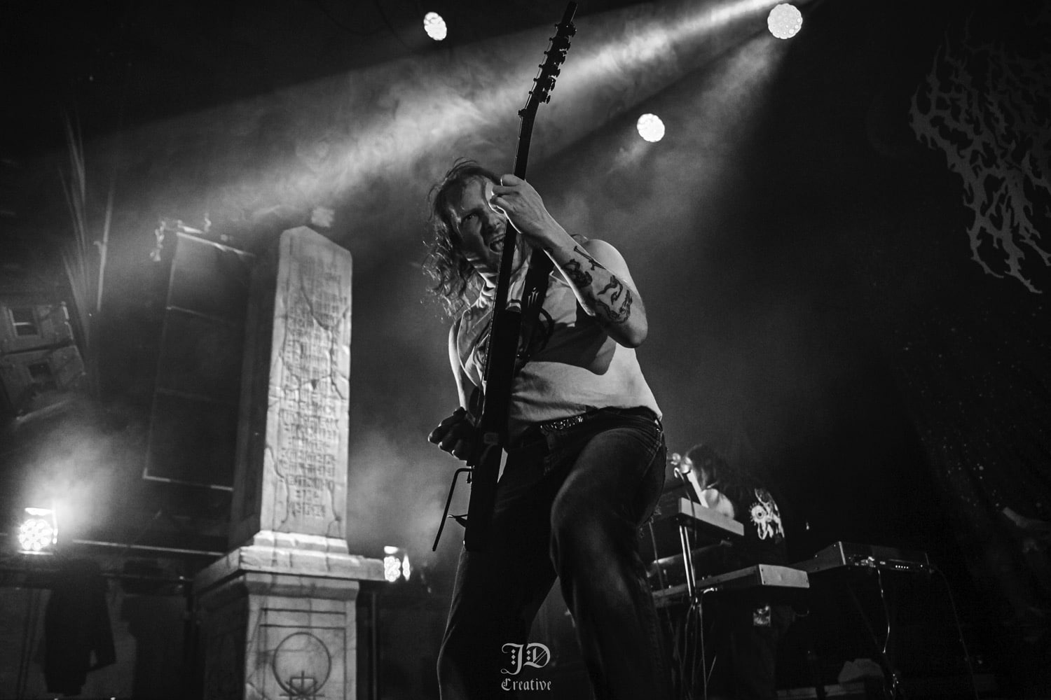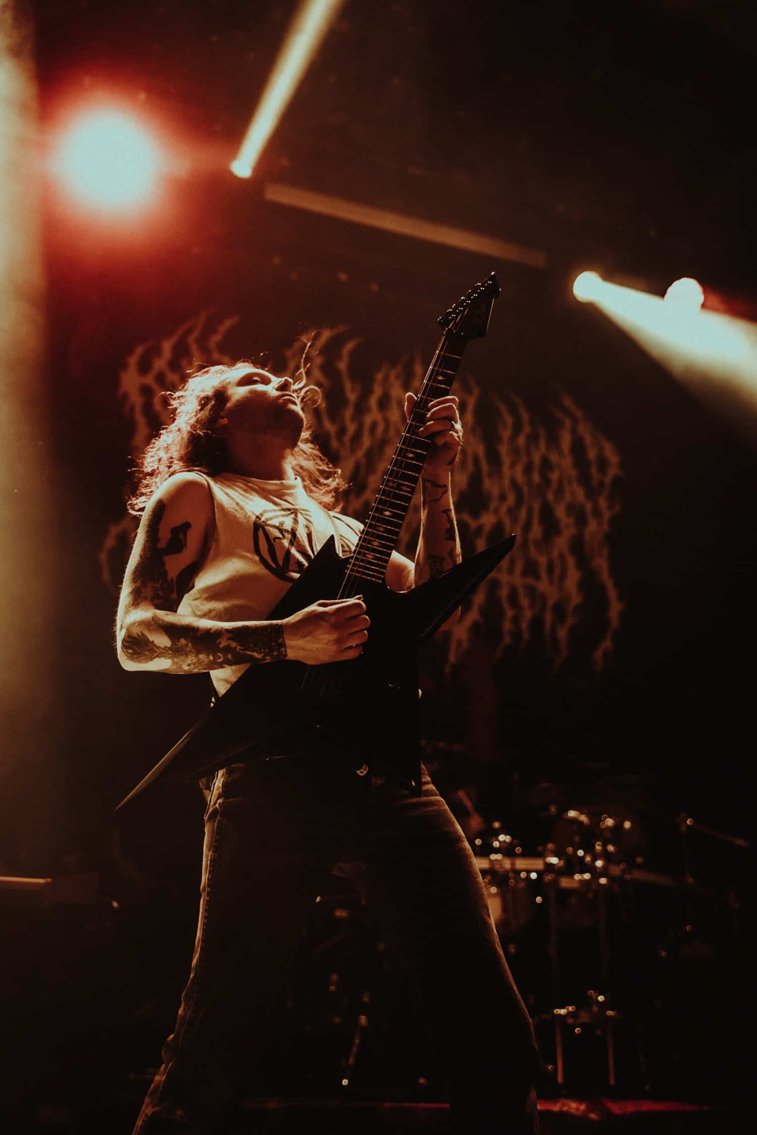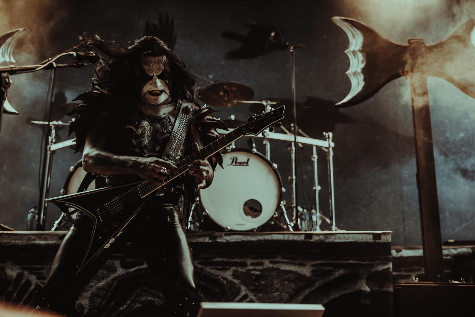 Mondanom sem kell, kint kellemes, hűvös volt az idő, igaz sokat szemerkélt az eső, a nap ritkán sütött ki, a pénteki nap programja pedig ismét elég sűrűnek ígérkezett, így a Brewgata után a Rockefellerben kezdtem. A portugál Gaerea lépett először színpadra, 16óra 30 perckor (mindig pontosak voltak a kezdések), ezer éve szerettem volna őket elcsípni – az alkalom adott volt. Olyan vehemens módon robbantak be a porondra, hogy beleremegett az épület. Az évek során ügyesen kinőtte magát a csapat vizuálisan, mind a ruhák és a színpadi kellékek terén, tudatosan felépítve az egészet. A szétnyitható óriási állósigil közepén volt a dobosuk, a többiek meg a dobozok tetején álltak, felválltva, hol füstben hol stroboszkóp sortűzben. Őszinte leszek – ez az arcmaszkos / kamásli a fejre húzva image nekem nem gyere be, túlságosan mesterkélt, a ráfestett Asmodeus-sigil ellenére sem érzem annyira húú de eredetinek. Oké, értem, hogy valamivel elő kell rukkoli, ami baromi nehéz, meg el kell ugye adni a zenét, ami szintén nehéz egy olyan szcénában, ahol minden sarkon jobbnál jobb black-death-death-grind-stoner-sludge és ezek keveréke zenekarok állnak százával, de hogyha valami jó, az jó és akkor az működni fog. A Gaerea esetében remek dalszerzőkről beszélhetünk, a számaik impulzívak, mondjuk nekem ez már inkább szimplán, sötét extreme metal, mint black / death, de ez legyen az én véleményem. A produkciójuk amúgy hibátlan volt, élvezhető, volt íve / felépítése az egésznek, egy begyakorolt performaszt láthattunk tőlük. Az énekesük furcsa, pantomim mozdulatait én valahogy máig nem tudom hova tenni, szerintem full cringe kategória, az időközben új gitároshölggyel operáló csapat, ettől függetlenül rutinosan teljesített. A gitár sound náluk különösen harapott, konkrétan leszakította a fejed (vonalból tolták, ahogy elnéztem), azt meg külön díjaztam, hogy az emeletről gyakorlatilag premier plánban láthattam a műsort. Szerencsére ismét jönnek Magyarországra is hamarosan.