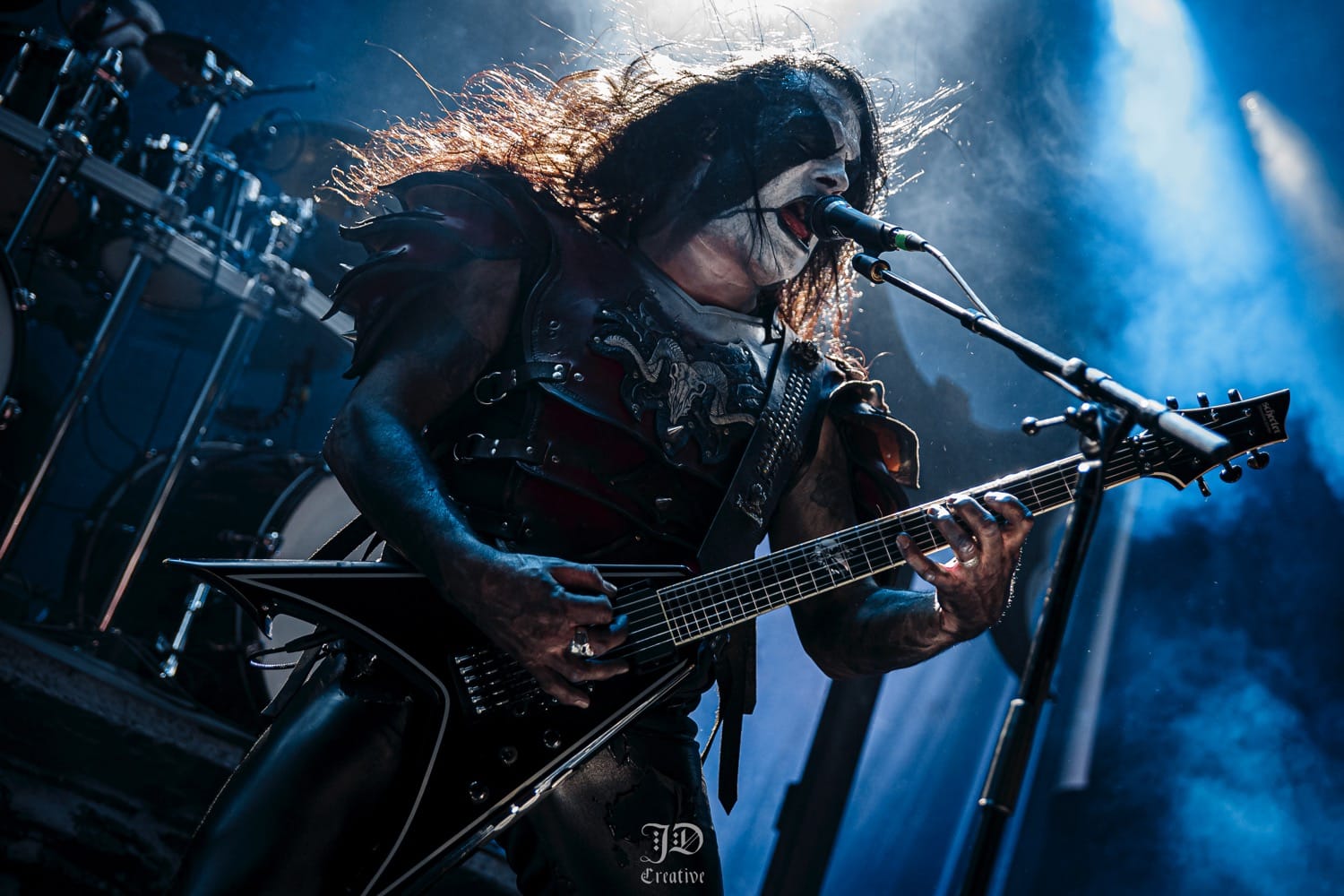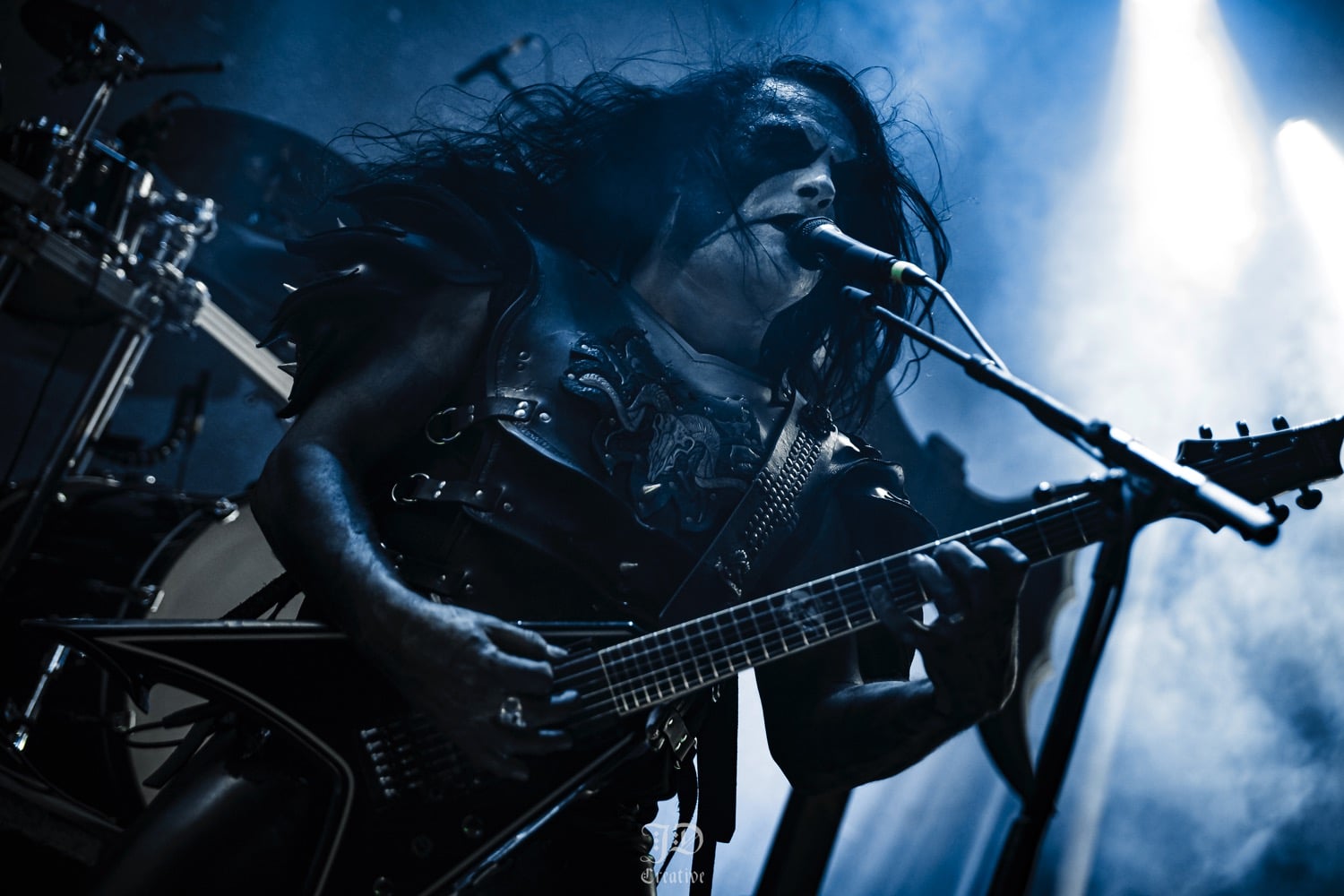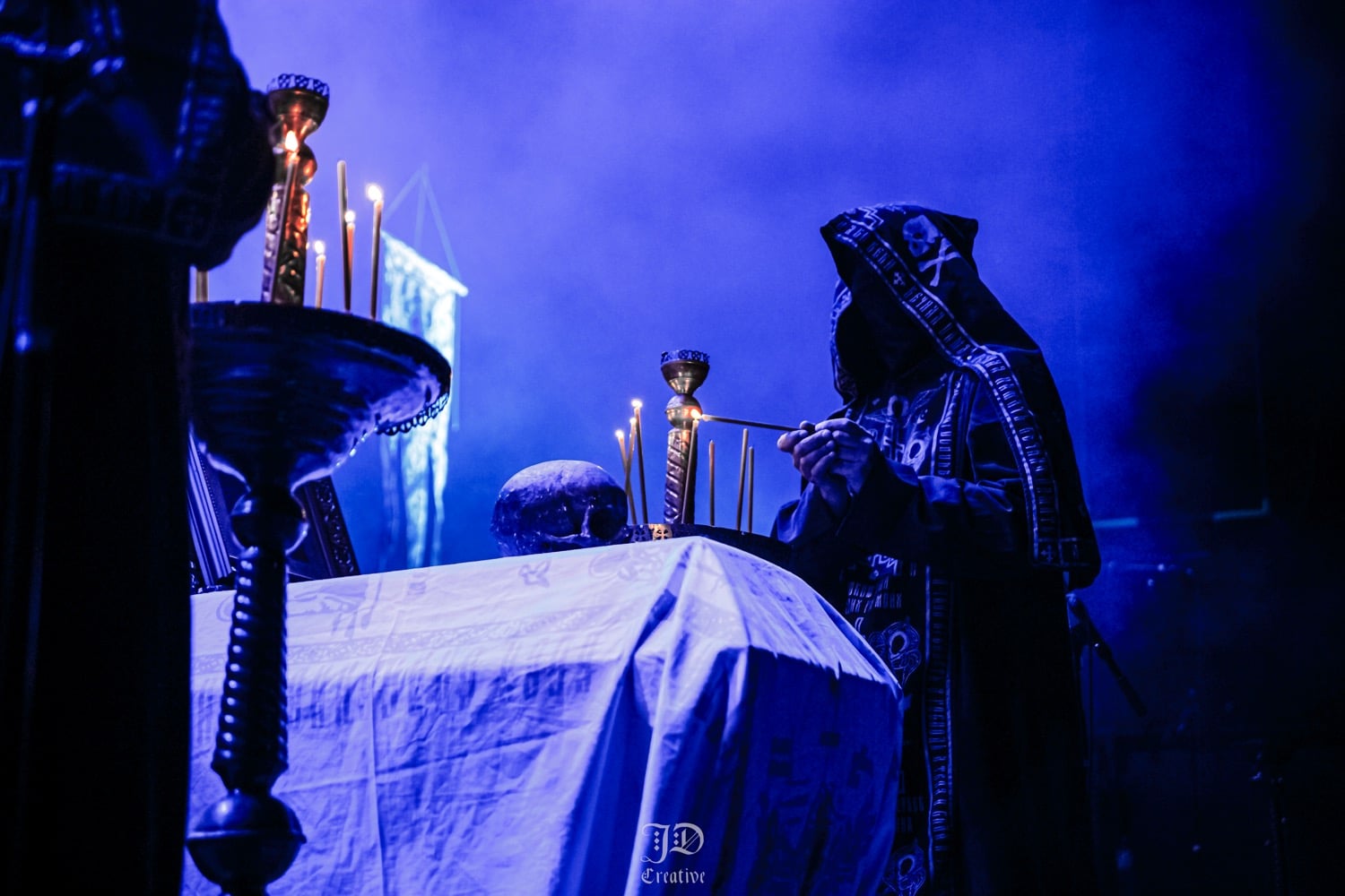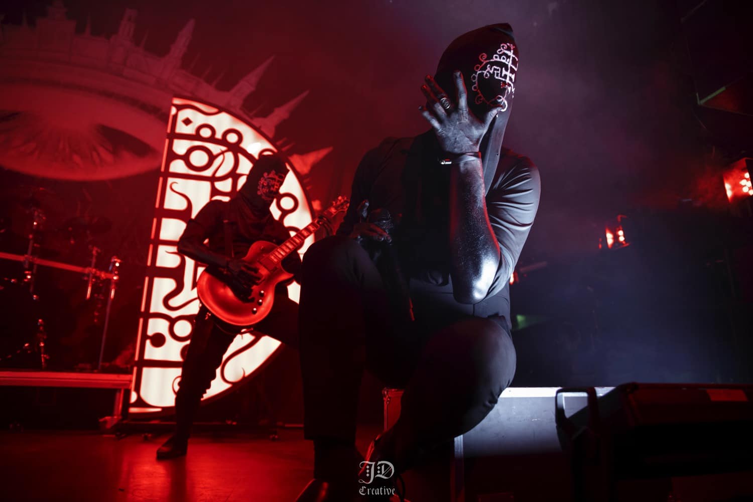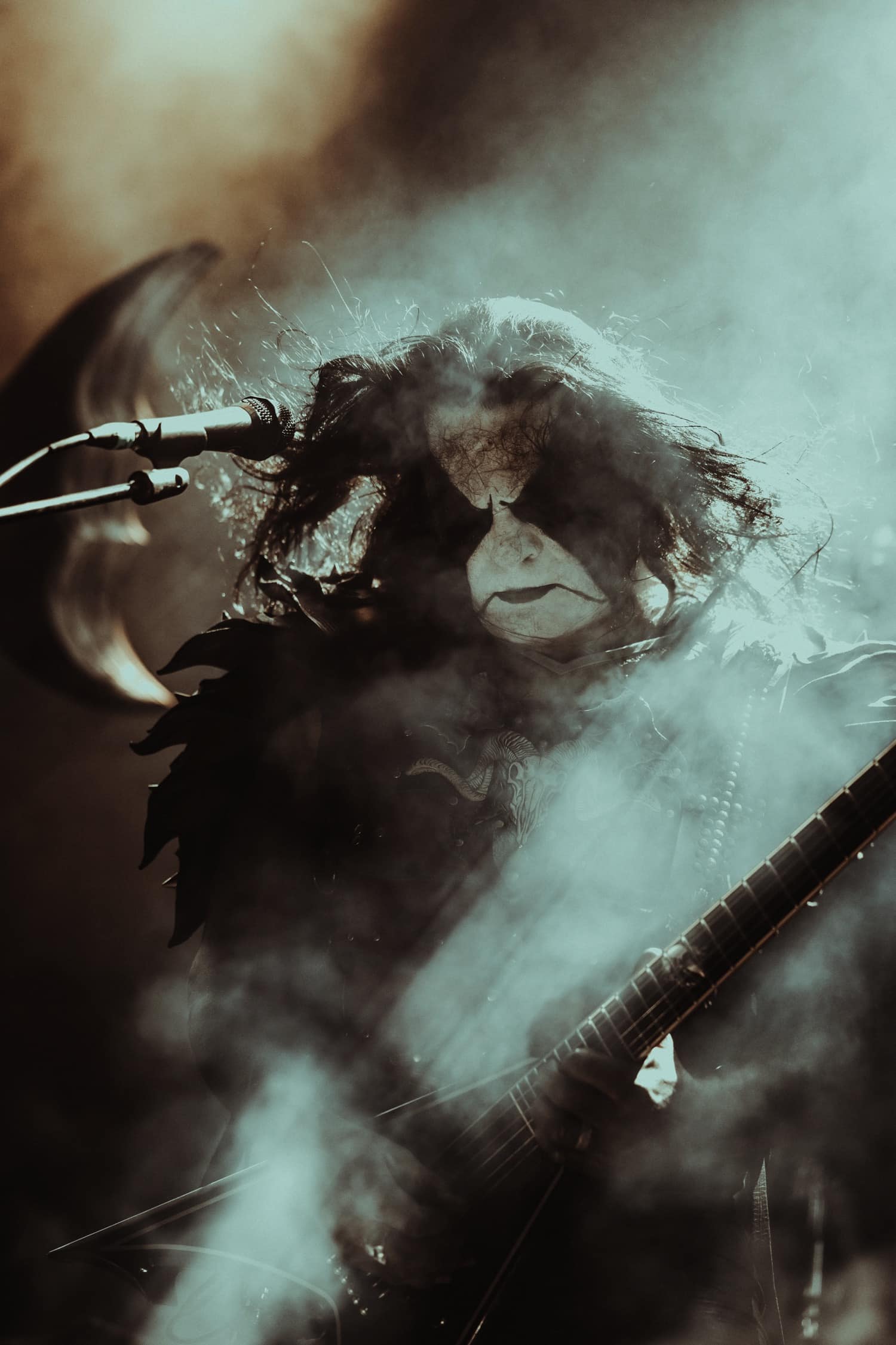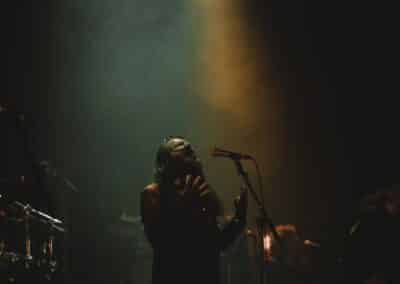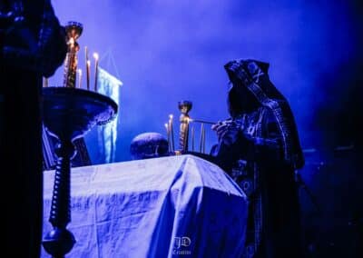 A Dødheimsgard fellépése roppant szuggesztív és szürreális volt. Sosem az egyszerű oldaláról közelítették meg a black metalt, a korai old school érából totálisan elkanyarodtak a modern / avantgárd majd pedig a progresszív black metal vonal felé, abszolút formabontó módon. Jellegzetes hangképpel operáltak, ezúttal 11 tagú (!) orkesztrává kibővülve. Vicotnic bohém aghoriként hintette és fújta a hamut az időbe és térbe, végig a fellépésük alatt, miközben díszes tüllel takarta magát, úgy vezényelt, s énekelt. Hatalmas showman, meg kell hagyni, őszinte beleéléssel csinálta, de a többiek is kitettek magukért. 3 kórista, ebből egy hegedült is, 5 hangszeres még mellé, és hogyha ez nem lenne elég, a setjük kb. egyharmadánál feljött még két símaszkos laptop dj is, hogy teljes legyen az őrület. Ezt a pompásan szerkesztett muzikális káoszt végül továbbtetézte (régi vokalistájuk) Kvohst megjelenése is, akivel közösen adták elő az All Is Not Self meg a The Snuff That Dreams Are Made Of dalokat, nekem viszont az abszolút csúcspontok a Regno Potiri és a Traces Of Reality számok voltak, ezzel a színpadképpel meg főleg bizzarrnak hatott az egész. Útközben persze kapcsoltam: a háttér molinószalagjai, a színek, a fekete és fehér maszkok mind a Black Medium Current albumot frontját idézik, zseniális húzás tőlük. A színpadi fényeket norvég cimborám, Geir Marvin Johansen kezelte, innen is üdvözlet neki, örülök, hogy ismét találkoztunk.