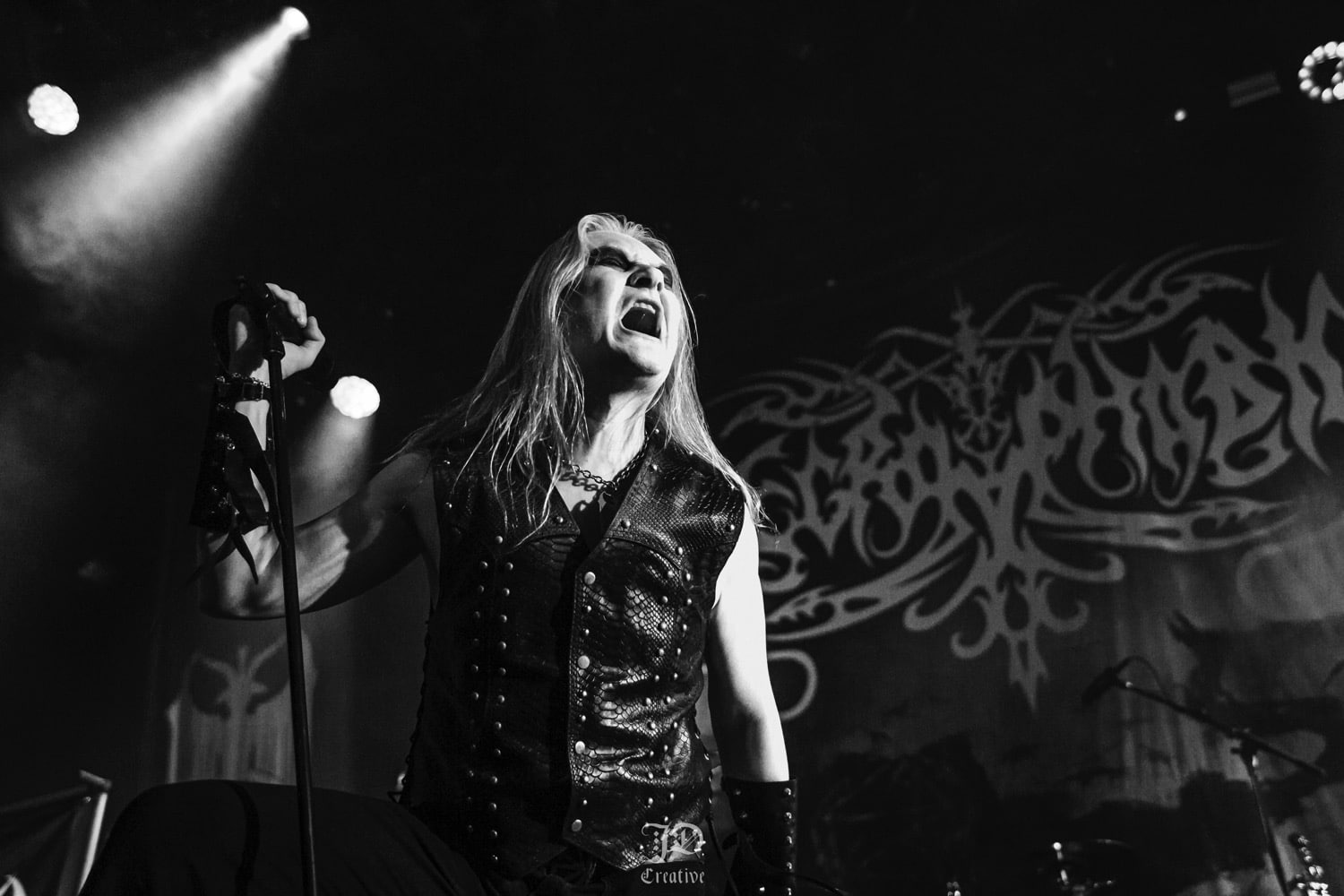 A Tiamat nekem kimaradt, hogy őszinte legyek a kanadai Spectral Wound fellépésére gyúrtam, így időben átdzsasztáztam a John Dee katakombájába, hogy lássak belőlük valamit. Ők pontosan az a zenekar, akiket mindenkinek kötelező látnia élőben legalább egyszer, mert annyira lehengerlő bulit toltak ezek az ismeretlenség homályába burkolódzó fiatalemberek, hogy azon ott kellett lenni. Főleg ha kedveled a szónikus sebeségben daráló, enyhén szuicid black metalt, mindenféle cicoma nélkül, bele az arcodba stílusban. Talán a Wiegedood hasonló intenzitásban, mint a Spectral Wound, de míg a belgák elvont, disszonanciát sem mellőző muzsikával pusztítanak, addig ők sokkal komorabb, régisulisabb és kevésbé kitekert black fertőt tesznek le az asztalra. Összes dalukban ott bújik az a fanyar hangulat, amely a műfaj sajátja, az öndefiniálás során pedig az aristocratic suicidal black metal találó stílusmeghatározásnak mondható. Ilyen című dalukat játszották is, talán az egyetlen középtempós tételük volt ez, szerencsére végig a gyorsaság és darálás uralkodott az estén. Hangzásuk top-notch, úgy szólt a basszusgitár is a mixben, pedig hátul álltam, hogy az ember könnye is kicsordult. A Spectral Wound gyönyörűen bazsevált, hogy őszinte legyek. Előkerült a borítókról, fotókról ismerős butykosüveg, gondolom nem színtiszta gleccservíz volt benne.