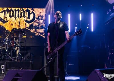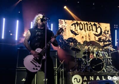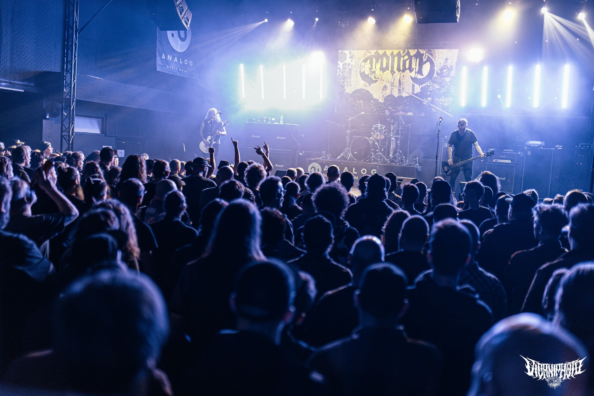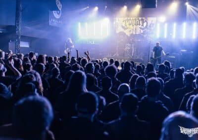 Az ultra-súlyos brit trió, a Conan, a maga nemében egy zenei csapásmérő eszköznek számít. Ezer és egy éve kísérem figyelemmel a ténykedésüket, még az Aurora Borealis kiadó aktívitása alatt indultak hódító utukra, a Horseback Battle Hammer EP-vel. (Az akkor még frissnek számító Throne Records is lecsapott az anyagukra.) Kedvenceim a Monnos és az Evidence of Immortality, a többi albumuk sem gyenge fialás, de az elmondható a srácoktól, hogy sokat finomodtak, váltak zeneiebbé az évek során – persze ezt csak és kizárólag egy saját Conan-skálán mérve mondom. Továbbra is súlyos, ugyanakkor sajátos sludge-doomban utaznak, viszont egyre tökösebb dalokat sikerült írniuk, Jon Davis (alapító-őstag, gitáros-énekes) süvöltő énekhangját egyszerűen nem lehet nemszeretni, annyira brutális ahogy küldi a döce riffek mellé ezt a (jó értelembe véve) kiégett / meggyötört énekhangot, apró dallamos rekesztést belecsempészve a számaikba. Időközben levált tőlük a basszer, és egy új fószer, David Ryley kezelte a négyhúrost, nem is akárhogy. Pompásan duruzsolt hangszere, látszódott, hogy rettentően éli és érzi amit csinál, nem csak karótnyelt módon pöngetett. Úgy tudom Chris Fielding nyomta velük közel 10 évig, helyette jött David. És, hogy milyen volt a Conan? Egyszóval: kurvajó. Ez egy koncertzenekar. Gyönyörűen szóltak, egészségesen balanszált hangképpel zúztak, sőt ami nagyon tetszett, hogy David hangja egy az egyben Dave Edwardson-t jutatta eszembe a Neurosis-ból, így nem kevés Neurosis-áthallásban volt részem, főleg a dupla vokálozós részeknél. Plusz néhol Today Is The Day flashem is volt, úsztam a mocsári mámorban. Lementek a nagy slágerek (Levitation Hoax, Desolation Hexx, Thunderhoof, Hawk As Weapon, etc.), itt már konkrétan az oldal-tam lába megbicsaklott és bedőlt a dobosuk, Johhny King combjára, egy szám tuti lement tam nélkül, de elég volt neki bőven az pár beütő, kísérő meg a pergő és egy felső-tam. A közönség pedig szemmel láthatóan vette a lapot, élték a bulit, sőt, az is lejött, hogy a Conan tagjai szerethető karakterek, az alázatosságuk nem maradt ováció nélkül. Bárhol és bármikor újra megnézném őket szívesen.