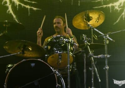 Szóval színpadon a Bongripper. Kedves fotós kollégánk Vida Dániel még mondta is, hogy “fogalma sincs, hogy mibe rángattam bele” de jön és szívesen kattintgat. Nem akarom lelőni a végkifejletet. Tehát ez a négy faszi ott fenn, akik kinézetre totál konszolidált arcoknak tűnnek, full átlagos külsővel, konkrétan megszexelt mindenkit ezzel a lassan hömpölygő-pulzáló, egyszerű, de káprázatos muzsikájával. Szó szerint. Rommá. Méghozzá aquincumi rommá. Szinte lemezminőségben nyomták, és majdhogynem tökéletesen. Elementáris volt, nem evilági, és még most is fenntartom azt, hogy erre csak ők képesek, senki más. Ultra-kémia van közöttük. Folyamatosan rázott a hideg, vagyis nem rázott, hanem zsibbadtam végig, a fejem búbjáig. Ha nem ismered a Bongripper zenéjét, könnyen csapdába eshetsz: eleve lövésed sincs hol van a téma eleje / vége, hol van az EGY, illetve hányszor megy el a riff a következő robbanásig. Sludge-doom mesterfokon, stoner elemekkel. Fokozatosan feszültséget keltenek, építkeznek majd feloldanak, ez ismétlődik, majd kirajzolódik egy nagyon érdekes struktúra ami néha önmagába kanyarodik vissza ouroborosz-szerűen, de ez sem mindig állandó. Van, hogy csak menetelünk egy kiszámíthatatlannak tűnő katarzis felé, aztán hopp, máris másik dimenzióban találjuk magunkat, majd vége. Ami lemezen is lenyűgözött bennük, a hihetelen analóg feeling és emberi dinamika mellett (biztos vagyok benne, hogy az anyagaikat élőben és egyszerre szokták felvenni kb. minimális útómunkával), hogy ezt a színpadon is képesek hozni, sőt. Sokkal alattomosabban és kimérten tudják adagolni a bongdzsúzt, az agyvelőd meg ott toporzékol a krániumban, hogy “te jó ég, ez szétszed darabokra, aztakurva, há möghalok, vááááá” aztán pont jön egy feloldó ambient drone tétel, minimális dobütemekkel és kész véged van. Apropó dobütemek: minimalista dobcucc, olyan élettel teli színes játékkal, amire nem találom a szavakat. Daniel O’Connor rettentően érzi amit csinál, sőt egy külön kommunikációs mezőt képvisel a Bongripper ritmusszekcióján belül. Öröm volt látni, hogy ezt sokan levették, átjött nekik a feeling, azt meg főleg öröm volt látni és egyben meglepő is, hogy sok hölgy mennyire éli és szinte hangról hangra ismeri a Bongripper zenéjét.
