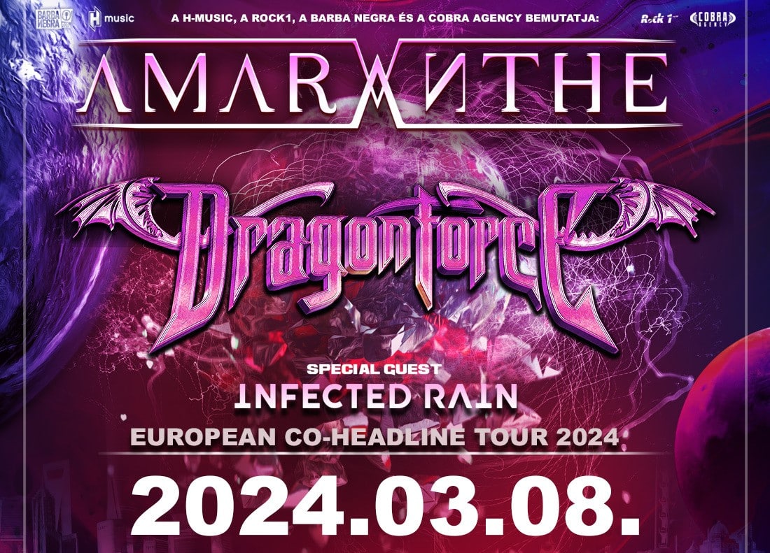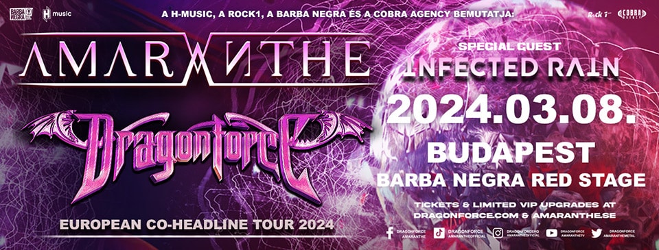 2024. március 8-án érkezik hazánkba az Amaranthe és a Dragonforce co-headliner bulija, előzenekarukként pedig az Infected Rain lép majd a Barba Negra színpadára. A két fő banda nemrég zárta nagy sikerrel közös USA-turnéját, az európai koncertsorozatot pedig 2024. február 21-én Hamburgban kezdik meg, és meg sem állnak Londonig, a március 24-i záróállomásukig.