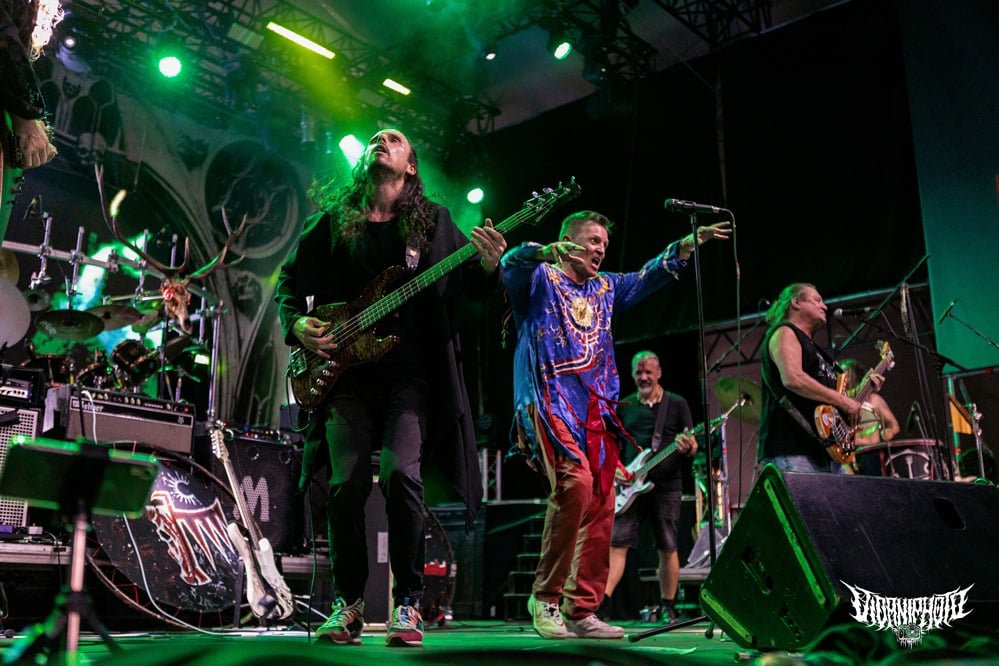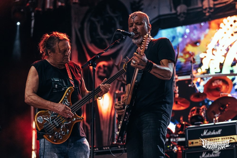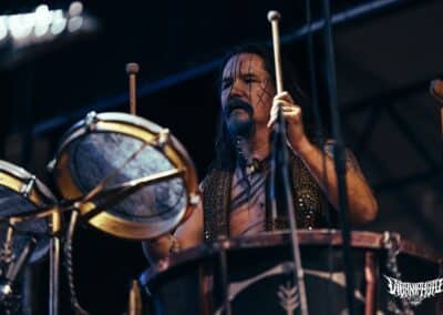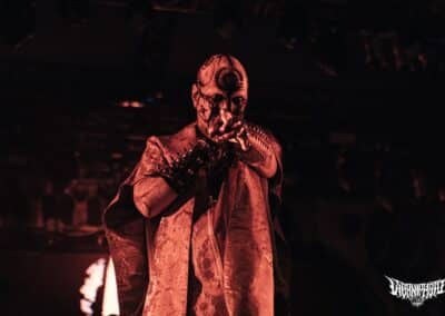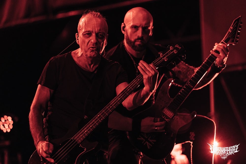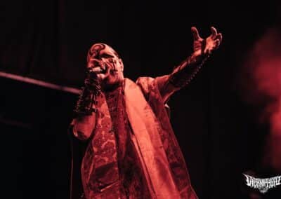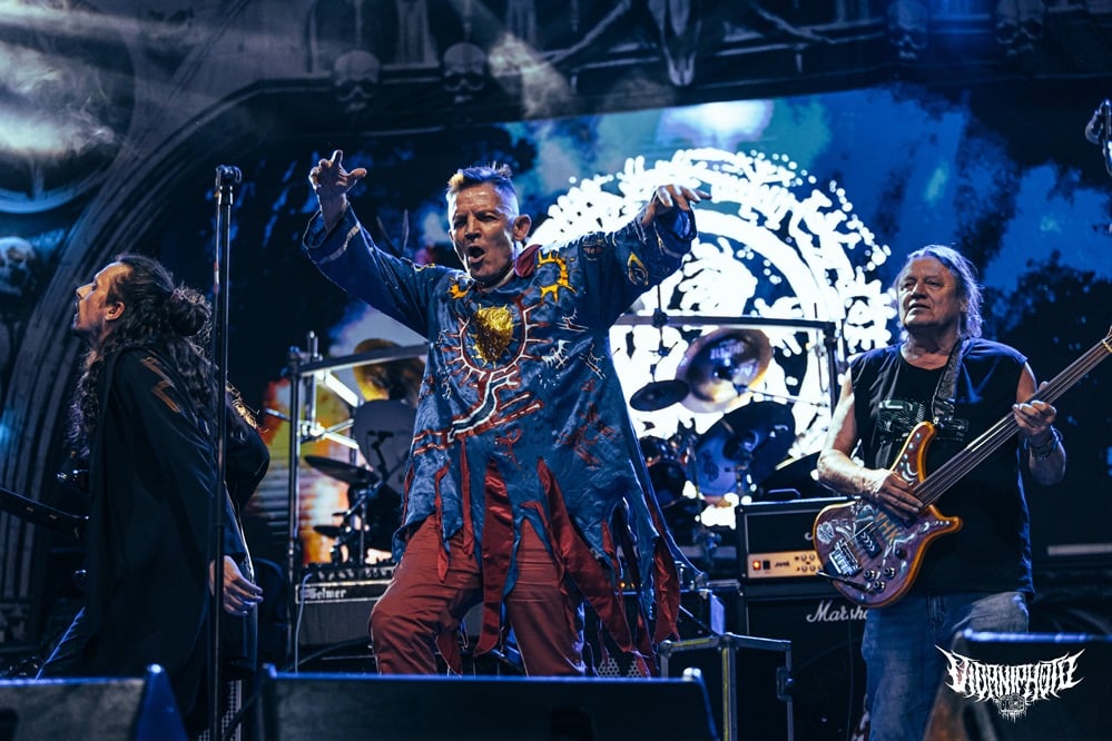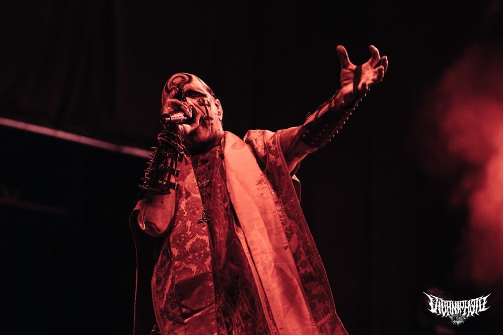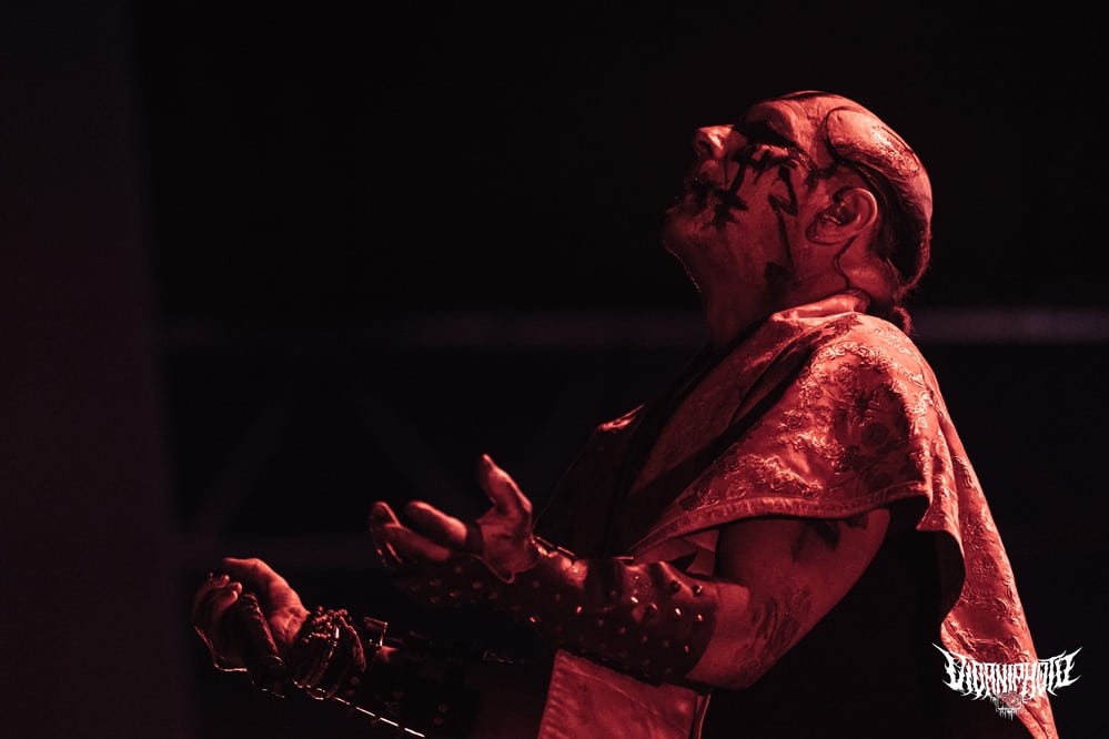 Az egész 40 éves Mayhem életmű terítékre került, rétegenként haladtunk belülre a szónikus test szövetében, befelé a végtelen Feketeség és Káosz felé. Az említésre hívatott stációkat a nagylemezek jelölték, a klimax számomra a Grand Declaration Of War LP és a Wolf’s Lair Abyss EP bizonyos dalai jelentették, melyeket kb. most hallottam élőben teljes valójában. A zenekar szinte tökéletesnek mondható hangzása is valahová erre a középmetszetre volt kalibrálva, így egyaránt ki tudott teljesedni a true old school éra és a modernebb / mai vonal is. Apropó hangzás: a Barba Negrában tartott koncertekről az utóbbi időben sok olyan beszámolót olvasni, hogy nem volt toppon a hangosítás. A Mayhem esetében ezt most abszolút cáfolom: bárhol álltam a nézőtérem, minimális eltéréssel egészen élvezhető, egy nordikus black metal bandához képest pedig szinte hibátlannak mondható hangképpel operáltak. Talán Teloch gitárja kissé a mixbe alá volt temetve, a bontásait, frazírjait nem lehetett annyira tisztán kivenni, ellenben Charles gitárja már igazi bárdként funkcionált. Necrobutcher basszusfutamai dühösen dörögtek végig kivehető módon, ezer közül is fel lehet ismerni azt a sajátos torzítást. Egyetlen negatívum ütötte meg a fülem: a számomra oly kedves Illuminate Eliminate megdermedt katarzisba nyúló zárását elmismásolták a gitárosok. Tizenegy színtérpont mínusz! Amúgy egyetlen üresjárat nem volt a műsorban, sőt orbitális hossza ellenére – 120 percről beszélek – sem tűnt unalmasnak vagy erőltetettnek. Végig odaszegezte a figyelmed és nem engedett belőle. Ahogy haladtunk visszafelé a Mayhem biográfiában, úgy ástunk egyre mélyebbre a black metal műfaj szinte már történelmi jelentőségű eseményei között. Az utolsó nagyobb lélegzetvételű blokk a De Mysteriis Dom Sathanas és a Deathcrush dalaiból állt össze, itt már teljes volt az eksztázis, nem volt visszaút. Csihar Attila láthatóan elemében volt, 666 fokos fordulatszámon pörgött, gesztikulált / delejezett és énekelt. Ördögi hangja átvágta és egyben uralta az atmoszférát. Rengeteget fejlődött az évek során, zseniálisan hozta Maniac torokmetsző vokáljait, de az operai hangtartományokban mozgó sikolyokat és elfojtott / elfúló hangokat is szinte lemezminőségben reprodukálta. Igazi frontember, sámáni őserő rejlik ereiben, hasonlóan a Grandpierre-hez. Mindketten kortalanok. Hellhammer-t is szeretném megemlíteni, ugyanis nélküle nincs Mayhem. Az évek múltával egyre brutálisabban és feszesebben dobol, itt is bizonyított, ember legyen a talpán, aki utána csinálja ezeket a blastbeateket és sűrű dobtémákat. Karakteres módon játszik, ő is már védjegy kategória, mint a Necrobutcher basszus sound, tőlük lesz igazán hiteles a csapat. Alatta szintén úgy szólalt meg a cájg, mint a lemezeken, iszonyatos / hidegrázós érzés volt a mostani éra és a DMDS klasszikusait élőben hallani. Az utolsó hajrában itt is megvoltak a régi zenész featuringek mint a bergeni koncerten, nekem viszont ennél a pontnál totális káoszba fulladt az este és súlyos audiovizuális kollázzsá változott… az utolsó kép, vagyis inkább mondat, ami megmaradt a fejemben az annyi volt, hogy: PURE… FUCKING… ARMAGEDDON !!!