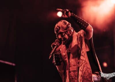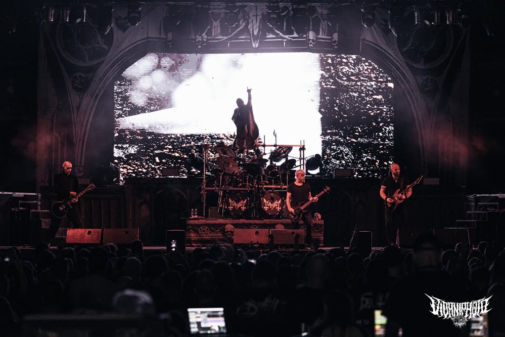 A Mayhem talán az egyik leghíresebb és egyben leghírhedtebb zenekar ezen a Földön, amellyel úton-útfélen, valamilyen formában találkozott a metal zenéken felnőtt / metal zenéket ismerő ember. Nem fogok a részletekbe mélyre belemenni, már megtették ezt előttem több ezren, kár pazarolni is erre a szót és az időt. Este 8 órára volt kiírva a kezdés, óriási leplek rejtették a színpadi installációkat, miközben sejtelmes dark ambient duruzsolt a háttérben, mely megadott egyfajta alaphangulatot. Általában véve a soundcheck már délutánra megvan ekkora bandák esetében, nem a produkció előtt közvetlen durrogtatják a patronokat és rakják össze a hangképet. Itt annyi volt, hogy mielőtt tényleg ránk szakadt volna az univerzum összes fájdalma és sötétsége teljes spektrumában, az ambient morajlások alatt finom dob / gitár / basszus csekkolás szólt közbe, hogy „oké, működik minden, mehet” ami arról tett tanúbizonyságot, hogy ez bizony brutálisan fog szólni. Az első hangnál lehetett érezni, hogy ez bizony adni fogja a flasht, a beszédes előszél jelet adott, aztán egyszer csak függöny fel, az intrónál pedig besétáltak a zenészek, legvégén Csihar Attila énekessel.