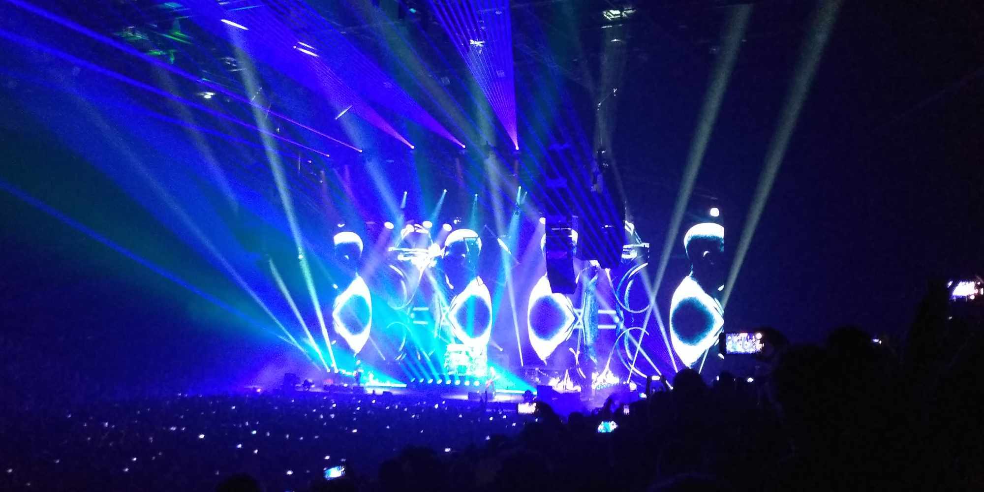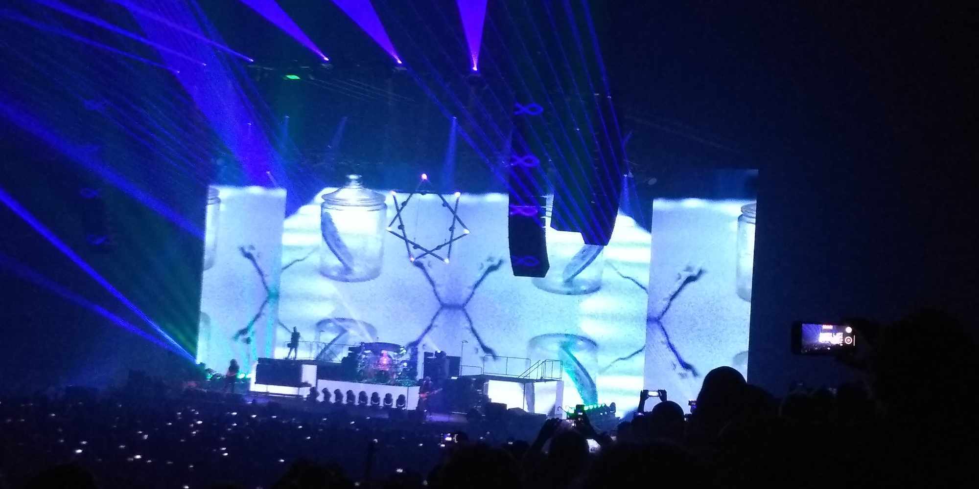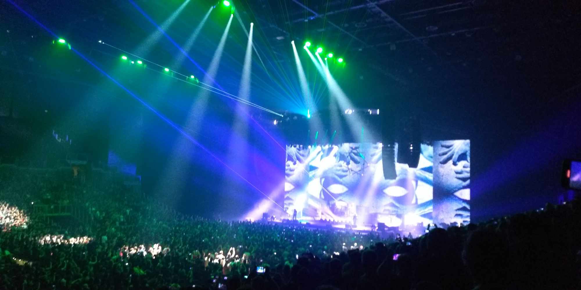 A TOOL-nál nincs középút: vagy szereted, amit csinálnak, vagy ki nem állhatod őket. 2022-ben volt az első találkozásom velük, helyszín ugyanez, annyi különbséggel, hogy a fentebb említett Brass Against muzsikált, mint előzenekar. Most is kb. ugyanaz a színpadkép fogadott: elől a húros szekció, Justin Chancellor bőgös és Adam Jones gitáros, hátul egy káprázatosan megvilágított magas emelvényen dobosuk, Danny Carey. Énekesük, Maynard James Keenan, égnek meredő belőtt séróval Puscifer pólóban a hátulsó emelvények hol az egyik hol a másik sarkán bukkant fel. Többnyire csak a sziluettjét lehetett látni, amint beleolvad a hatalmas vizuálba / kivetítőbe / animációkba. Fejük felett az elmaradhatatlan heptagram csillaggal. Bődületes, vehemens erővel szóltak. Kegyetlen hangos és letaglózó erejű volt a sound, sokkal brutálabb módon rezgett / remegett minden, mint 2022-ben. Az egyetlen negatívuma ennek, hogy ugye ez egy sportcsarnok – középpen a színpaddal szemben lévő szektoroknál visszaverődőtt és csattogott a hang, mely mondjuk, egy meccs vagy bármilyen más rendezvény alkalmával nem annyira zavaró. Koncert szempontjából akusztikai diffúzorokkal lehetne orvosolni ezt a problémát – mindenesetre én valahol középtájnál bentebb voltam oldalt, ott nem volt annyira vészes.