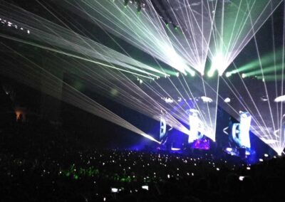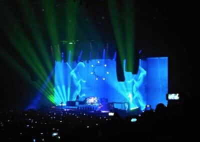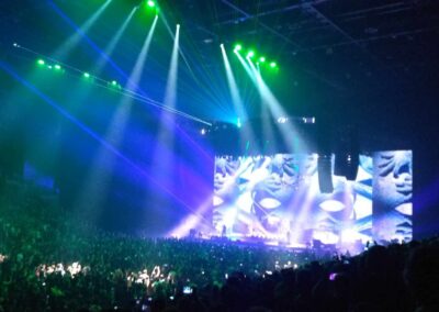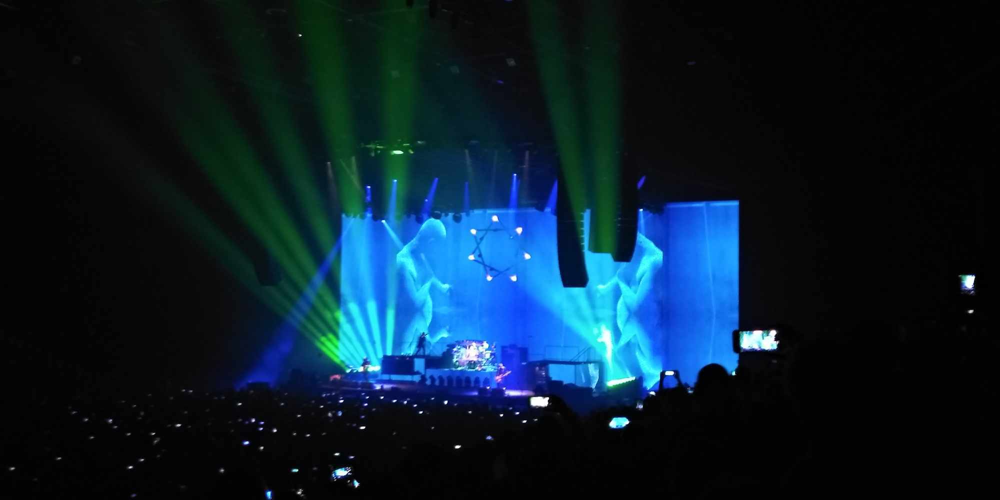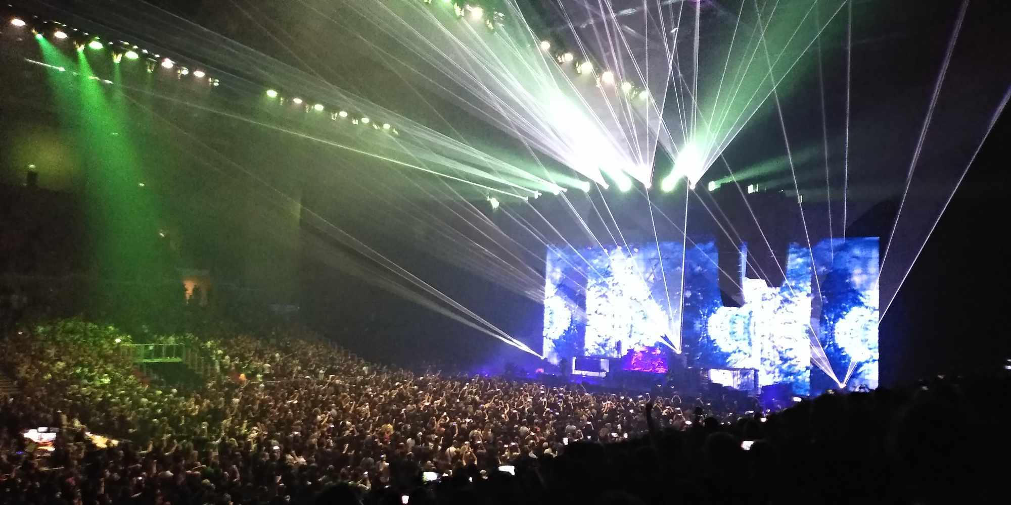 A TOOL-nál nincs középút: vagy szereted, amit csinálnak, vagy ki nem állhatod őket. 2022-ben volt az első találkozásom velük, helyszín ugyanez, annyi különbséggel, hogy a fentebb említett Brass Against muzsikált, mint előzenekar. Most is kb. ugyanaz a színpadkép fogadott: elől a húros szekció, Justin Chancellor bőgös és Adam Jones gitáros, hátul egy káprázatosan megvilágított magas emelvényen dobosuk, Danny Carey. Énekesük, Maynard James Keenan, égnek meredő belőtt séróval Puscifer pólóban a hátulsó emelvények hol az egyik hol a másik sarkán bukkant fel. Többnyire csak a sziluettjét lehetett látni, amint beleolvad a hatalmas vizuálba / kivetítőbe / animációkba. Fejük felett az elmaradhatatlan heptagram csillaggal. Bődületes, vehemens erővel szóltak. Kegyetlen hangos és letaglózó erejű volt a sound, sokkal brutálabb módon rezgett / remegett minden, mint 2022-ben. Az egyetlen negatívuma ennek, hogy ugye ez egy sportcsarnok – középpen a színpaddal szemben lévő szektoroknál visszaverődőtt és csattogott a hang, mely mondjuk, egy meccs vagy bármilyen más rendezvény alkalmával nem annyira zavaró. Koncert szempontjából akusztikai diffúzorokkal lehetne orvosolni ezt a problémát – mindenesetre én valahol középtájnál bentebb voltam oldalt, ott nem volt annyira vészes.