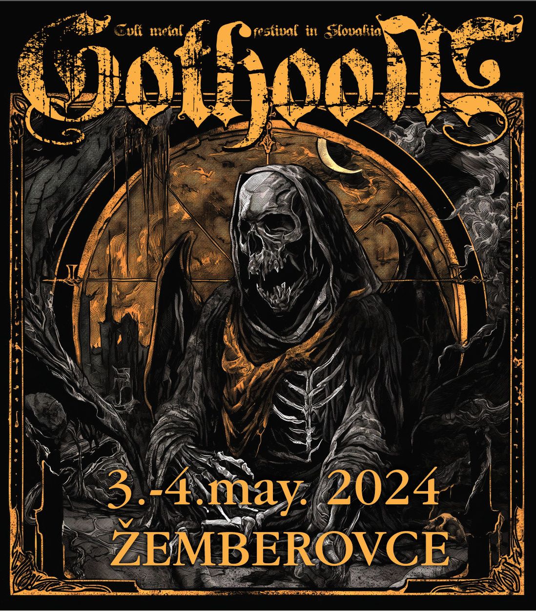 Tehát a 2023-as és 2024-es Gothoom-nak a žemberovcei kultúrház adott helyet – kicsi, családias esemény, a megszokott professzionális szervezéssel. A kultúrház fő csarnoka volt maga a koncerthelyszín egy mellig érő színpaddal, hátul három különböző merch, a bejáratnál a zenekarok merch-ei, az épület körül sörsátrak felállítva a már megszokott sátrazási lehetőségekkel – tehát Žemberovce kellős közepén, a kultúrház melletti gyepen töltheted az éjszakát, ha éppen sátorozni támadt kedved. A zsetonos rendszer megmaradt – egy euro egy zseton a jelenlegi árfolyam szerint –, a csapolt sör (10 és 12 Balling-fokos Radegast) típustól függően két és fél vagy három zseton, van továbbá gyümölcsös Birell két zseton árban. Az eddig megszokott liberalizmus továbbra is jellemző a fesztiválra: én például egy teljes hátizsáknyi piával jöttem-mentem – ennek java része ajándék volt –, és a hátizsák oldalából kilógó pálinkásüveg sem zavart különösebben senkit. A létszám első ránézésre valahol 300 és 500 fő között mozgott – közelebb a 300-hoz, mint az 500-hoz –, és a szokásos nyugodt légkör mellett nagyjából öt biztonsági őr unatkozott, rehabilitációját töltve a számukra teljesen eseménytelen fesztiválon.