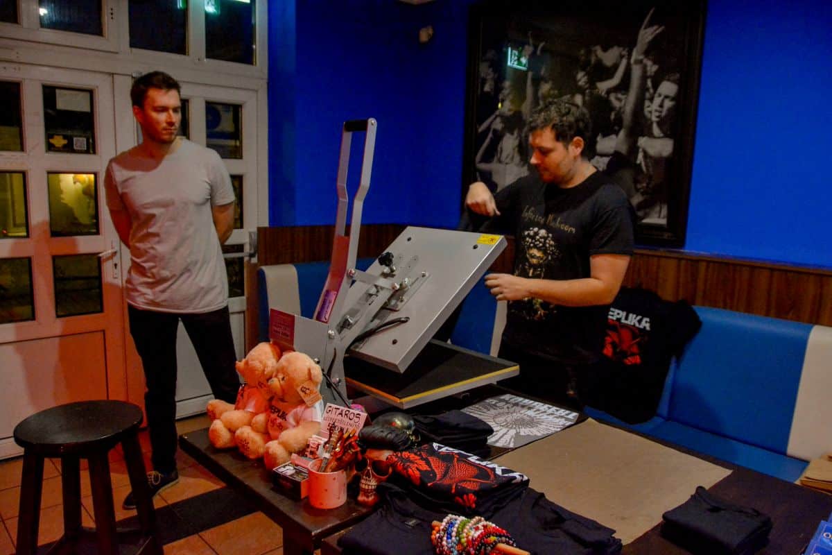 Öt óra környékére már felpörögtek az események; először is megérkezett a helyszínre a mörcs, de nem abban a formában, ahogyan azt elsőre gondolnátok. A debreceni Pakk Ajándék az a kis cég, amelyik előzetesen is – és erre az eseményre is – Replika-pólók gyártásával készült. A legnagyobb meglepetésemre hiányoztak az ilyenkor szokásos nagy kartonládák meg a bennük lévő színes pólók, csak egyet-egyet láttam elvétve – meg ezentúl egy csomó olyan dolgot is, amit nem tudtam mire vélni: bögréket, meg ehhez hasonlókat. A mörcspult jelentős hányadát egy nagy gép foglalta el, és innen már némi segítséggel össze tudtam kötni a pontokat: a mörcs itt helyben fog készülni: ha valakinek egy adott mintájú Replika-pólóra van szüksége, akkor a szakemberek itt helyben el is készítik számára a kívánt példányt. A bögréket, a kulcstartót, valamint az ajándék macit is jól láttam: a Pakk készült egy pár szó szerinti ajándéktárggyal az eseményre, amik majd a közönségtalálkozó során kerülnek kiosztásra – a közönség részére. Ez teljesen váratlan gesztus, hasonlót még nem is láttam – akár a kivitelezés, akár az ajándékos részét tekintve –, úgyhogy izgatottan vártam a fogadtatást.