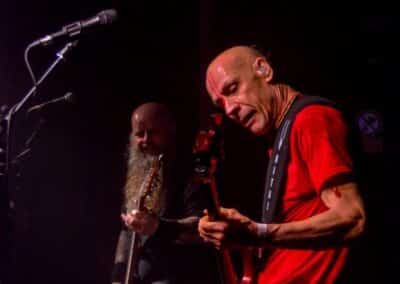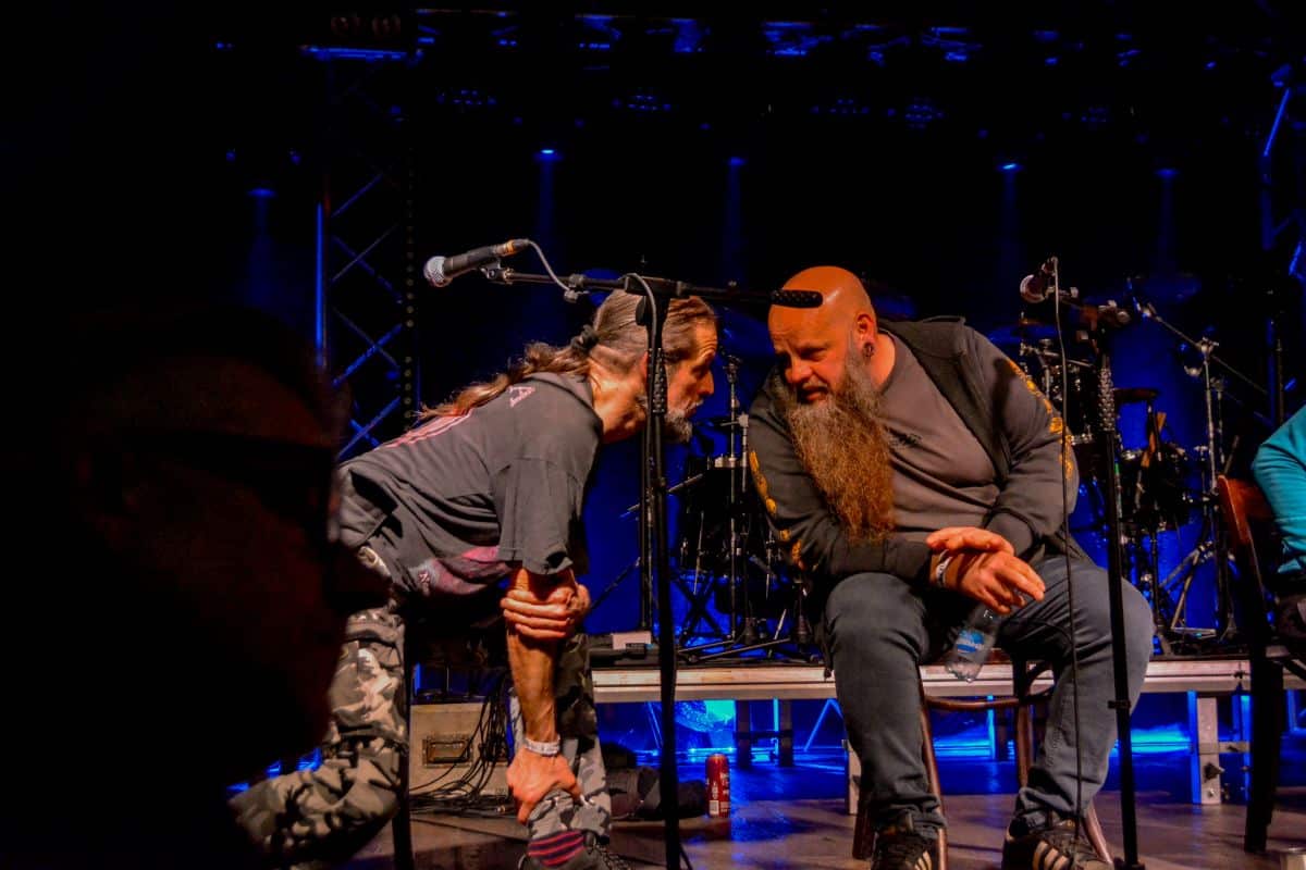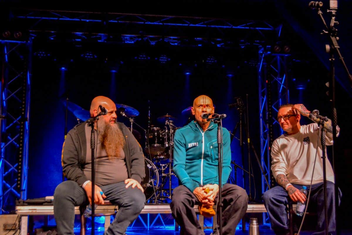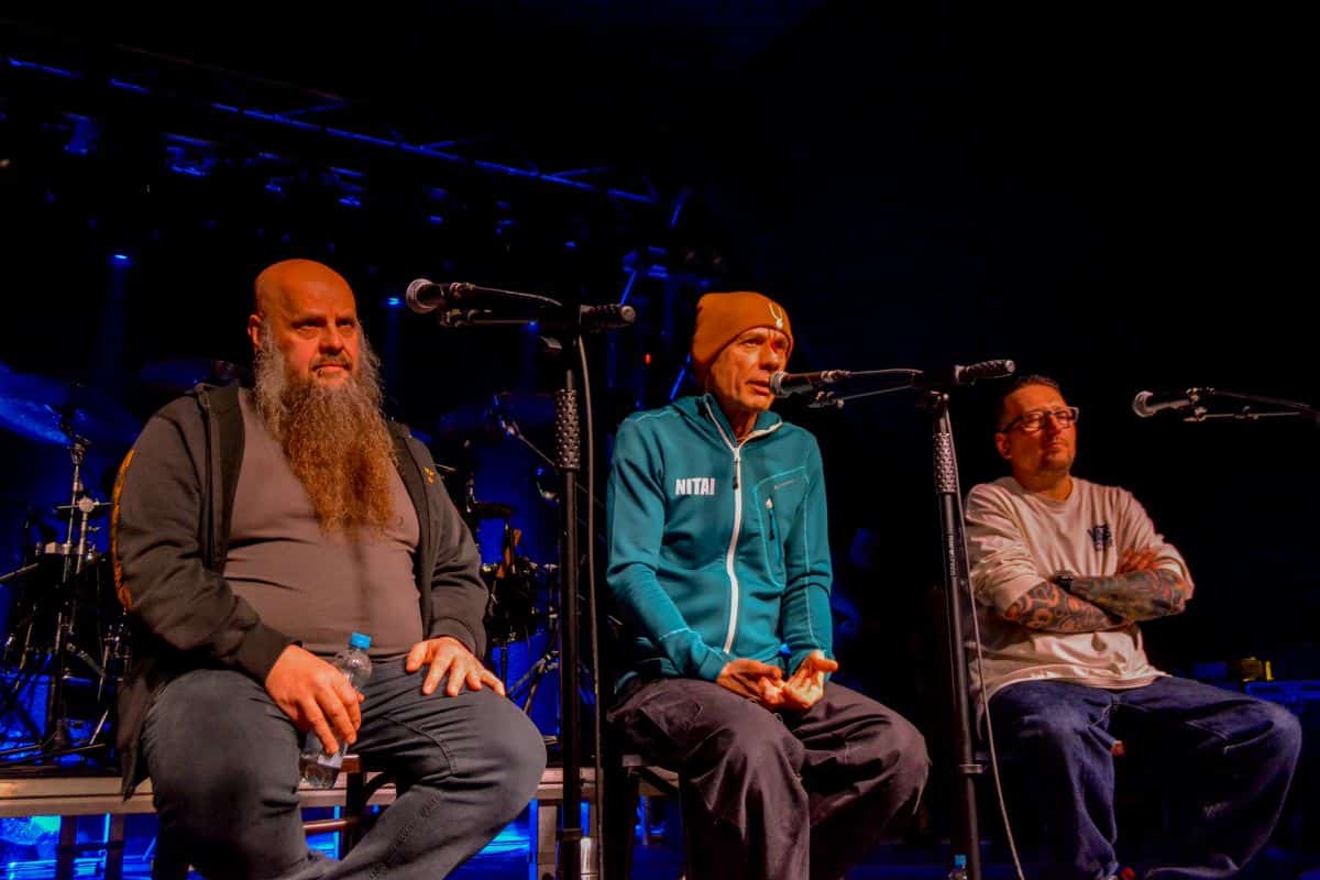 Aztán fél hét után pár perccel beindult a buli. Először is egy bő egyórás közönségtalálkozóval kezdtünk: itt megvolt a koncepció, hogy nagyjából mit és hogyan fogunk-akarunk végigbeszélni, és azt hiszem, hogy ezt sikerült is tartani. Az alapvető elképzelés az volt, hogy Csató a kezdetektől napjainkig végigmeséli a zenekar történetét és szót ejt arról is, hogy nagyjából mi és hogyan befolyásolta a különböző albumok stílusát és megjelenését, amire lehet majd reagálni, sőt, adott célkérdések megválaszolását kisebb tárgyjutalom követte. Itt ne egy felolvasóestre vagy kiselőadásra gondolj, hanem ez az egész tényleg egy könnyed stílusú párbeszéd volt – ahol persze javarészt Csatónál volt a labda. Az egész légkört tekintve egy jelenet álljon itt példának: Falat említette, hogy „… és akkor ez volt az a pillanat, amikor megkeresett a Béla”. Erre persze mindenki értetlenkedve nézett, hogy ki is lehet ez a Béla, senki sem hallott róla, mire Csató nekikezdett: „…igen, számos néven futok a zenekarban meg máshol, a Béla is ilyen, ez meg egy másik nevem…” – mutatott a Nitai-feliratra a decathlonos aláöltözetén. Erre beordítás a közönség soraiból: „Hogy mi…? Quechua?”