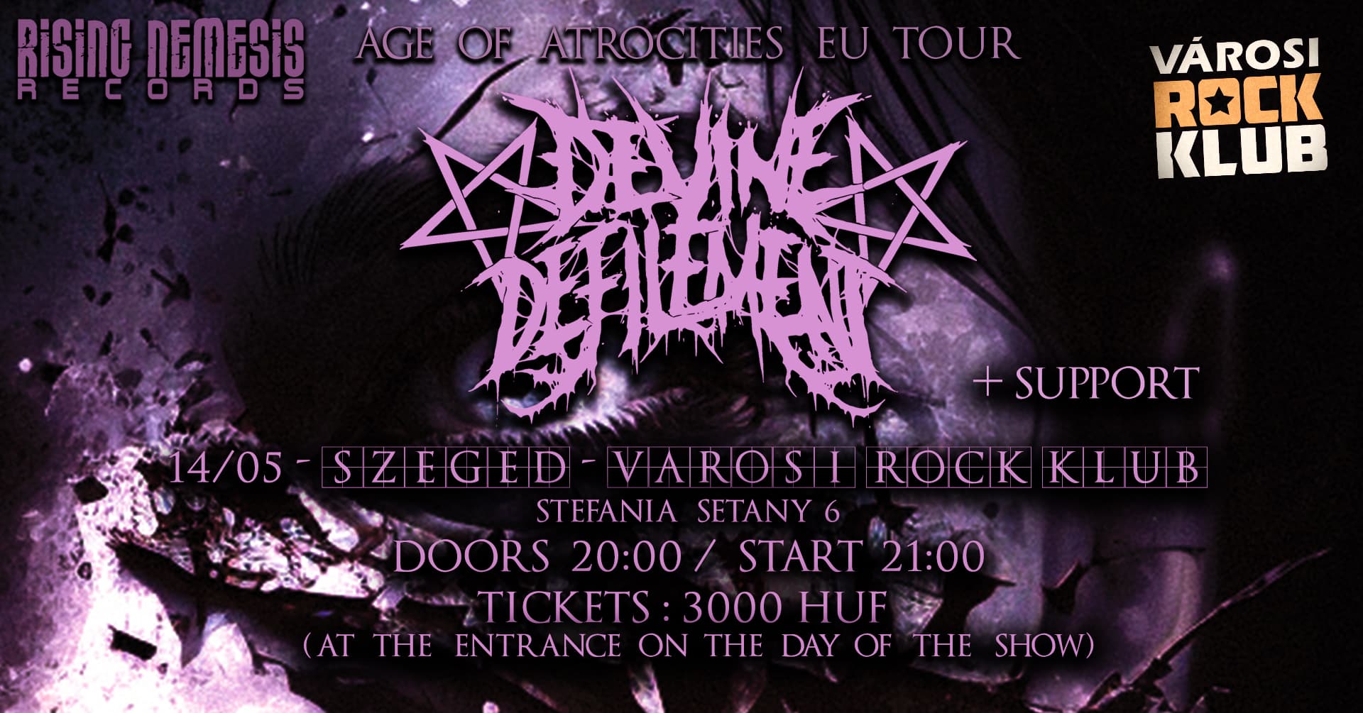 Igazi death metal / deathcore csemegét kínálunk fel a műfaj szerelmeseinek: az izlandi Devine Defilement látogat el hozzánk egy hatalmas zúzásra Szeged Városi Rock Klubjába, május 14-én.