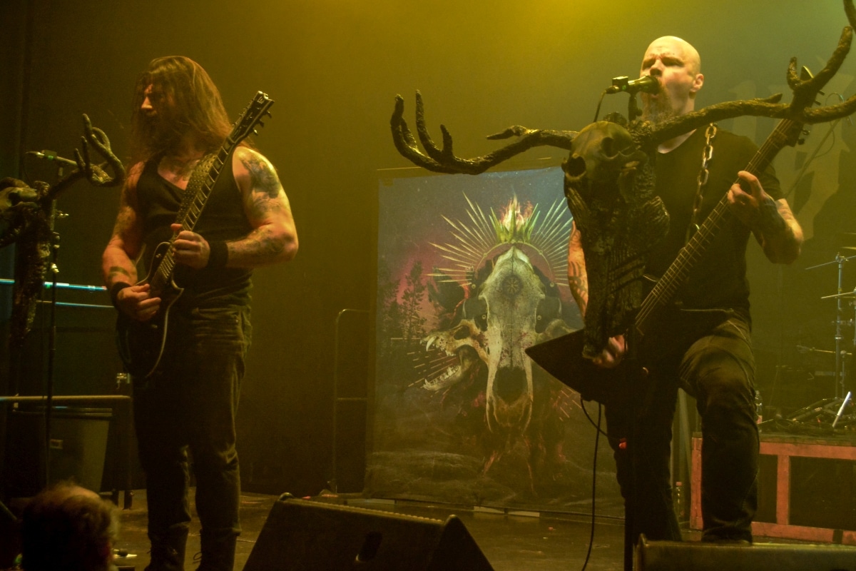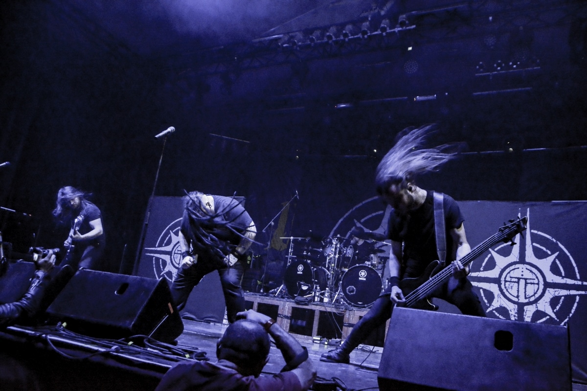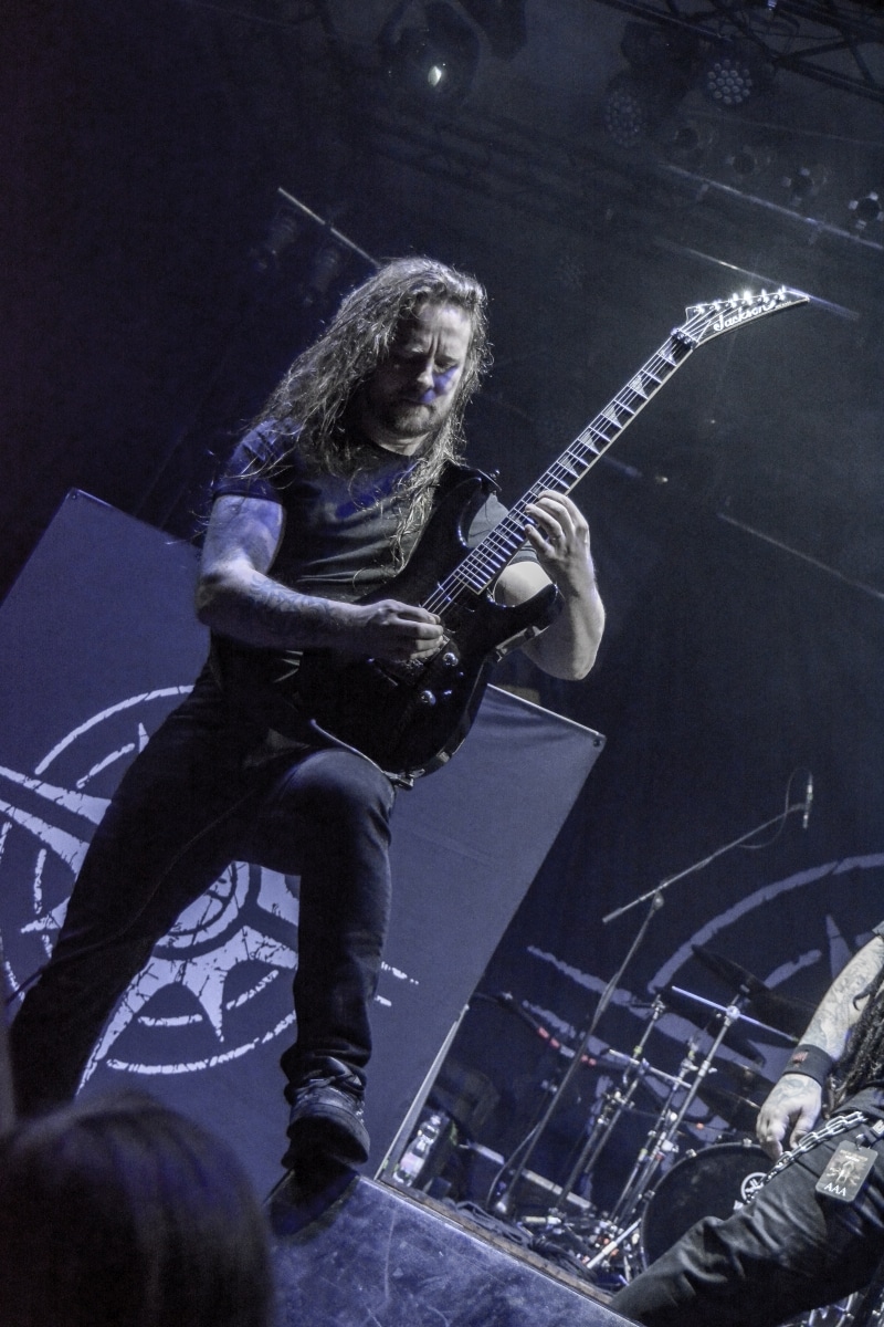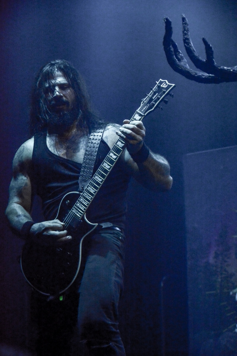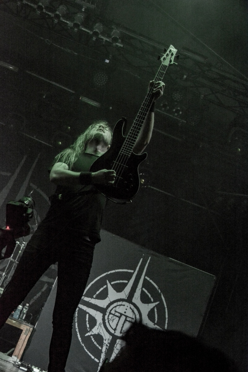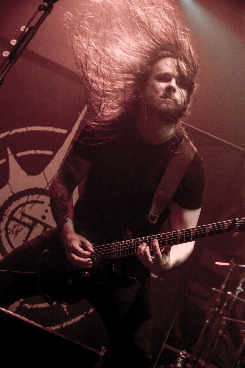 Tuomas kiszállt a dobszett mögül, nyakába akasztott a szokásos hajóláncon lógó gitárját, majd gondolom mindenki legurított egy ásványvizet vagy energiaitalt – nem nagyon volt ott sörözés –, és utána a húrok közé csapott a Wolfheart. Huszonnégy órával a kezdés előtt én a nyakamat tettem volna rá hogy az idén kijött Iku-Turso-val kezdenek, teljesen adta magát a dolog, de nem, nem így történt. Tuomas is elmesélte – meg a fellépésen is elhangzott –, hogy lesérült a zenekar szokásos dobosa (Joonas Kauppinen), úgyhogy most beugró dobossal (figyelem: Juuso Raatikainen a Swallow the Sun-ból) kellett hogy jöjjenek turnézni. Nem tudom, hogy Juuso repertoárja volt-e az oka, de – azzal együtt, hogy a King of The North turnét élvezhettük, ami értelemszerűen a hasonló nevű albumra volt felhúzva – a régebbi anyagok dominálták a setlist-et (négy dal a Winterborn-ról, és csak kettő az új anyagról: Skyforger, Ghost of Karelia, Zero Gravity, The King, Boneyard, Routa Pt. 2, Strength and Valor, Aeon of Cold,The Hammer, The Hunt). Egy profi zenekar lendületes show-ját láthattuk, amikor például Tuomas sikeresen letépte a bariton gitár legmélyebb húrját: a gépezet nem állt meg, a basszusgitáros Lauri Silvonen szórakoztatta és kicsit tornáztattam közönséget, ameddig Tuomas húrt cserélt. Erről később röhögve számolt be, mondván, hogy sikerült a fellépés közbeni húrcsere világrekordját beállítania az este során. Élmény volt hallani a nagy klasszikusokat, a lendületes tételeket; mondjuk a turné névadó albumáról akár több dalt is el tudtam volna képzelni aznap estére, de igazából ez fellépés és nem kívánságműsor. És hogy ne csak a fülnek, hanem a szemnek is legyen valami csemege, mindenképpen meg kell említeni a Wolfheart nem finn, hanem görög szólógitárosát, Vagelis-t, aki Athénból csatlakozott a turnézó társasághoz. Ez a kigyúrt, minimum 120 kilós ember – a Rotting Christ-ból basszusgitárral a kezében lehet ismerős – eszméletlenül precízen és finoman, apró, de nagyon dinamikus mozdulatokkal játszott majdnem nyolcvan percen keresztül; eszméletlen csuklók és sok-sok bemelegítés kell ahhoz, hogy valaki ilyen szinten tudjon zenélni, és egészen elképesztő volt látni és hallani azt a teljesítményt, amit Vagelis szerda este a Barbara Negra színpadán bemutatott.
