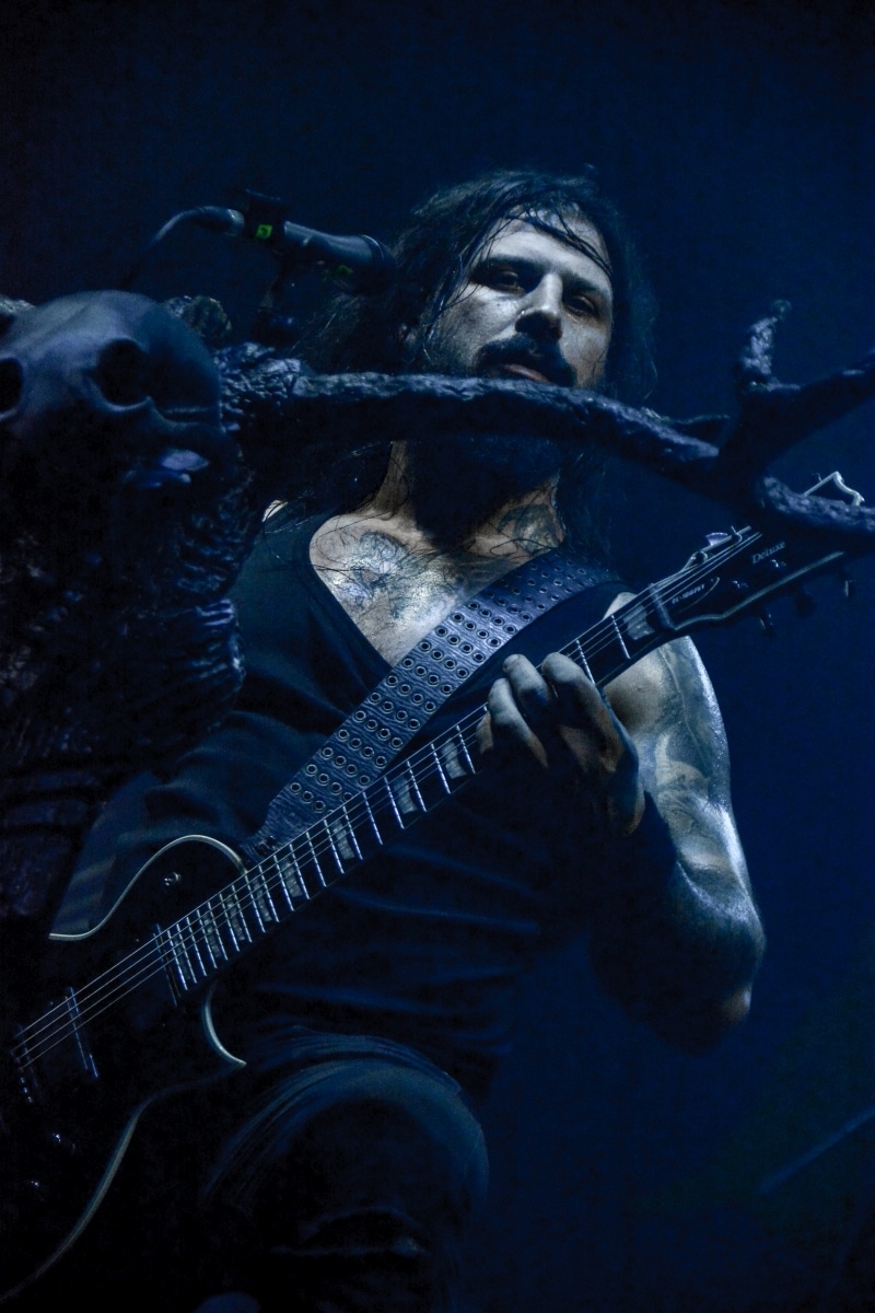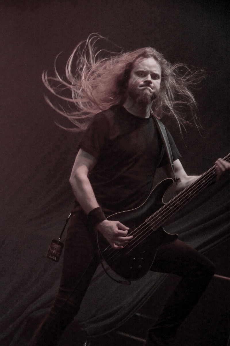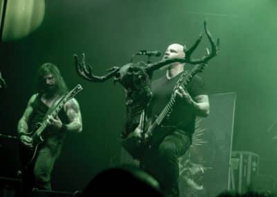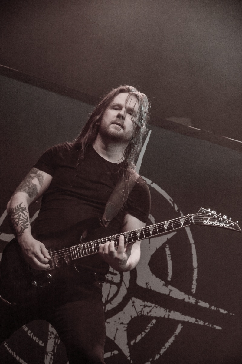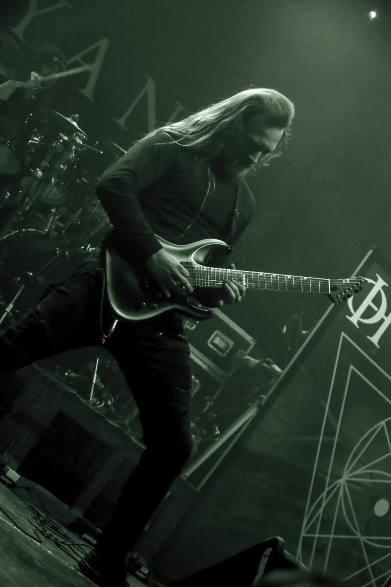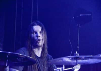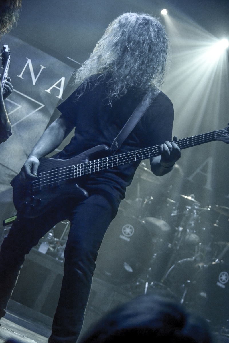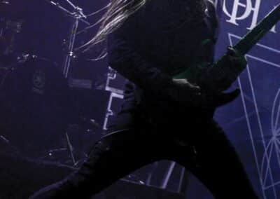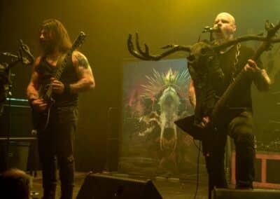 Tuomas kiszállt a dobszett mögül, nyakába akasztott a szokásos hajóláncon lógó gitárját, majd gondolom mindenki legurított egy ásványvizet vagy energiaitalt – nem nagyon volt ott sörözés –, és utána a húrok közé csapott a Wolfheart. Huszonnégy órával a kezdés előtt én a nyakamat tettem volna rá hogy az idén kijött Iku-Turso-val kezdenek, teljesen adta magát a dolog, de nem, nem így történt. Tuomas is elmesélte – meg a fellépésen is elhangzott –, hogy lesérült a zenekar szokásos dobosa (Joonas Kauppinen), úgyhogy most beugró dobossal (figyelem: Juuso Raatikainen a Swallow the Sun-ból) kellett hogy jöjjenek turnézni. Nem tudom, hogy Juuso repertoárja volt-e az oka, de – azzal együtt, hogy a King of The North turnét élvezhettük, ami értelemszerűen a hasonló nevű albumra volt felhúzva – a régebbi anyagok dominálták a setlist-et (négy dal a Winterborn-ról, és csak kettő az új anyagról: Skyforger, Ghost of Karelia, Zero Gravity, The King, Boneyard, Routa Pt. 2, Strength and Valor, Aeon of Cold,The Hammer, The Hunt). Egy profi zenekar lendületes show-ját láthattuk, amikor például Tuomas sikeresen letépte a bariton gitár legmélyebb húrját: a gépezet nem állt meg, a basszusgitáros Lauri Silvonen szórakoztatta és kicsit tornáztattam közönséget, ameddig Tuomas húrt cserélt. Erről később röhögve számolt be, mondván, hogy sikerült a fellépés közbeni húrcsere világrekordját beállítania az este során. Élmény volt hallani a nagy klasszikusokat, a lendületes tételeket; mondjuk a turné névadó albumáról akár több dalt is el tudtam volna képzelni aznap estére, de igazából ez fellépés és nem kívánságműsor. És hogy ne csak a fülnek, hanem a szemnek is legyen valami csemege, mindenképpen meg kell említeni a Wolfheart nem finn, hanem görög szólógitárosát, Vagelis-t, aki Athénból csatlakozott a turnézó társasághoz. Ez a kigyúrt, minimum 120 kilós ember – a Rotting Christ-ból basszusgitárral a kezében lehet ismerős – eszméletlenül precízen és finoman, apró, de nagyon dinamikus mozdulatokkal játszott majdnem nyolcvan percen keresztül; eszméletlen csuklók és sok-sok bemelegítés kell ahhoz, hogy valaki ilyen szinten tudjon zenélni, és egészen elképesztő volt látni és hallani azt a teljesítményt, amit Vagelis szerda este a Barbara Negra színpadán bemutatott.