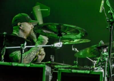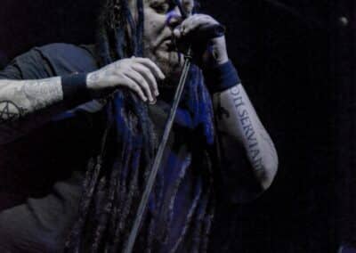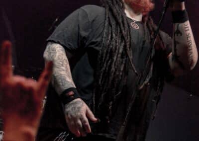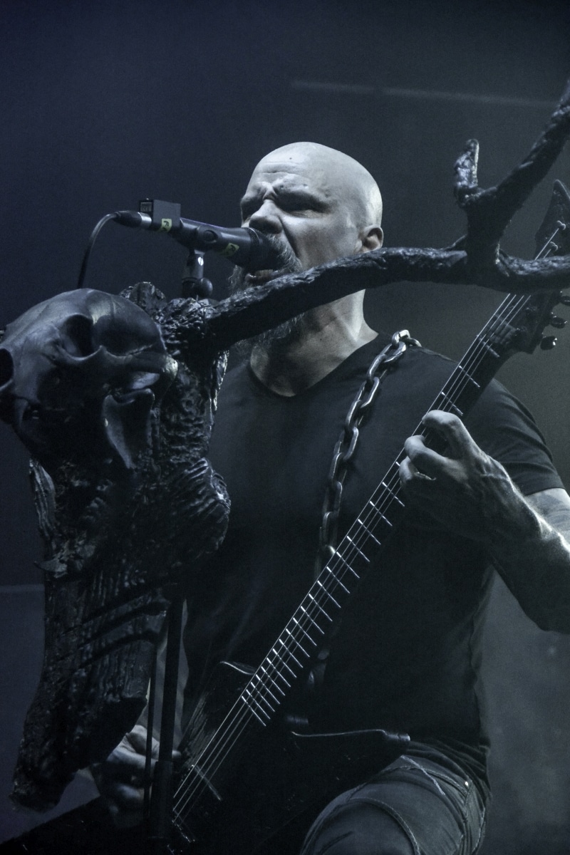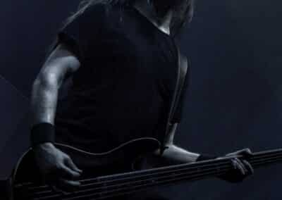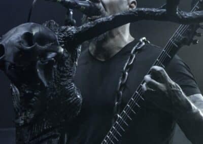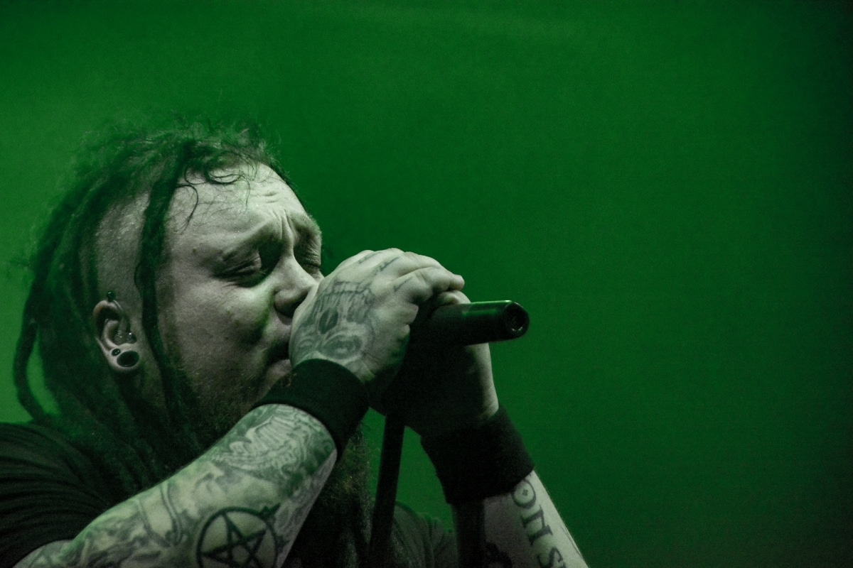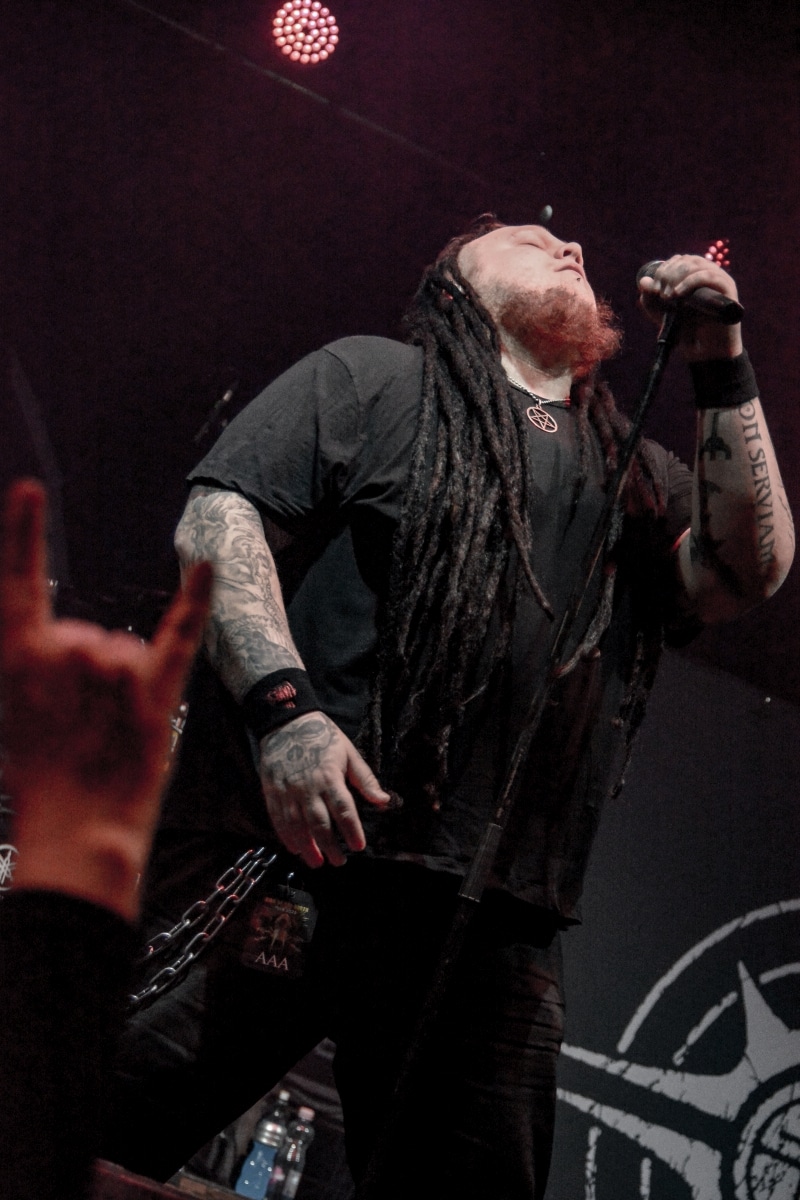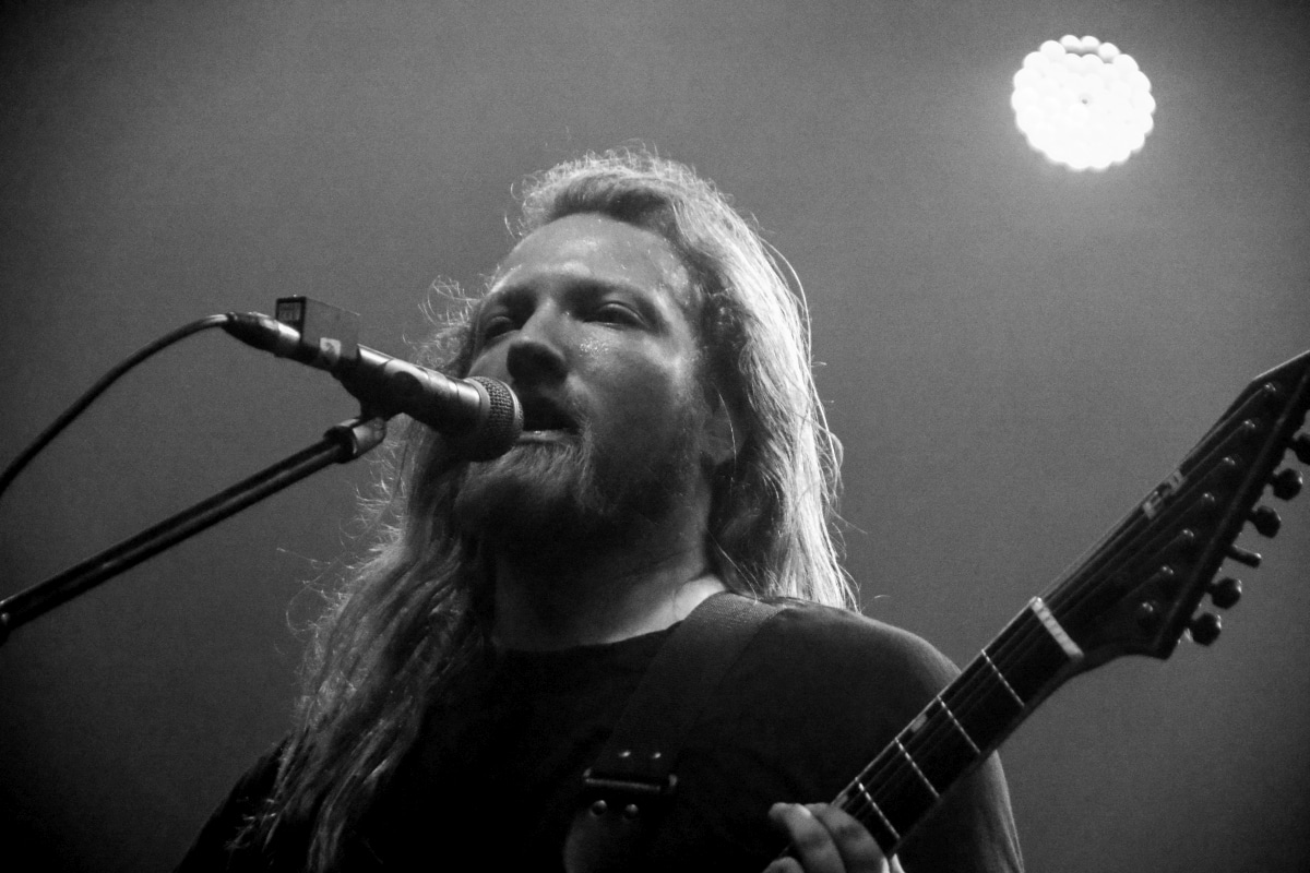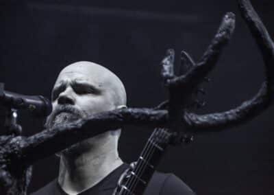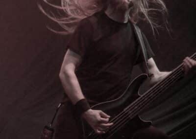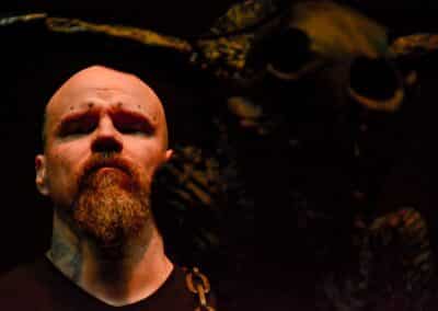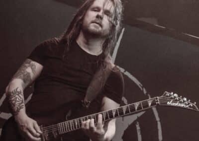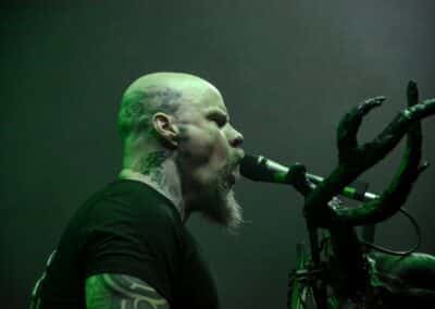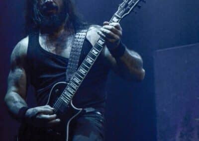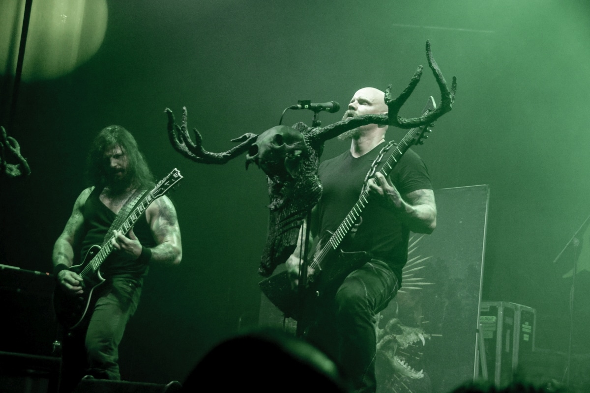 Tuomas kiszállt a dobszett mögül, nyakába akasztott a szokásos hajóláncon lógó gitárját, majd gondolom mindenki legurított egy ásványvizet vagy energiaitalt – nem nagyon volt ott sörözés –, és utána a húrok közé csapott a Wolfheart. Huszonnégy órával a kezdés előtt én a nyakamat tettem volna rá hogy az idén kijött Iku-Turso-val kezdenek, teljesen adta magát a dolog, de nem, nem így történt. Tuomas is elmesélte – meg a fellépésen is elhangzott –, hogy lesérült a zenekar szokásos dobosa (Joonas Kauppinen), úgyhogy most beugró dobossal (figyelem: Juuso Raatikainen a Swallow the Sun-ból) kellett hogy jöjjenek turnézni. Nem tudom, hogy Juuso repertoárja volt-e az oka, de – azzal együtt, hogy a King of The North turnét élvezhettük, ami értelemszerűen a hasonló nevű albumra volt felhúzva – a régebbi anyagok dominálták a setlist-et (négy dal a Winterborn-ról, és csak kettő az új anyagról: Skyforger, Ghost of Karelia, Zero Gravity, The King, Boneyard, Routa Pt. 2, Strength and Valor, Aeon of Cold,The Hammer, The Hunt). Egy profi zenekar lendületes show-ját láthattuk, amikor például Tuomas sikeresen letépte a bariton gitár legmélyebb húrját: a gépezet nem állt meg, a basszusgitáros Lauri Silvonen szórakoztatta és kicsit tornáztattam közönséget, ameddig Tuomas húrt cserélt. Erről később röhögve számolt be, mondván, hogy sikerült a fellépés közbeni húrcsere világrekordját beállítania az este során. Élmény volt hallani a nagy klasszikusokat, a lendületes tételeket; mondjuk a turné névadó albumáról akár több dalt is el tudtam volna képzelni aznap estére, de igazából ez fellépés és nem kívánságműsor. És hogy ne csak a fülnek, hanem a szemnek is legyen valami csemege, mindenképpen meg kell említeni a Wolfheart nem finn, hanem görög szólógitárosát, Vagelis-t, aki Athénból csatlakozott a turnézó társasághoz. Ez a kigyúrt, minimum 120 kilós ember – a Rotting Christ-ból basszusgitárral a kezében lehet ismerős – eszméletlenül precízen és finoman, apró, de nagyon dinamikus mozdulatokkal játszott majdnem nyolcvan percen keresztül; eszméletlen csuklók és sok-sok bemelegítés kell ahhoz, hogy valaki ilyen szinten tudjon zenélni, és egészen elképesztő volt látni és hallani azt a teljesítményt, amit Vagelis szerda este a Barbara Negra színpadán bemutatott.