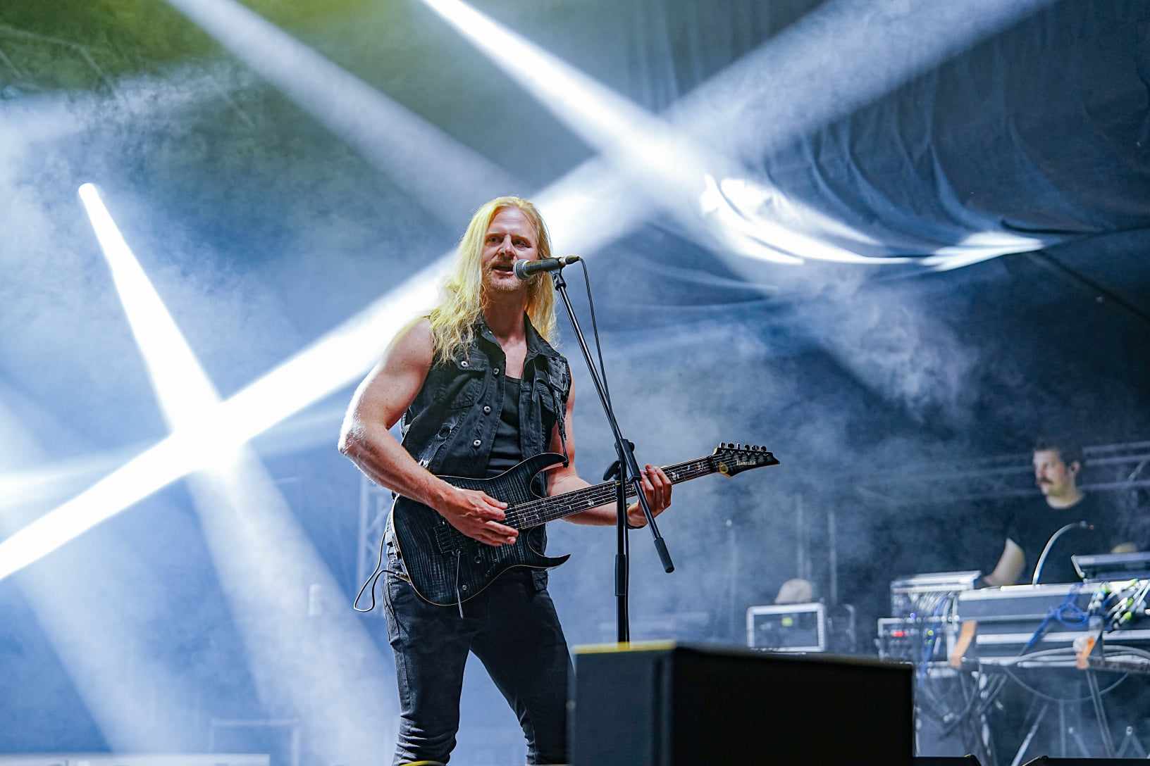 Na de most térjünk rá a koncertre. Nils több korábbi interjúban nyilatkozta, hogy ők mennyire jól szólnak, milyen hatalmas bulikat tolnak élőben. Én ebben nem is kételkedtem, így ezekkel az előítéletekkel álltam be nagyjából a harmadik sorba a színpad elé. Nos, meg kell mondanom, hogy elég hamar kiderült, hogy ha általában tényleg az énekes által elmondottaknak megfelelően szólnak, ebből itt sajnos nem sok mutatkozott meg. Nem tudom, kinek a hibája, a színpadé, a hangosé, a melegé (?!), de a frekvenciák arányai jó sok kívánnivalót hagytak maguk után. A lábdob, a pergő és a basszus szinte zavaróan hangos volt, míg az ének alig hallható. Utóbbi pedig rendkívül sajnálatos, ugyanis Nils napjaink egyik legkiemelkedőbb énekese a műfajban.