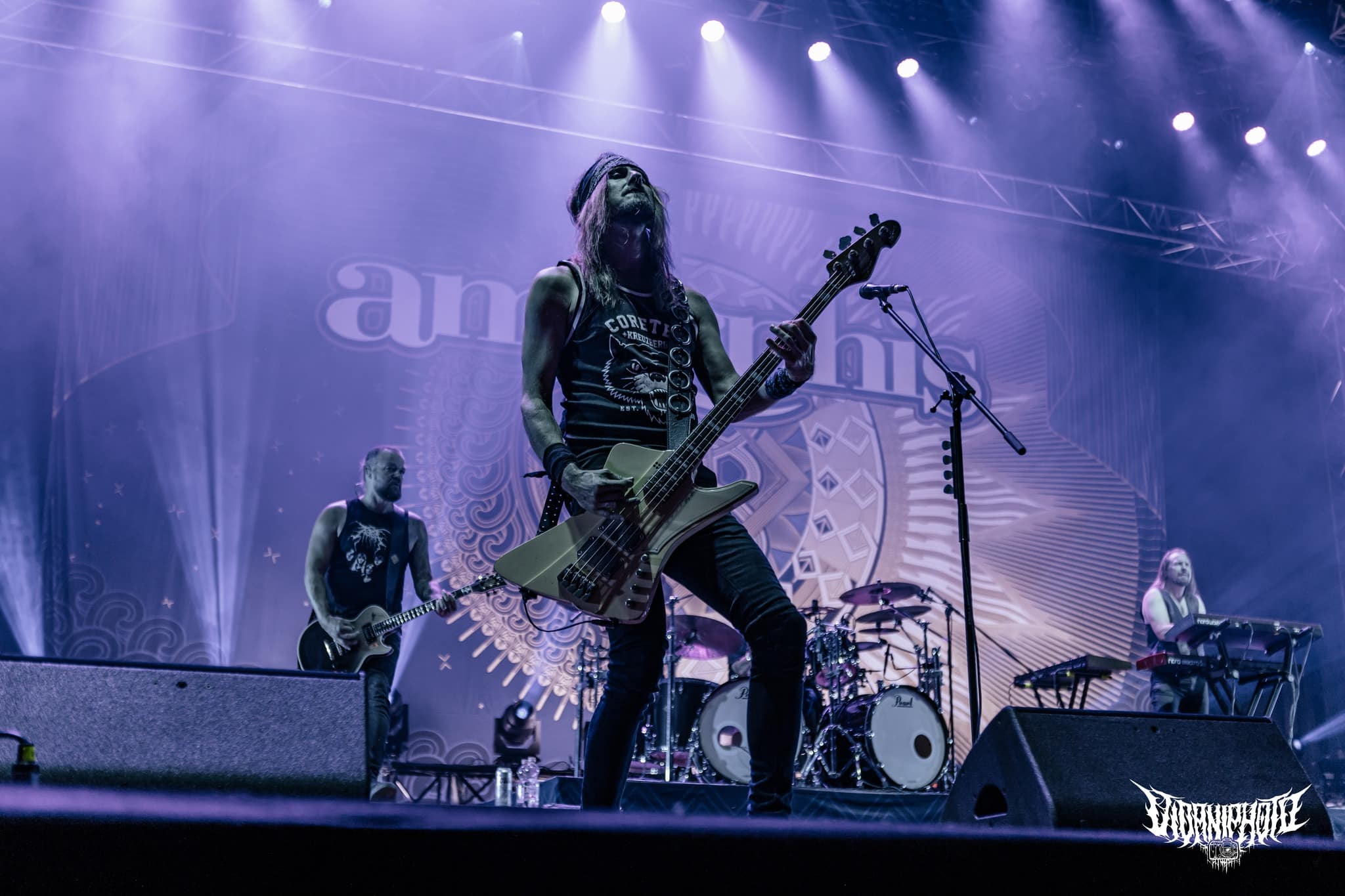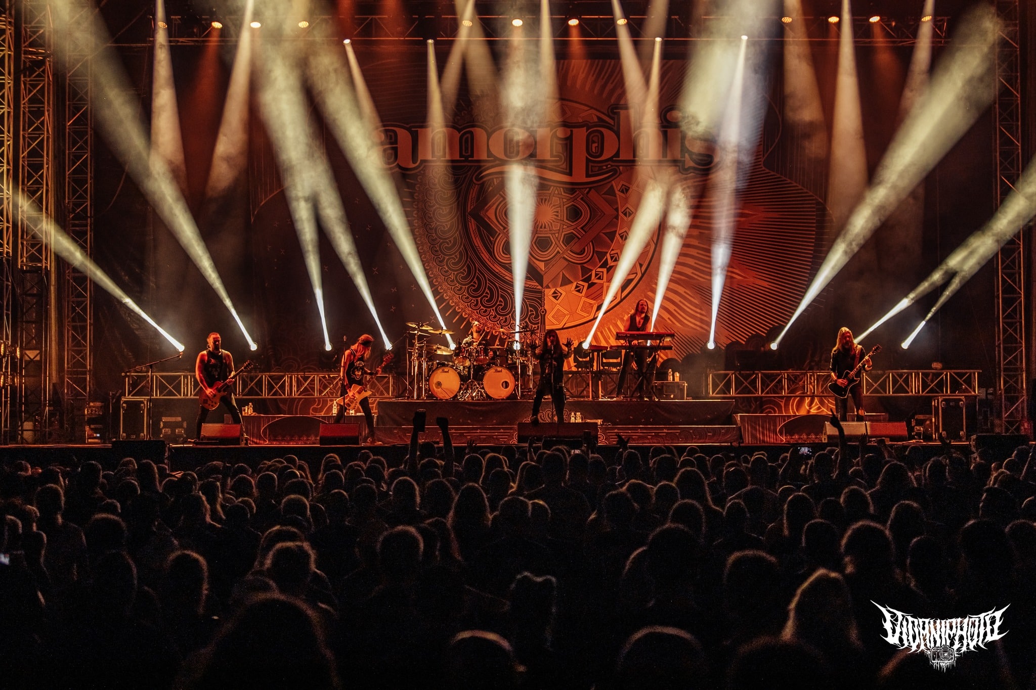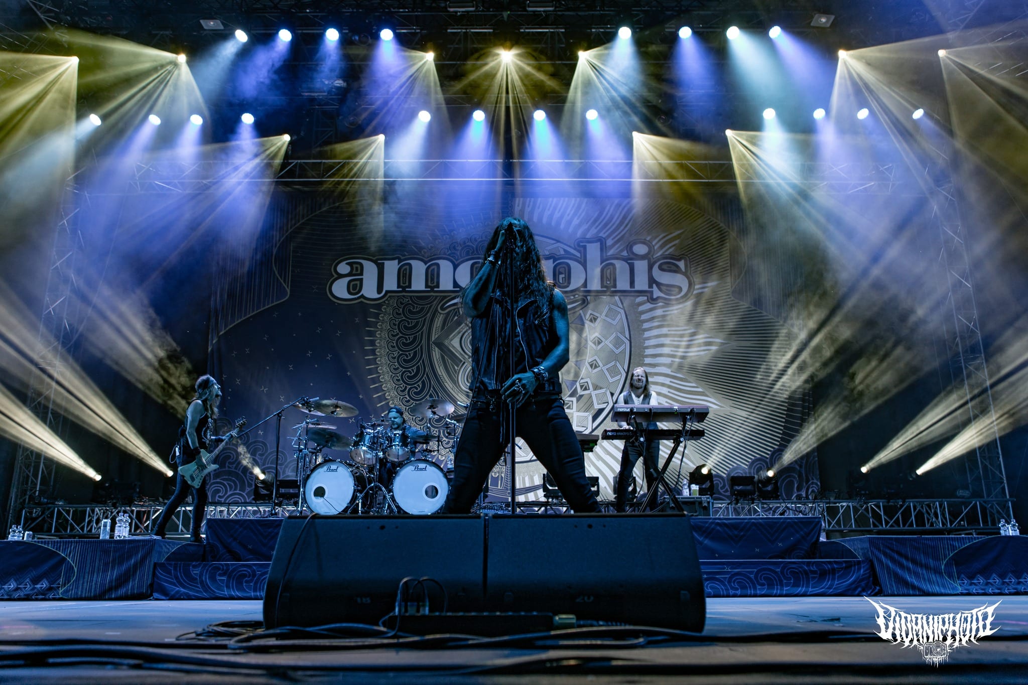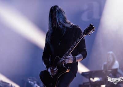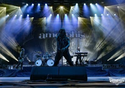 Teljes magabiztossággal álltam be az első sorba az Amorphis kezdete előtt úgy 20 perccel, hiszen tudtam, hogy bárhol is állok, tökéletes lesz a hangosítás– az Amorphis gyakorlatilag a legjobban hangzó koncertzenekar. Bárcsak minden bagázs ilyen profi szakemberekkel turnézna! Szerencsére nem hiába reménykedtem, a jórészt az idén húszéves Tales from the Thousand Lakes-re fókuszáló buli minden szempontból egy tökéletes metalprodukció volt. Néha még mindig hihetetlen, milyen hangok jönnek ki Tomi Joutsen-ből: egyszerre jobban tolja mind a hörgést, mind a tiszta éneket, mint sok egyéb vokalista, aki esetenként “csak” az egyikhez ért. Már csak az hiányzott volna, hogy Anneke van Giersbergen részeit is elviszi az Amongst Stars-ban, de persze azért mindent nem lehet, így az csak felvételről szólalt meg 🙂 Igazságtalan az élet, na; az egyik legjobb hörgős egyszemélyben az egyik legjobb férfiénekes is – lehet utánacsinálni!