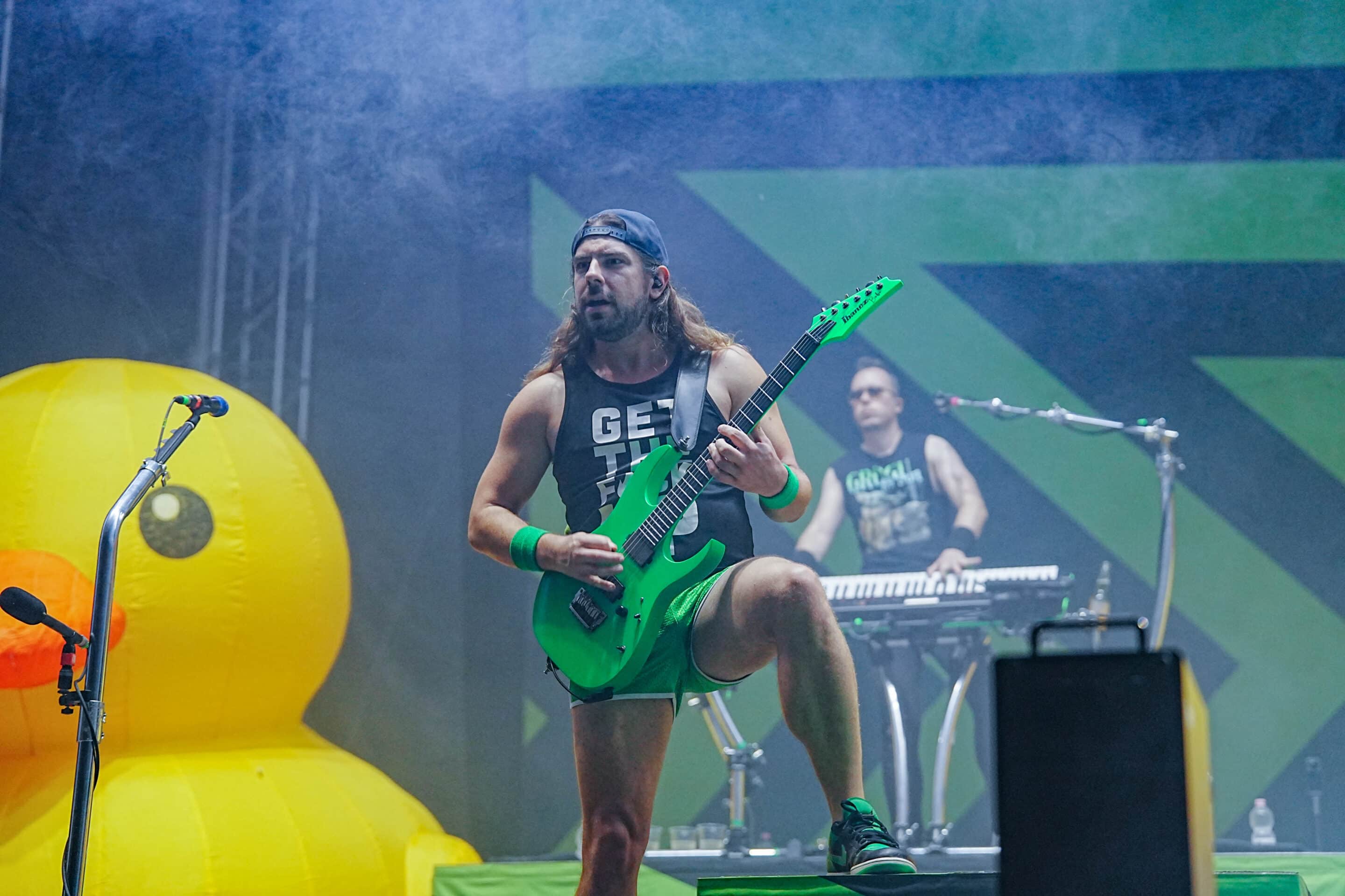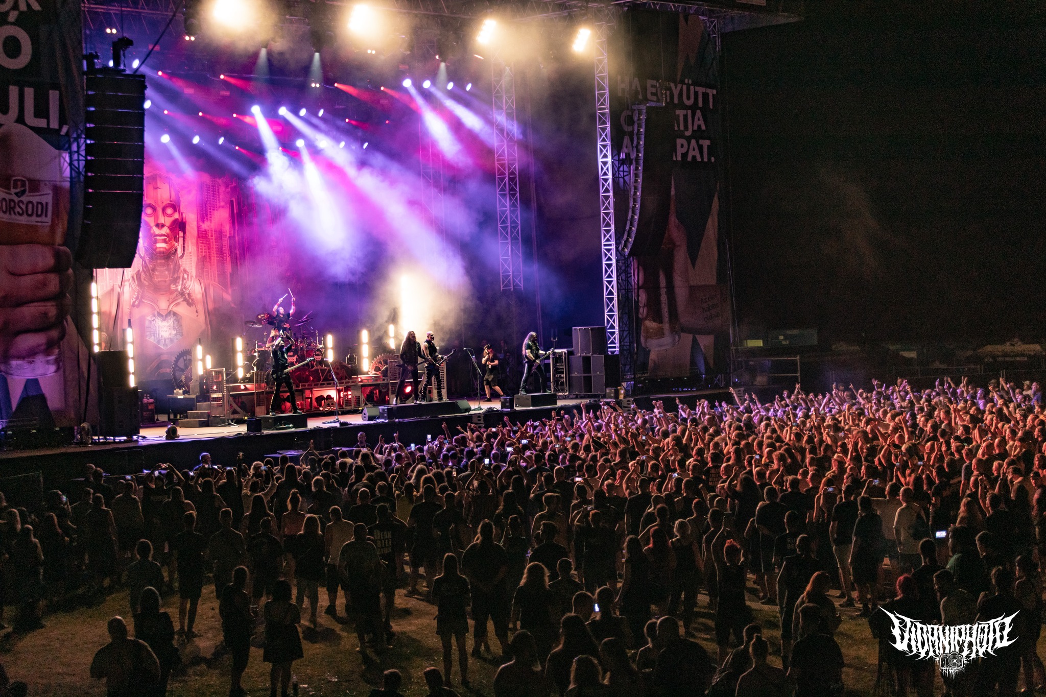 Az Alestorm koncertje zárta aznap a Borsodi nagyszínpadot. Christopher Bowes-ék minél népszerűbbek, annál nagyobb baromságokat találnak ki, és minél nagyobb baromságokat találnak ki, annál népszerűbbek. Sosem hittem volna, hogy tinédzser éveim néhai kedvencére fogok ismét valahol a tömeg elején vigyorogva ugrálni, de úgy tűnik, ez a sorsom. A skót-angol-magyar-mindenféle csapat a szokásos egy nagy gumikacsa helyett ÖT DARAB GUMIKACSÁVAL a színpadon lépett fel; és énekelt ivásról, kalózkodásról, rumról, Mexikóról, Üzbegisztánról (nyilván) és természetesen Magyarországról is. Alestorm-ék gyakorlatilag az abszurditás irányába vitték el már ezt a corny metalklisét, azonban a “baj” csak az, hogy mind a mai napig iszonyatosan fülbemászó dallamokat, pörgős dalokat, és nagyon vicces szövegeket írnak. Az Alestorm élőzenés “búfelejtője” (mert hát hogy’ ne lehetne arra röhögve táncolni, amikor a “the alcohol is free”-re azt rímeltetik rá, hogy “the alcohol is free”?!) tökéletes lezárása volt az első hivatalos fesztiválestének – crowdsurfölők, kalózzászlót lobogtatók, Patty Gurdy kiváló női énekét élvezők, kicsik és nagyok egyaránt letáncolták a lábukat. Nem mindenkinek a kenyere az Alestorm, ezt tudom, de a titok csak annyi – ne vedd se őket, se magad túl komolyan, és pálinka for everyone! (Vica)