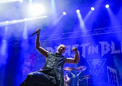 A több nemzetiségű Beast In Black műsorára beugrottam kíváncsiságból, és mert a legnagyobb slágerük az egyik kedvenc sing-along számom – a rajongók számára ennyiből is egyértelmű lehet, hogy ez a Blind And Frozen. A teraszról néztük a koncertet, így sajnos a színpad előtti hangzásról nem tudok nyilatkozni, viszont hatalmas boldogság volt a Blind And Frozen-t végre nem a nappalimban végig üvölteni és – ugrálni, hanem élőben, koncerten, a tömeggel együtt. A magyar basszusgitárossal, Molnár Máté-val büszkélkedő banda tökéletesen lehozott mindent, amit kellett. A színpadkép izgalmas volt, bár én nem feltétlenül vagyok az előre betanult koreográfiák és a cirkusz-szerű előadások híve, mivel természetellenes hatást kelt, ez mindenesetre most szórakoztató volt. A görög énekes, Yannis Papadopoulos kiválóan, tisztán, erőteljesen énekelt – hallottam pletykákat arról, hogy nem bírja már a turnézást, és voltak koncertek, ahol egészen vállalhatatlanul énekelt, nos, én ennek szerencsére az ellenkezőjét tapasztaltam a maratonos bulijukon. (Barbi)