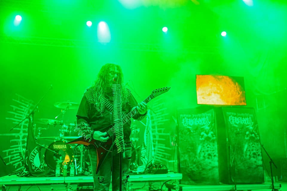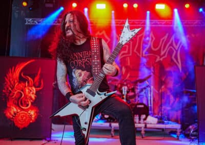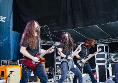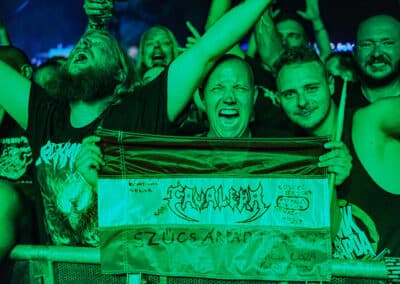 Viszont az utánuk főműsoridőben (20:00h) fellépő tömegpusztítófegyver, a Krisiun koncertje hozta az elvárt szónikus death metal megsemmisülést. Hibátlan volt, amit ezek a brazil csávók leműveltek. Sokadjára látom a triót, de mindig meg tudnak lepni – és magával is ragadott a hangulat. A Scourge Of the Enthroned alatt konkrétan egy kisebb vihart idéztek elő, az állómolinók befordultak a színpadra, hatalmas szél kerekedett, mintha épp jönne valami nem evilági borzalom, ami majd feltépi a színpad tetejét. Szerencsére ez elmaradt és elejétől a végéig élvezhettük a show-t, ráadásul a setlistjükbe szinte minden lemezről előszedtek egy-egy számot. Alex (basszeros / énekes) még mindig rettentő szimpatikus frontember, ami a szívén az a száján: többször is megköszönte a közönség soraiban kialakuló moshpit-et / circlepit-et, meg hogy itt lehetnek és nekünk zenélhetnek. Kiváló hangzás (hangerőre toltam volna még bátran), feszes és precíz játék jellemezte szűk órás fellépésüket. Ilyenkor mindig eszembe jut, hogy a Krisiun headlinerként vagy egy későbbi időpontban és kibővült játékidővel még nagyobbat ment volna. A legvégén feldolgozásként elnyomott cover, az Ace Of Spades csak tovább erősítette bennem azt a hitet, hogy a durva metalt egyedi tálalásban és azonnal felismerhető módon játszó Krisiun a death metal Motörhead-je. (MZ)