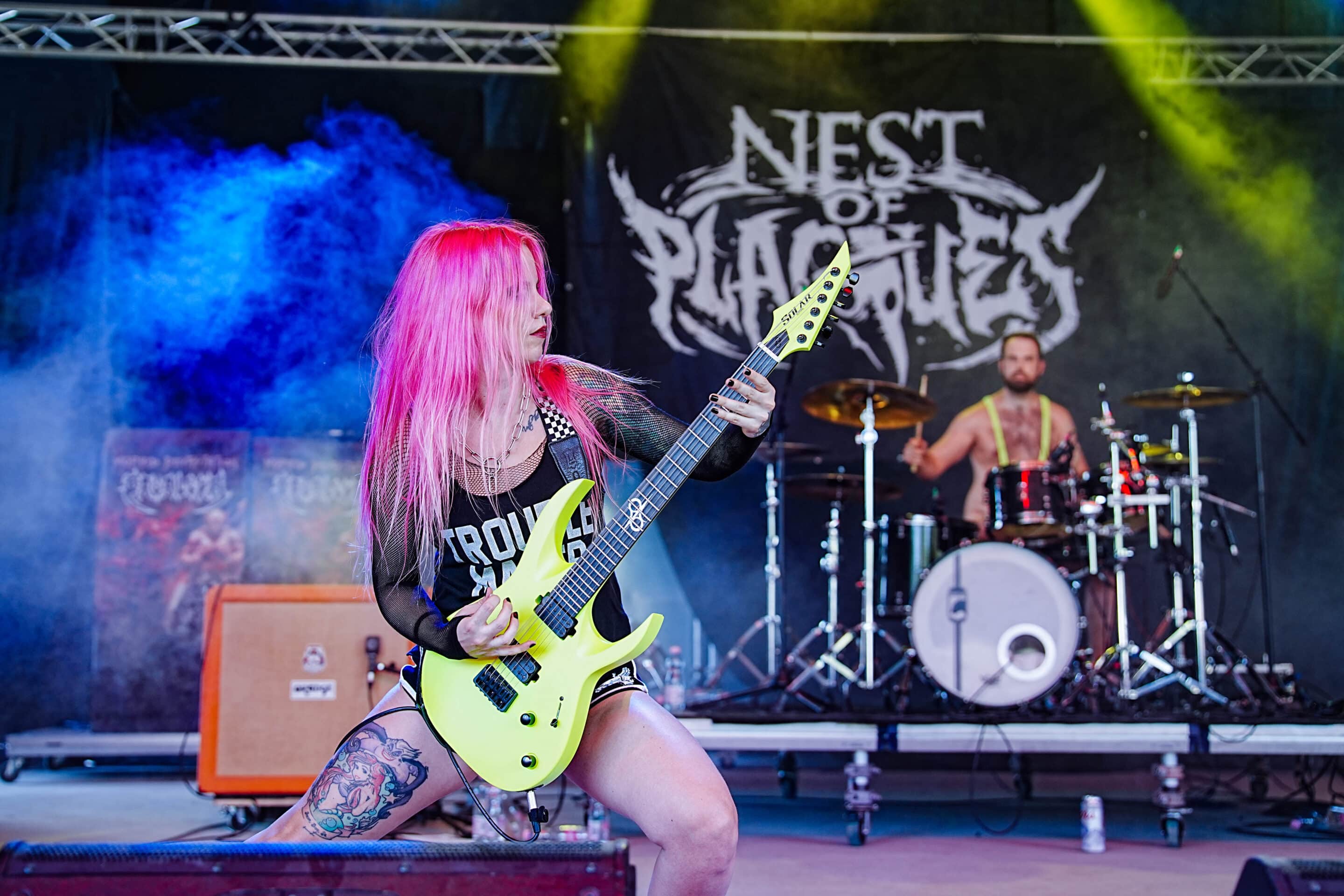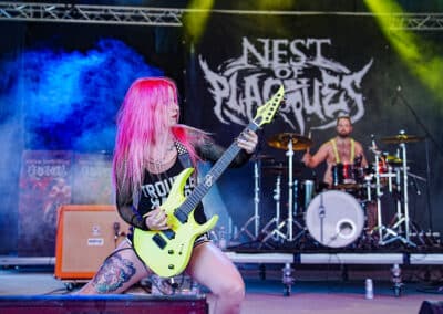 A Metal.hu színpad egyik pénteki fellépője az utóbbi időben Európa-szerte sokat turnézó deathcore Nest of Plagues volt. Nagyon jó volt a hangzás, ami egyébként a Metal.hu sátor legtöbb fellépője esetén elmondható volt. A zenekari összkép nagyon látványos, Kövecses Evelin gitáros pink haja és kiegészítői, a sárga és zöld gitárok kifejezetten ütős kontrasztot adnak a sötét hangvételű zenéjüknek. Fűr Balázs dobos már felvonulásával megbotránkoztatta az egybegyűlteket (na jó, kicsit túlzok, nyilván mindenki imádta), ugyanis nem viselt mást, csak egy Borat-stílusú mankinit – amit ebben az időben valójában teljesen jogosan tett. Az énekes / basszeros Ivanics Dániel dalszövegei nyomán már nem titok, hogy komoly OCD-vel és különböző mentális zavarokkal él együtt, amiről a koncerteken is nyíltan beszél. Ez szerintem egy elképesztően tiszteletreméltó és bátor dolog, hiszen még mindig túl kevesen ismerik és látják be a mentális betegségek komolyságát, és hogy azok mennyire megnehezítik a velük küzdő emberek életét – így innen is nagy respekt az érzékenyítéshez hozzájáruló (nem csak) művészeknek. (Barbi)