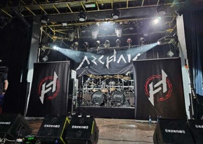Szóval, kajálás után van 30-60perc csend, közben kezdődik a beengedés mi meg a kis helyünkön készülünk a showra. 30 perces settbe nem sok minden fér, de annyi biztos, hogy fizikailag és szellemileg is fel kell készülni, hiszen maximális bulit kell csinálni minden állomáson. Ha nem hagyunk nyomot, nem is lesz semmi hozadéka a turnénak. A setlistünk úgy jött ki, hogy 32 perces lett, így az intrót mindenhol 2-3 perccel hamarabb indítottuk. Nekünk ez sokat segített, ők meg leszarták csak a vége legyen pontos. Általában így mindig 1 percet sikerült nyernünk a végére amit el is vitt a fotózás. Utána 2 dobverő bedobása 2-4 pengető, handshake és irány pakolni. Csaba (a dobos) 38,5 körüli lázzal tolta végig az első 4-5 buli, szóval ő kimaradt a pakolásból, de így volt min szenvednie.