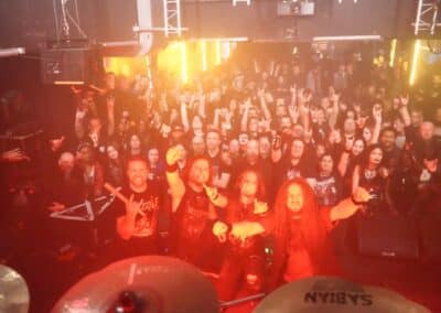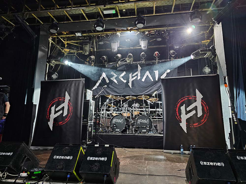 Első nap reggel 05:20 körül indultunk, nagyjából minden a tervek szerint alakult. Első megállónk Ostrava volt, laza 500km-re Budapesttől, délre kellett megérkeznünk. Ha turnén vagy, akkor az első és legfontosabb, hogy amit kérnek vagy amiről megállapodás született, azt tartsd be. Legfontosabb a timing. Az elején egy gyors bemutatkozás, kicsit körbe szagolja mindenki a másikat és mehet is a feszesre húzott load-in, soundcheck. Ilyenkor az szokott lenni, hogy minden zenekar kap egy szűk idősávot, de ebben az esetben csak a Gorgoroth-nak és nekünk volt beállásunk. Mivel ez a ritmus mindenki számára megfelelt, ez maradt a turné további részén is. Nekünk cakkpakk 1 óránk volt mindenhol beállni, ami azért, valljuk meg, kényelmesnek mondható. Minket mindig a helyi arc hangosított. Ostravában rendben is volt a hangzás, majdnem minden közelített a tökéleteshez. A szettünk egészen pontosan 32 perces volt (az esetleges technikai kihívások nélkül), ezért mindig a helyi hangosítókkal kellett leboltolni, hogy kicsivel hamarabb indítjuk az intrót, és így bele tudunk férni a 30 perces időkorlátba. Szerencsére ebben is mindenki együttműködő volt. A cseh és a lengyel buli is teljesen rendben ment le. Itt ki kell emelni a lengyel közönséget, hihetetlen lelkesen és nagy odaadással voltak az egész este folyamán, nagy élmény volt így színpadra állni. Talán itthon is ilyen lehetett 20-30 éve. 🙂 Az osztrákoknál viszont már hozta magát a statisztika, jöttek is a gondok. Itt ugyanis az utánunk következő Death Rattle zenekar is csinált egy gyors beállást. Nos, mint utólag kiderült, a bécsi keverős arc nem állította vissza a pulton az elmentésünket, így már az intro sem szólalt meg, majd kezdéskor szembesültünk azzal, hogy a dobot nem halljuk fülben, teljesen le lett nullázva. Ez természetesen már csak a színpadon derült ki, élesben. Ennek ellenére végül sikerült jól lehozni a bulit. Dacára a korai kezdésnek, Bécsben már 4 órakor is elég szép számmal érkeztek az érdeklődők. Egy-két kivételtől eltekintve, a nézőszámra egyébként sehol sem volt panaszunk.