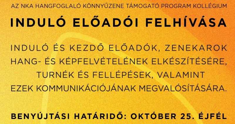 A Hangfoglaló Könnyűzene Támogató Program Kollégium tizenegyedik alkalommal hirdet nyílt pályázatot a Hangfoglaló Program keretén belül induló és kezdő előadók, zenekarok hang- és képfelvételének elkészítésére, turnék és fellépések, valamint ezek kommunikációjának megvalósítására.