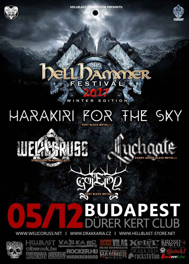 Az immár hatodik éve folyamatosan növekedő Hellhammer fesztivál a metal olyan, sötét irányzatait fogja össze, mint a black metal, az avantgárd metal vagy épp a poszt-metal, hogy csak párat említsünk. Az idei téli felvonás a korábbi régiós keretből kilépve már nem csak Csehországban, Ausztriában és Szlovákiában kerül megrendezésre, hanem Magyarországon is! A fesztivál idei fő fellépői az egyedi poszt-black metalban utazó osztrák Harakiri For The Sky, Szibéria szimfonikus black metal harcosai, a Welicoruss és a kitűnő brit avantgárd black metalos Lychgate! A koncerteket magyar csapatok nyitják, felvillantva a hazai színtér egy-egy nagyszerű szegletét. Ne hagyjátok ki a tél legsötétebb black metal bulijait!