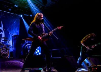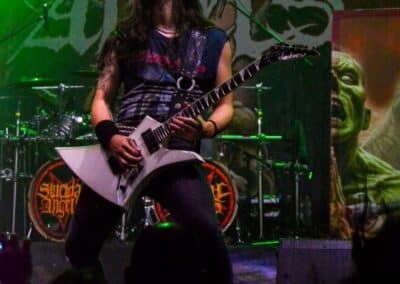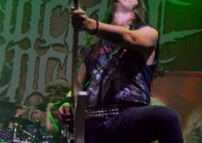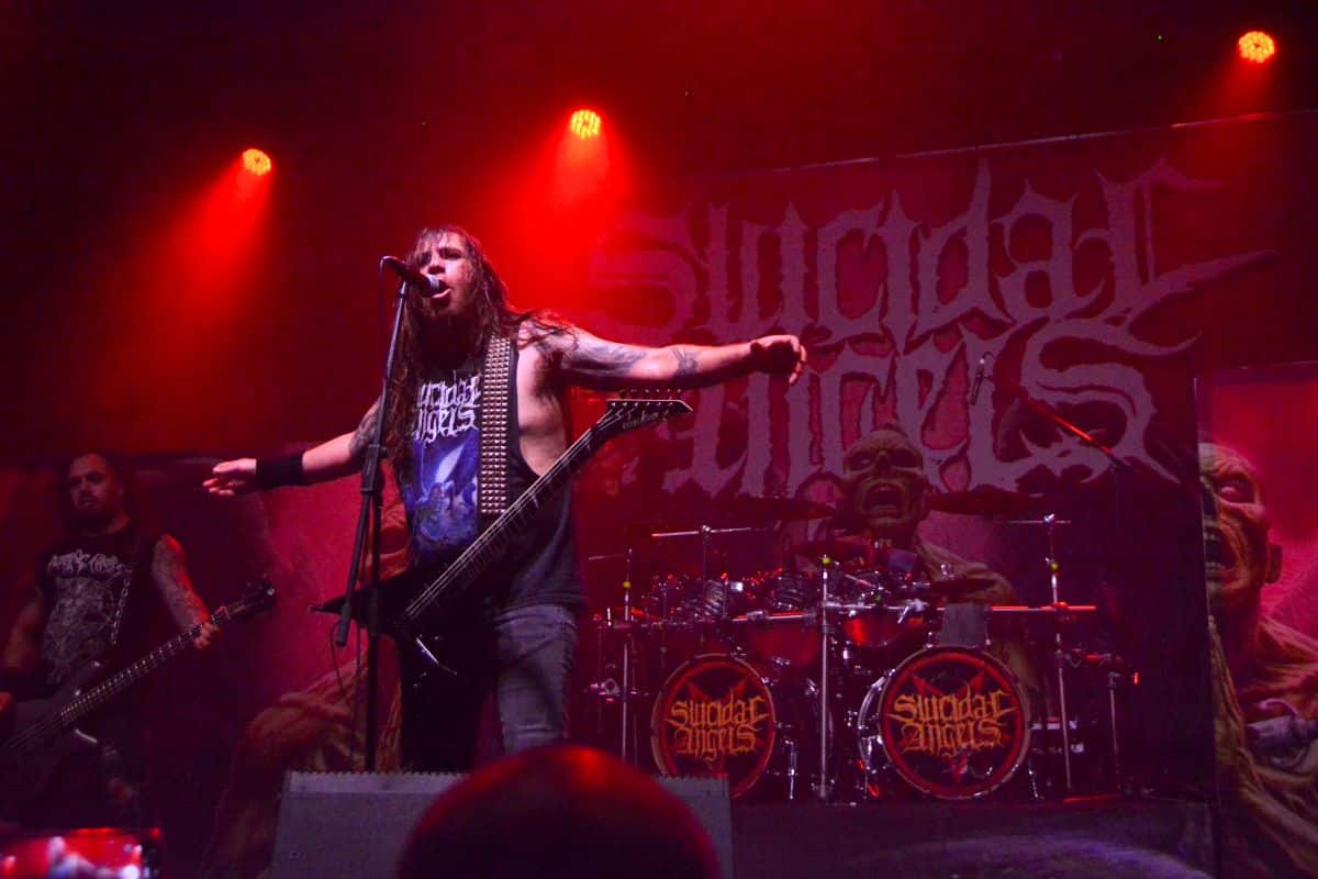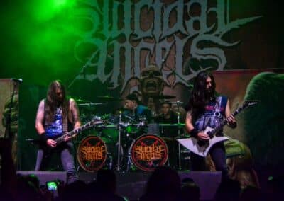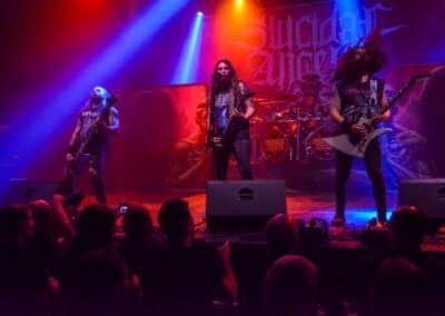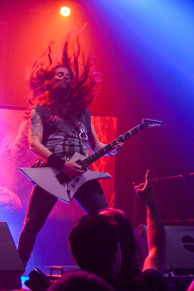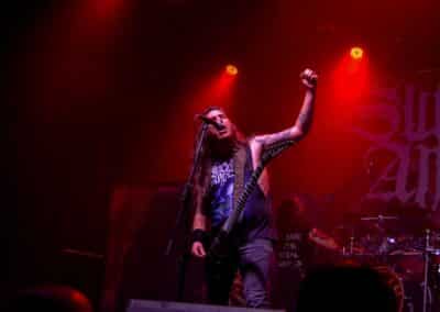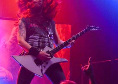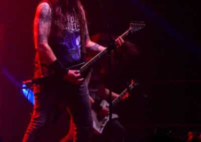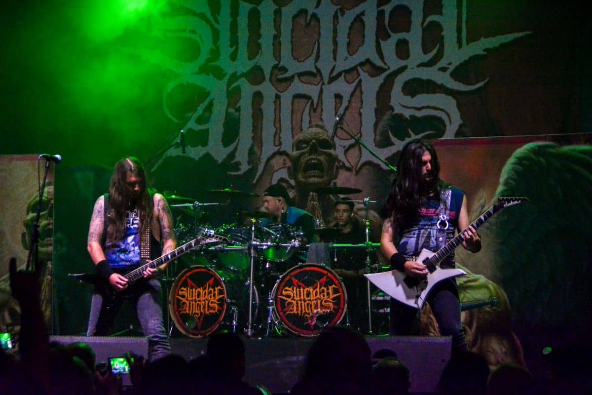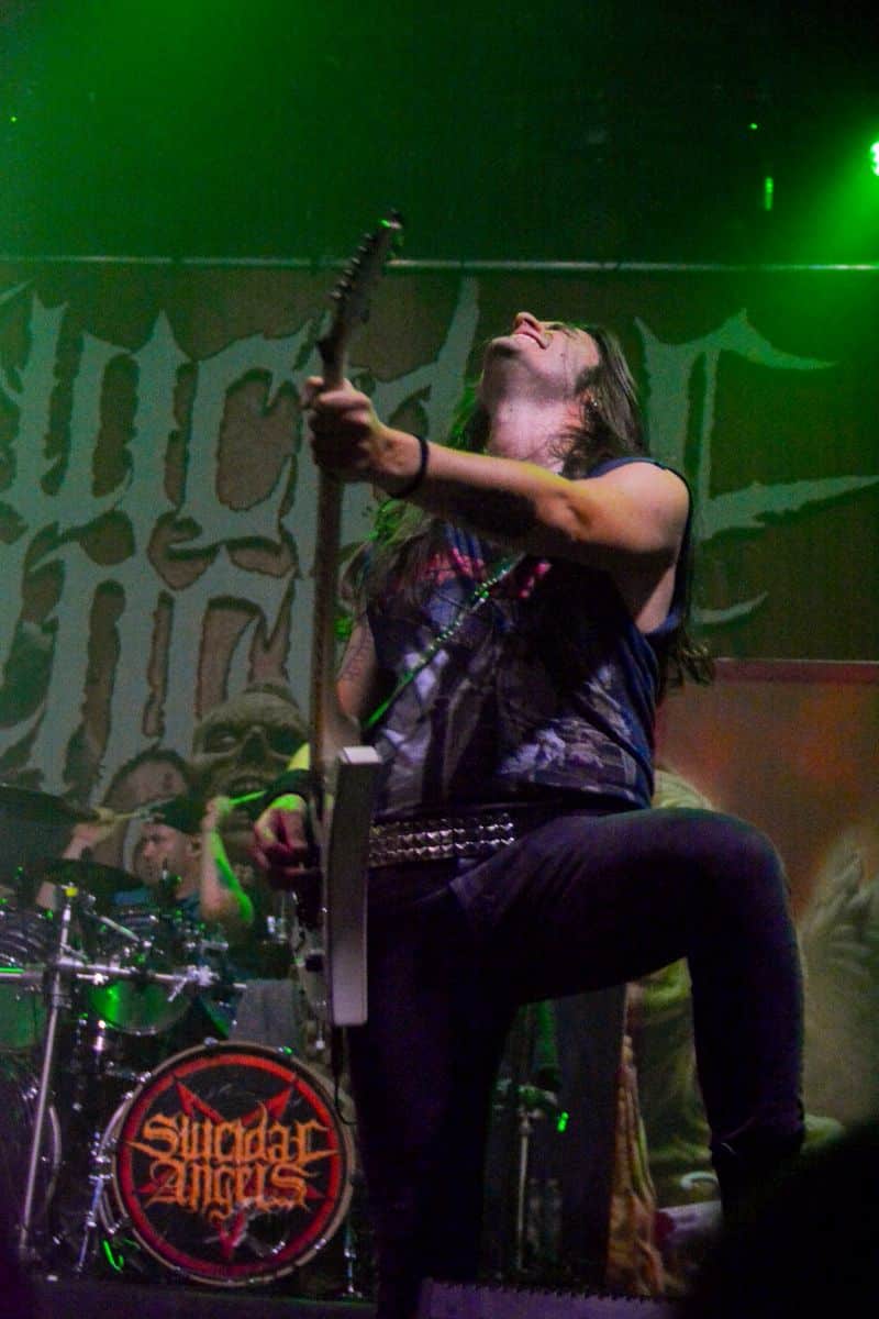 Gyors átszerelés, és a görög Suicidal Angels lépett a színpadra. Ez csak idén a sokadik olyan beszámoló, amelyikben a zenekar bemutatását azzal kezdem, hogy „én alapvetően nem szeretem a trash metal-t” – ez egy tény, de amit a görögök működtek, az valami egészen magával ragadó volt; a Bay Area metal-ja mediterrán lendülettel és vehemenciával előadva. Gyors, feszes tempó, pörgős riff-ek, precíz pengetés – ráadásul meglehetősen tisztán is szóltak, úgyhogy minden adott volt ahhoz, hogy nagy hangulat legyen. Hát lett is. A fellépésük alatt – a kezdetek kezdetén – kicsit aggódtam is, hiszen úgy tűnt, hogy továbbra is csak pártucatnyian lődörögnek a nézőtéren, de szerencsére a két zenekar közötti szünetben minimum megduplázódott a létszám, és amíg a Sadist zenéjét mindenki karba tett kézzel és hümmögve hallgatta, addig a Suicidal Angels alatt jelentős fejrázás és mozgás támadt, jelezve, hogy megkezdődött a befogadási fázis és a műélvezet maga. Nem albumbemutató volt a fellépés témája, ezzel együtt is az új anyag (Profane Prayer, tessék otthon hullámosra hallgatni) dalai meglehetősen fajsúlyosan szerepeltek az este menetrendjében (Reborn in Violence, Crypts of Madness, Purified by Fire, Apokathilosis, When the Lions Die, The Return of the Reaper, Bloody Ground, Capital of War). Folyamatosan olyan érzésem támadt, hogy a Profane Prayer-dalok alatt mintha nagyobb lenne a mozgás… előzőleg becsületesen végighallgattam a diszkográfiájuk utolsó pár tételét, és az a benyomásom támadt, hogy az utolsó anyag dalai mintha pörgősebbek és élénkebbek lennének korábbiaknál – és a közönség reakciója alátámasztani látszott mindezt.