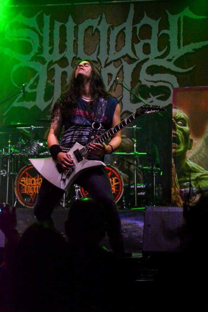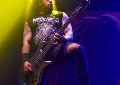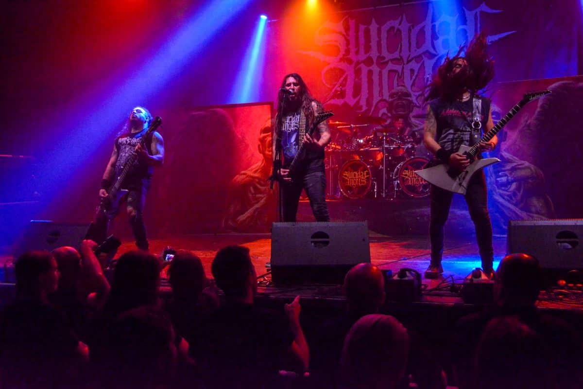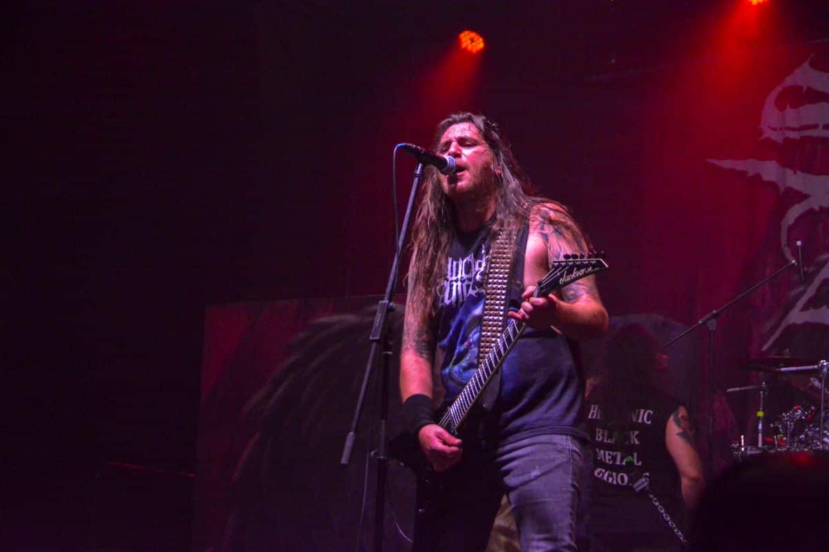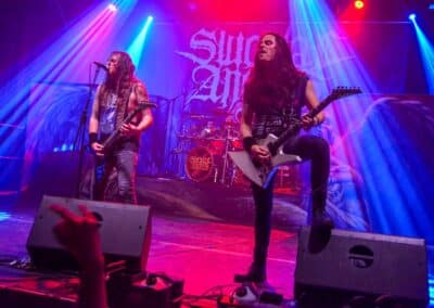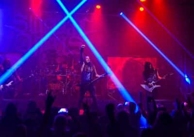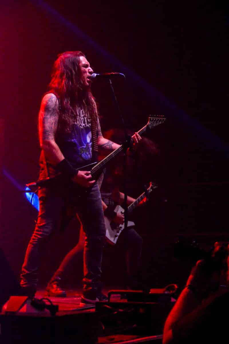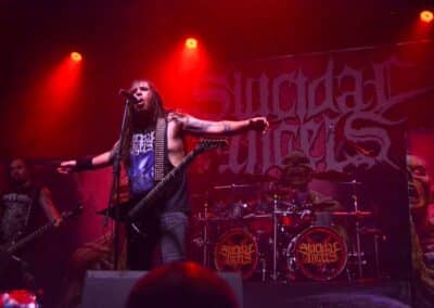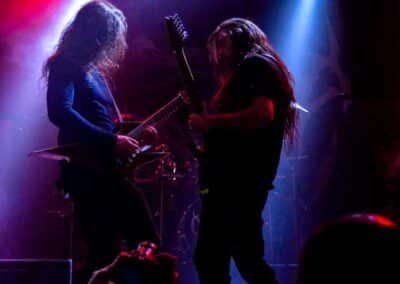 Gyors átszerelés, és a görög Suicidal Angels lépett a színpadra. Ez csak idén a sokadik olyan beszámoló, amelyikben a zenekar bemutatását azzal kezdem, hogy „én alapvetően nem szeretem a trash metal-t” – ez egy tény, de amit a görögök működtek, az valami egészen magával ragadó volt; a Bay Area metal-ja mediterrán lendülettel és vehemenciával előadva. Gyors, feszes tempó, pörgős riff-ek, precíz pengetés – ráadásul meglehetősen tisztán is szóltak, úgyhogy minden adott volt ahhoz, hogy nagy hangulat legyen. Hát lett is. A fellépésük alatt – a kezdetek kezdetén – kicsit aggódtam is, hiszen úgy tűnt, hogy továbbra is csak pártucatnyian lődörögnek a nézőtéren, de szerencsére a két zenekar közötti szünetben minimum megduplázódott a létszám, és amíg a Sadist zenéjét mindenki karba tett kézzel és hümmögve hallgatta, addig a Suicidal Angels alatt jelentős fejrázás és mozgás támadt, jelezve, hogy megkezdődött a befogadási fázis és a műélvezet maga. Nem albumbemutató volt a fellépés témája, ezzel együtt is az új anyag (Profane Prayer, tessék otthon hullámosra hallgatni) dalai meglehetősen fajsúlyosan szerepeltek az este menetrendjében (Reborn in Violence, Crypts of Madness, Purified by Fire, Apokathilosis, When the Lions Die, The Return of the Reaper, Bloody Ground, Capital of War). Folyamatosan olyan érzésem támadt, hogy a Profane Prayer-dalok alatt mintha nagyobb lenne a mozgás… előzőleg becsületesen végighallgattam a diszkográfiájuk utolsó pár tételét, és az a benyomásom támadt, hogy az utolsó anyag dalai mintha pörgősebbek és élénkebbek lennének korábbiaknál – és a közönség reakciója alátámasztani látszott mindezt.