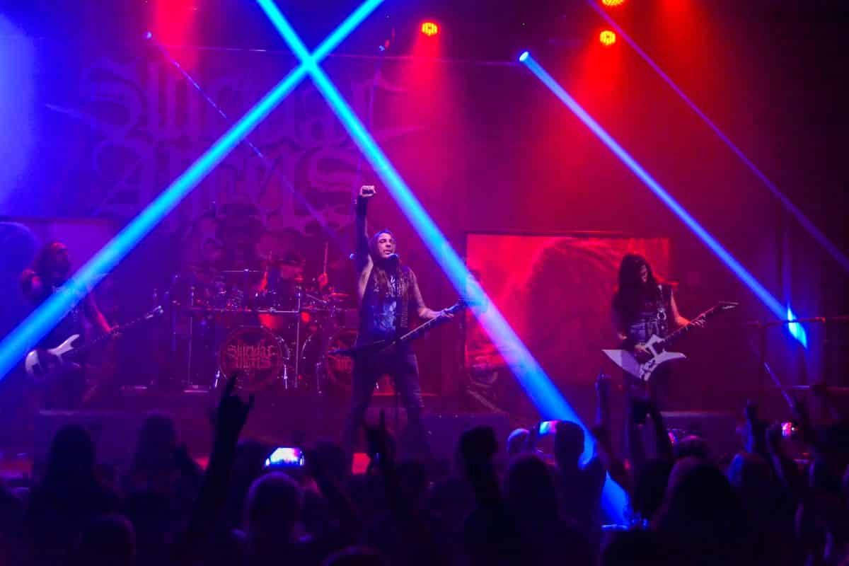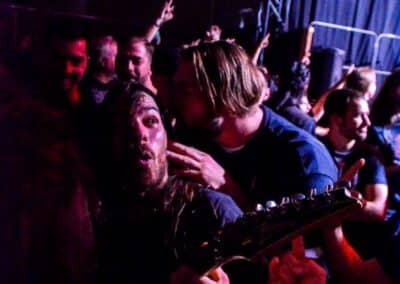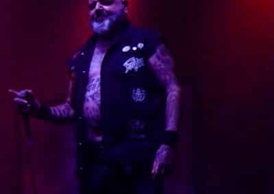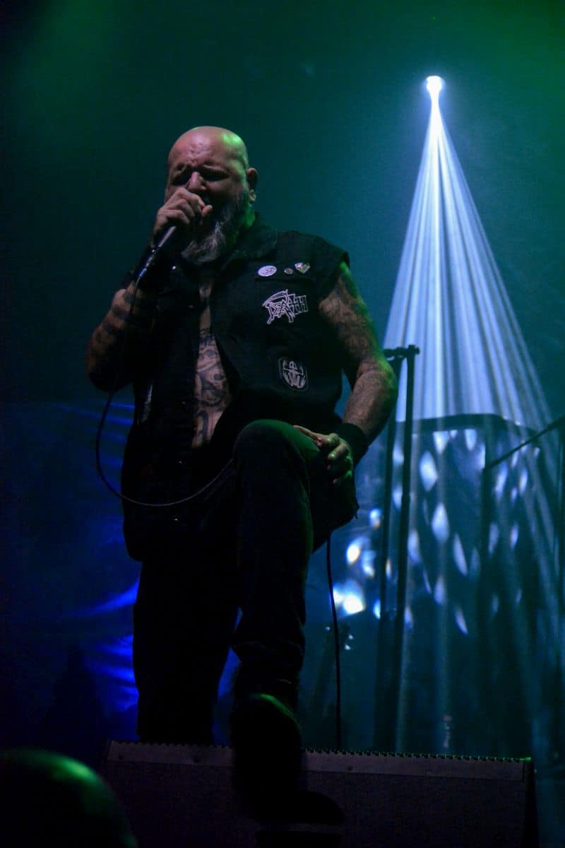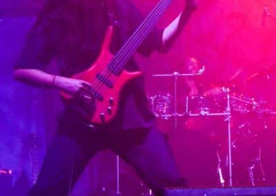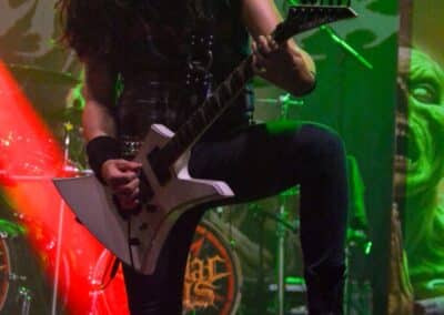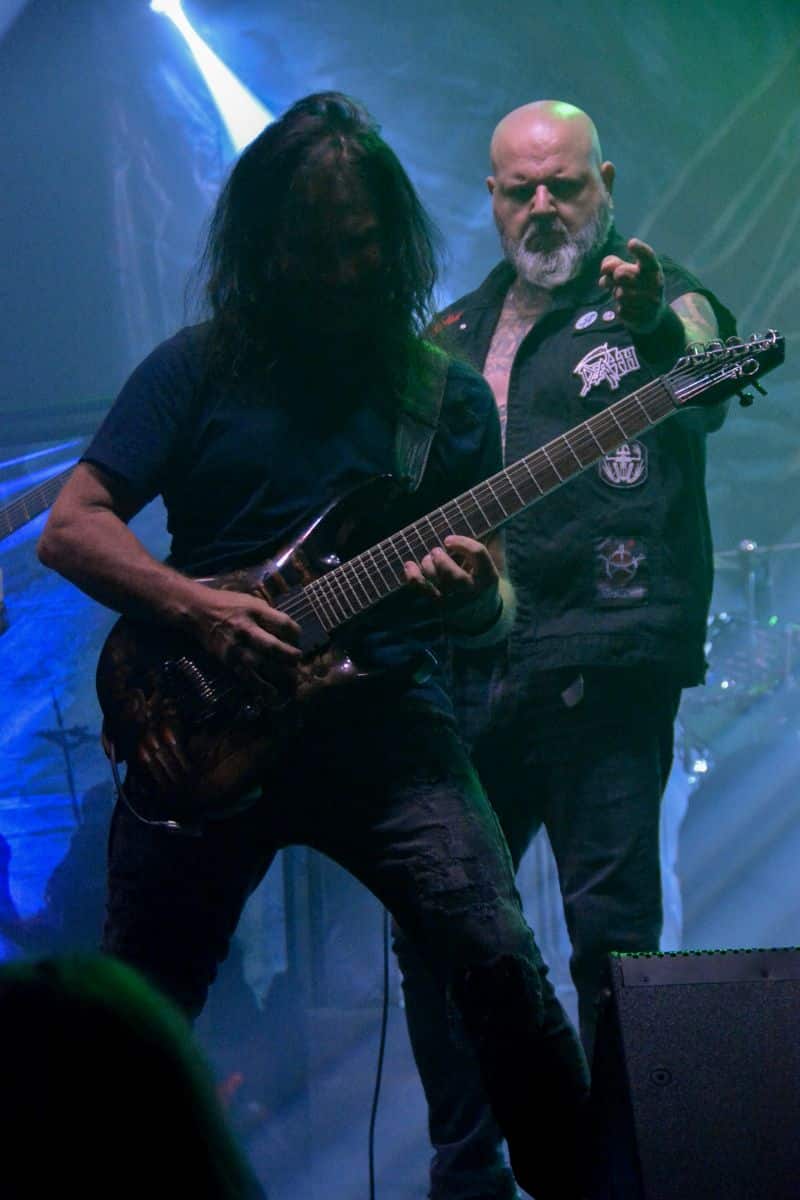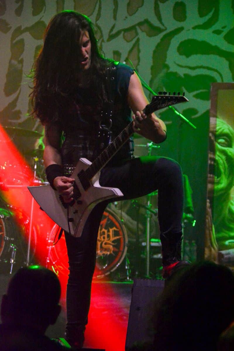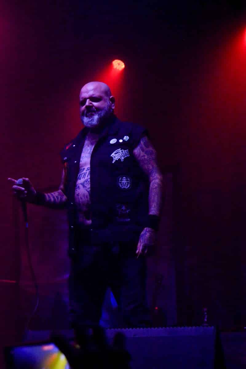 Gyors átszerelés, és a görög Suicidal Angels lépett a színpadra. Ez csak idén a sokadik olyan beszámoló, amelyikben a zenekar bemutatását azzal kezdem, hogy „én alapvetően nem szeretem a trash metal-t” – ez egy tény, de amit a görögök működtek, az valami egészen magával ragadó volt; a Bay Area metal-ja mediterrán lendülettel és vehemenciával előadva. Gyors, feszes tempó, pörgős riff-ek, precíz pengetés – ráadásul meglehetősen tisztán is szóltak, úgyhogy minden adott volt ahhoz, hogy nagy hangulat legyen. Hát lett is. A fellépésük alatt – a kezdetek kezdetén – kicsit aggódtam is, hiszen úgy tűnt, hogy továbbra is csak pártucatnyian lődörögnek a nézőtéren, de szerencsére a két zenekar közötti szünetben minimum megduplázódott a létszám, és amíg a Sadist zenéjét mindenki karba tett kézzel és hümmögve hallgatta, addig a Suicidal Angels alatt jelentős fejrázás és mozgás támadt, jelezve, hogy megkezdődött a befogadási fázis és a műélvezet maga. Nem albumbemutató volt a fellépés témája, ezzel együtt is az új anyag (Profane Prayer, tessék otthon hullámosra hallgatni) dalai meglehetősen fajsúlyosan szerepeltek az este menetrendjében (Reborn in Violence, Crypts of Madness, Purified by Fire, Apokathilosis, When the Lions Die, The Return of the Reaper, Bloody Ground, Capital of War). Folyamatosan olyan érzésem támadt, hogy a Profane Prayer-dalok alatt mintha nagyobb lenne a mozgás… előzőleg becsületesen végighallgattam a diszkográfiájuk utolsó pár tételét, és az a benyomásom támadt, hogy az utolsó anyag dalai mintha pörgősebbek és élénkebbek lennének korábbiaknál – és a közönség reakciója alátámasztani látszott mindezt.