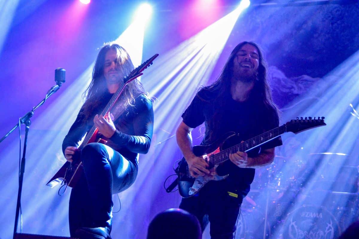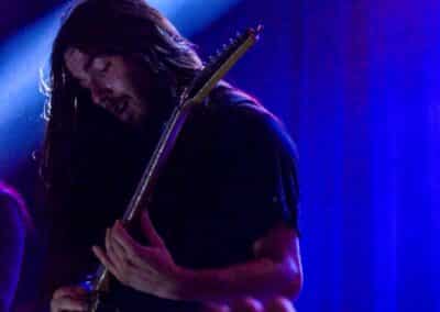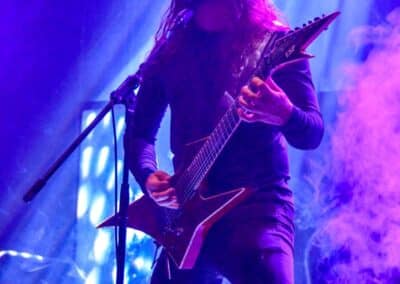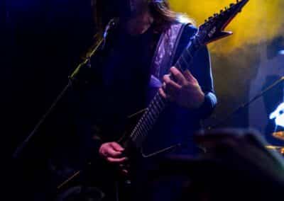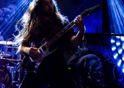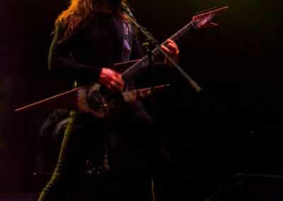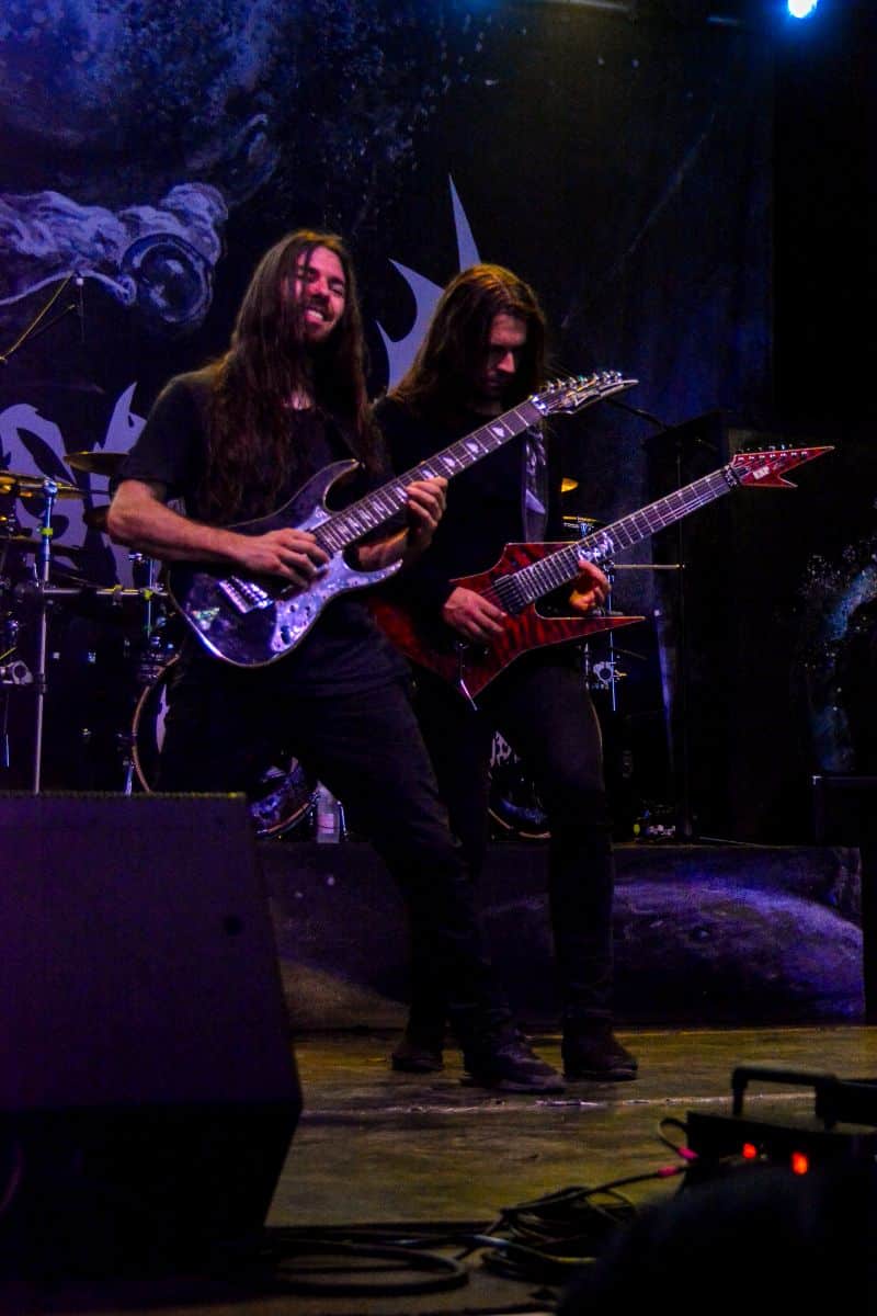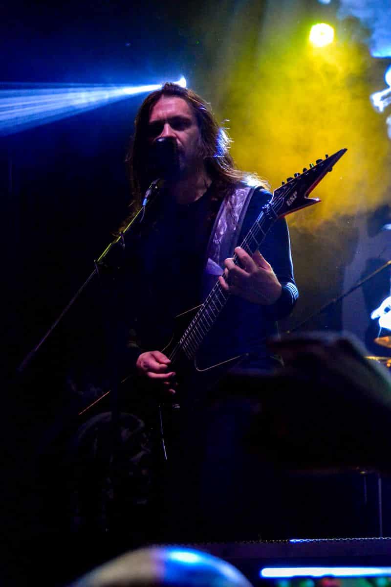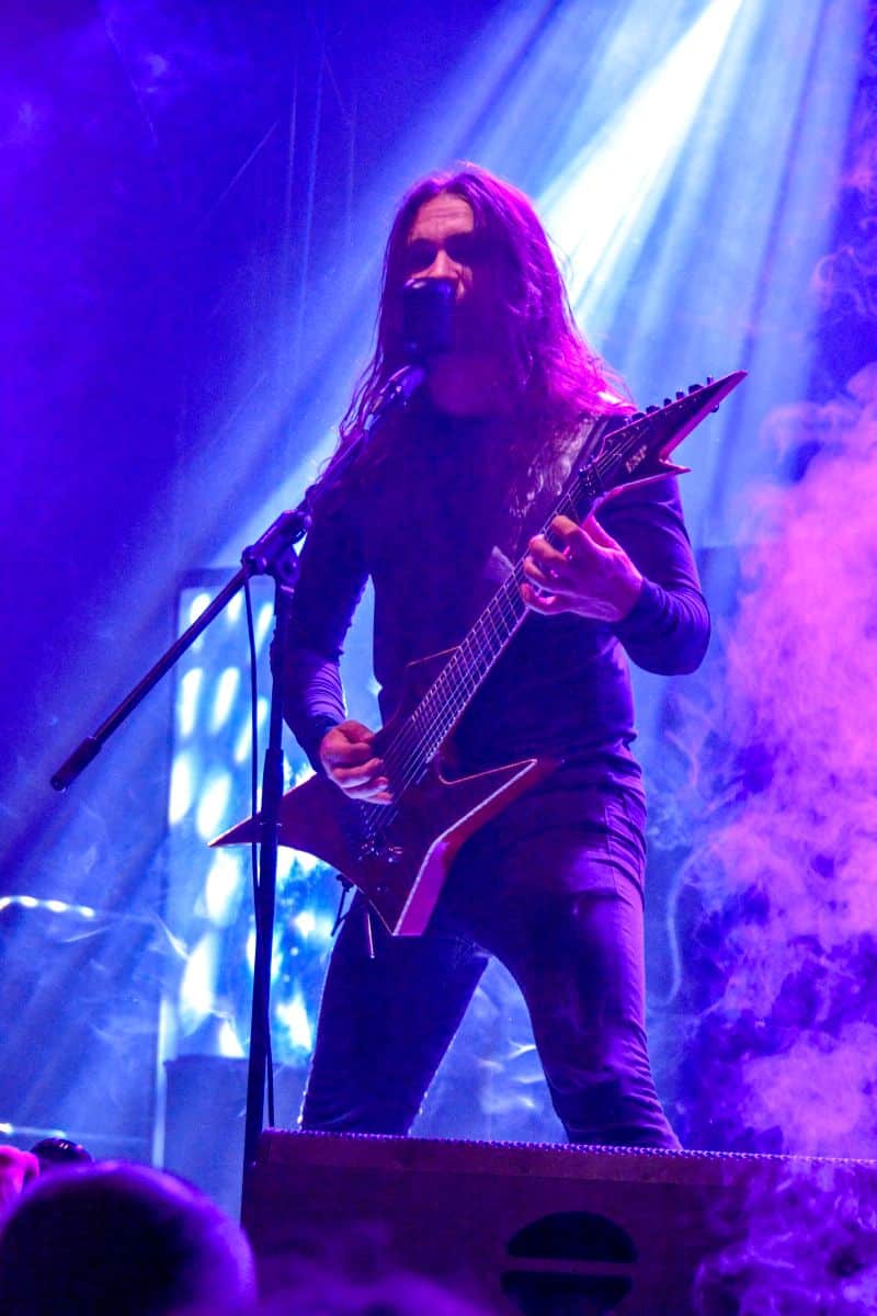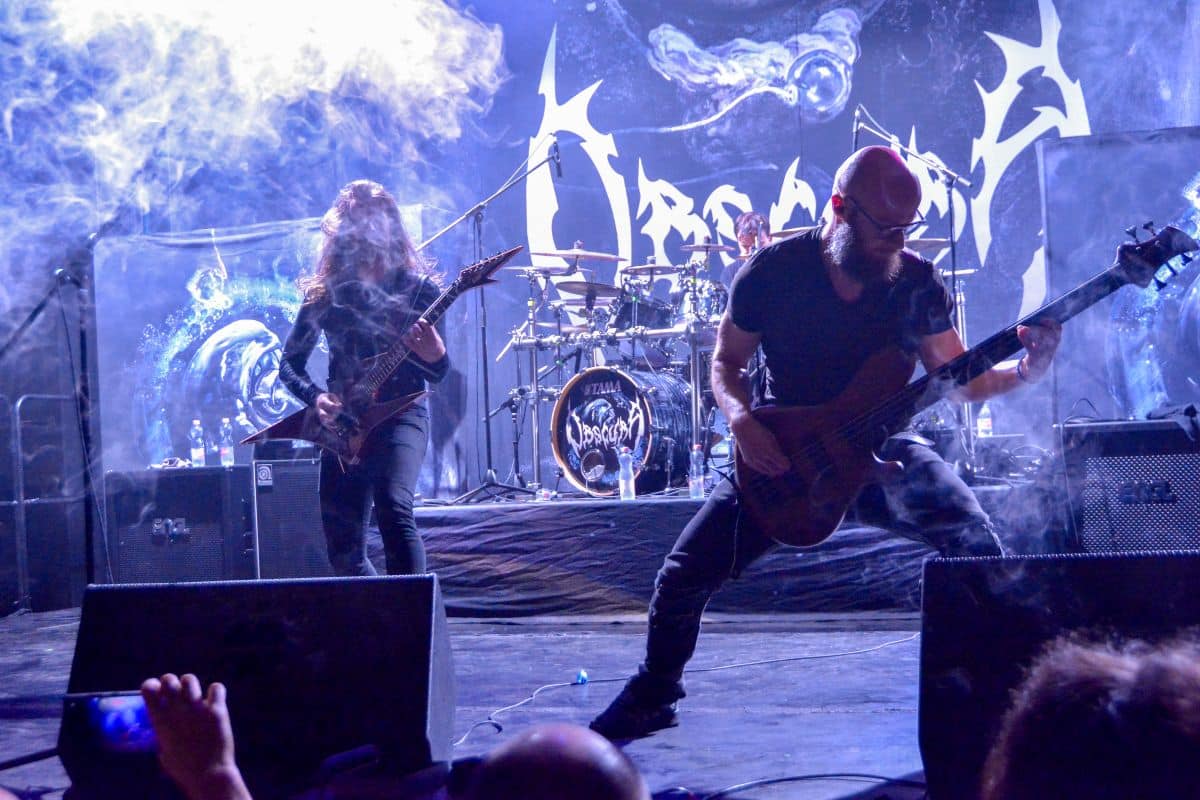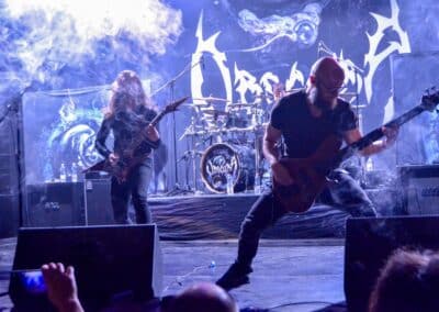 Átszerelés, és következett az est fénypontja, az Obscura. Lendületes nyitás – úgy, ahogy az Steffen-től megszoktuk –, és beindult a buli. A színpadon egy vérprofi gépezet működött, és maga az előadás tökéletesen ötvözte az élő fellépések erejét-dinamikáját-lendületét a felvételek komplexitásával és tisztaságával. Ugye most láttuk először az Obscura teljesen új konfigurációját, és amit ez a kvartett a színpadon művelt, azzal teljesen levett a lábamról. A zenekar szólógitárosa, Kevin Olasz – ne tévesszen meg senkit a vezetékneve, nincsenek magyar felmenői, legalábbis ő ragaszkodott ehhez a verzióhoz – egészen elképesztő dolgokat játszott egészen hajmeresztő technikával. Az extrém metal gitárzenéje és játéktechnikája nagyon sokat fejlődött az utóbbi évtizedek során: megjelent még ezer éve a tapping-elés, megjelent a hibrid pengetés is, de hogy valaki ezt a két eszközt egyszerre használja szólózás során, na, ez számomra újdonság volt. Német barátunk hihetetlen átéléssel játszott, tényleg élvezte azt, amit csinál, és közben mindennel foglalkozott, csak azzal nem, hogy az ujjai alól hogyan folynak ki a zeneileg is és technikailag is csodálatraméltó szólók. Tökéletes párost alkottak Steffen-nel, akinek a szerepe leginkább az ének és a kísérlet volt, bár egy pár bonyolultabb kiállás megvalósítását is magára vállalta. Érdekes volt nézni a pengetési technikáját, különösen a Suicidal Angels működése után: a görögök még az egészen extrémen gyors részeket is downstroke (csak lefelé) pengették – ehhez képest Steffen az Obscura skáláján közepesen gyorsnak minősülő részeket is váltott pengetéssel játszotta.