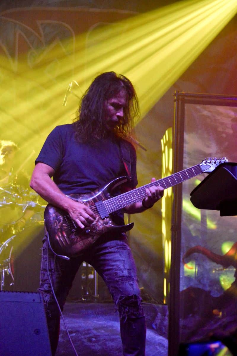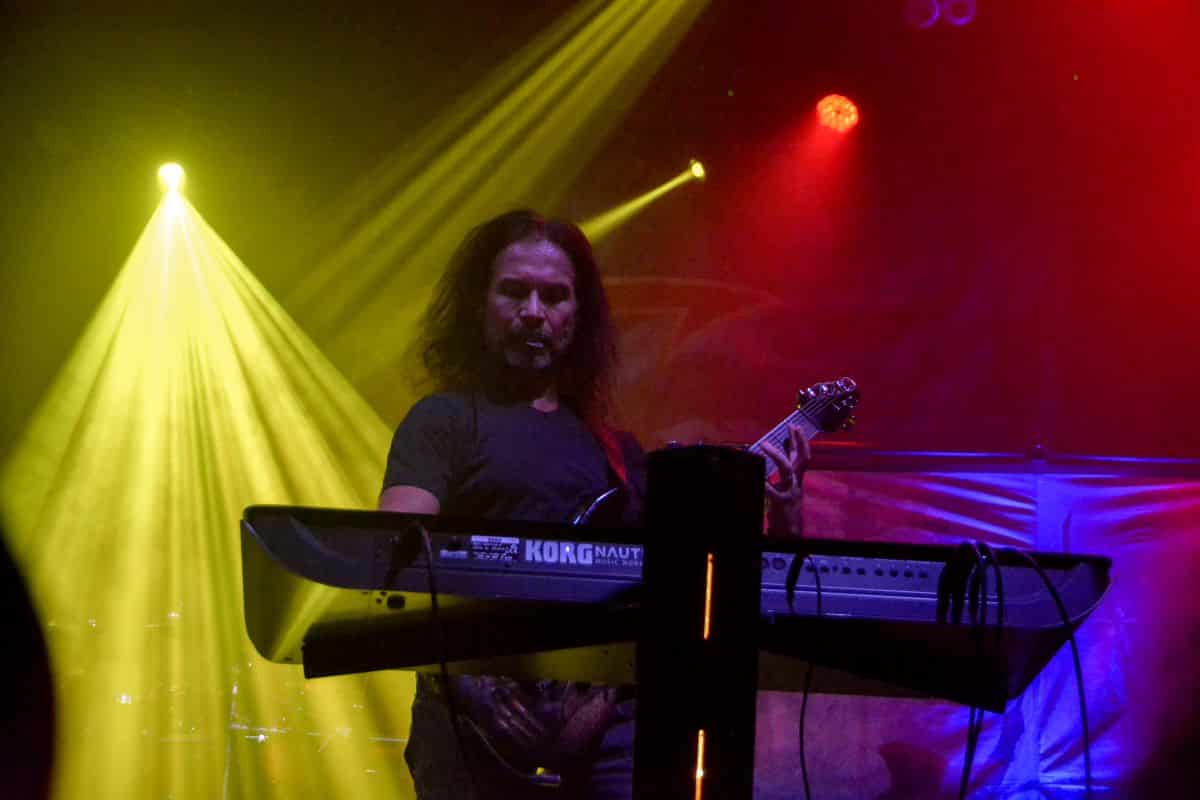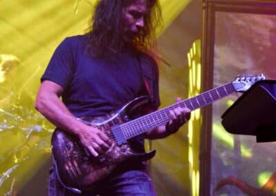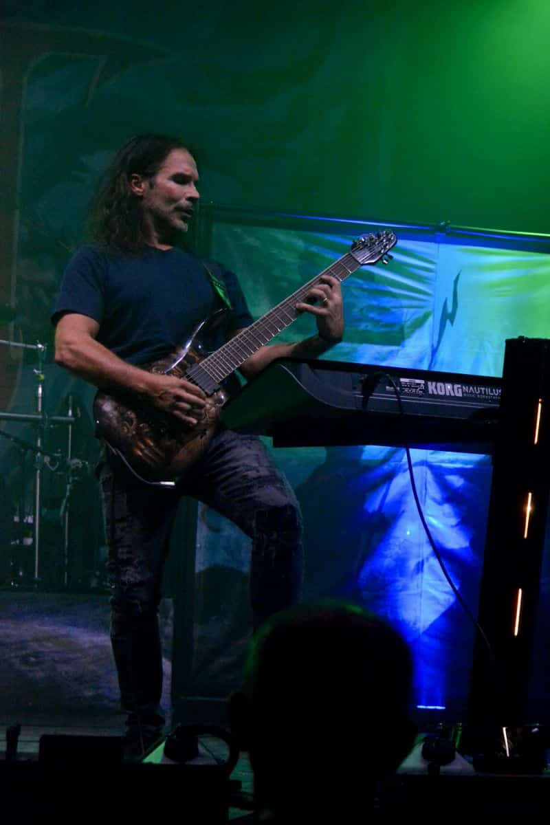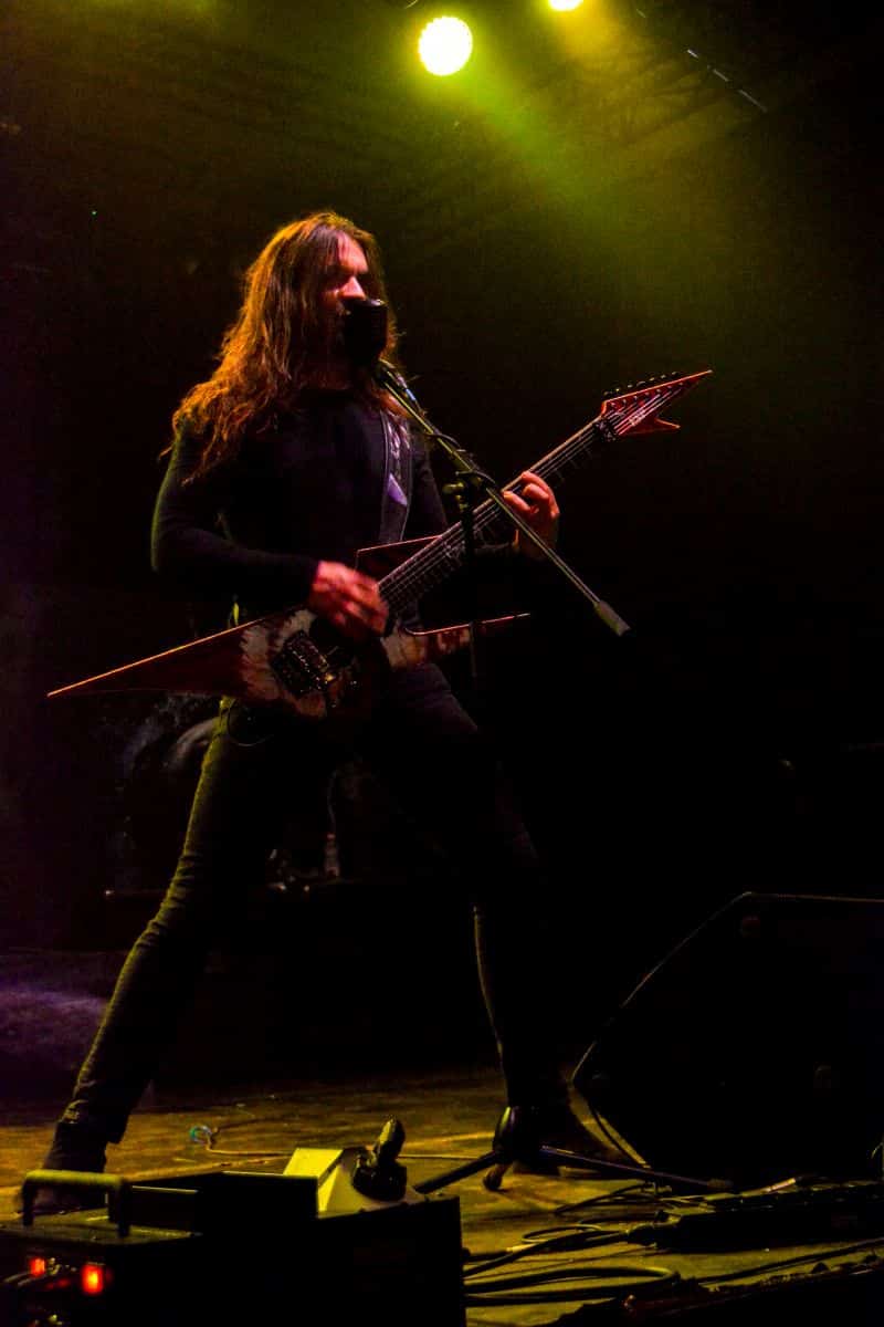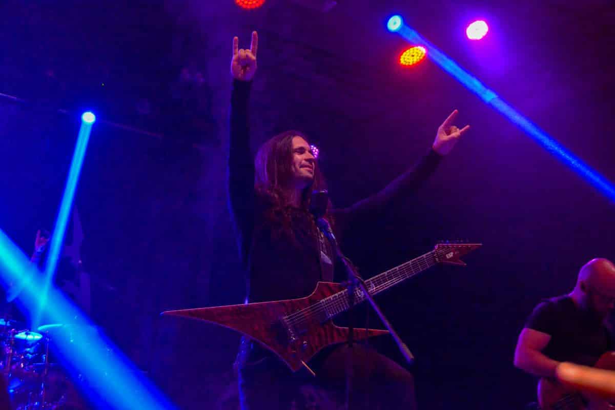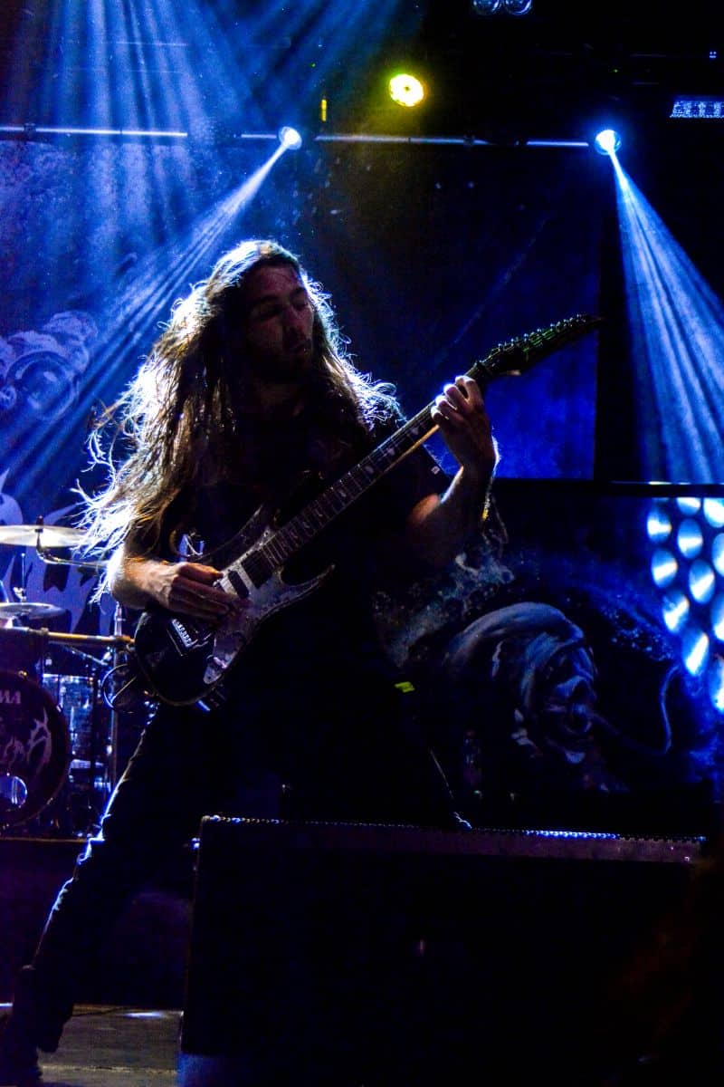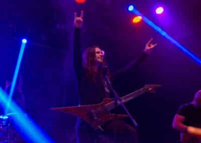 Átszerelés, és következett az est fénypontja, az Obscura. Lendületes nyitás – úgy, ahogy az Steffen-től megszoktuk –, és beindult a buli. A színpadon egy vérprofi gépezet működött, és maga az előadás tökéletesen ötvözte az élő fellépések erejét-dinamikáját-lendületét a felvételek komplexitásával és tisztaságával. Ugye most láttuk először az Obscura teljesen új konfigurációját, és amit ez a kvartett a színpadon művelt, azzal teljesen levett a lábamról. A zenekar szólógitárosa, Kevin Olasz – ne tévesszen meg senkit a vezetékneve, nincsenek magyar felmenői, legalábbis ő ragaszkodott ehhez a verzióhoz – egészen elképesztő dolgokat játszott egészen hajmeresztő technikával. Az extrém metal gitárzenéje és játéktechnikája nagyon sokat fejlődött az utóbbi évtizedek során: megjelent még ezer éve a tapping-elés, megjelent a hibrid pengetés is, de hogy valaki ezt a két eszközt egyszerre használja szólózás során, na, ez számomra újdonság volt. Német barátunk hihetetlen átéléssel játszott, tényleg élvezte azt, amit csinál, és közben mindennel foglalkozott, csak azzal nem, hogy az ujjai alól hogyan folynak ki a zeneileg is és technikailag is csodálatraméltó szólók. Tökéletes párost alkottak Steffen-nel, akinek a szerepe leginkább az ének és a kísérlet volt, bár egy pár bonyolultabb kiállás megvalósítását is magára vállalta. Érdekes volt nézni a pengetési technikáját, különösen a Suicidal Angels működése után: a görögök még az egészen extrémen gyors részeket is downstroke (csak lefelé) pengették – ehhez képest Steffen az Obscura skáláján közepesen gyorsnak minősülő részeket is váltott pengetéssel játszotta.