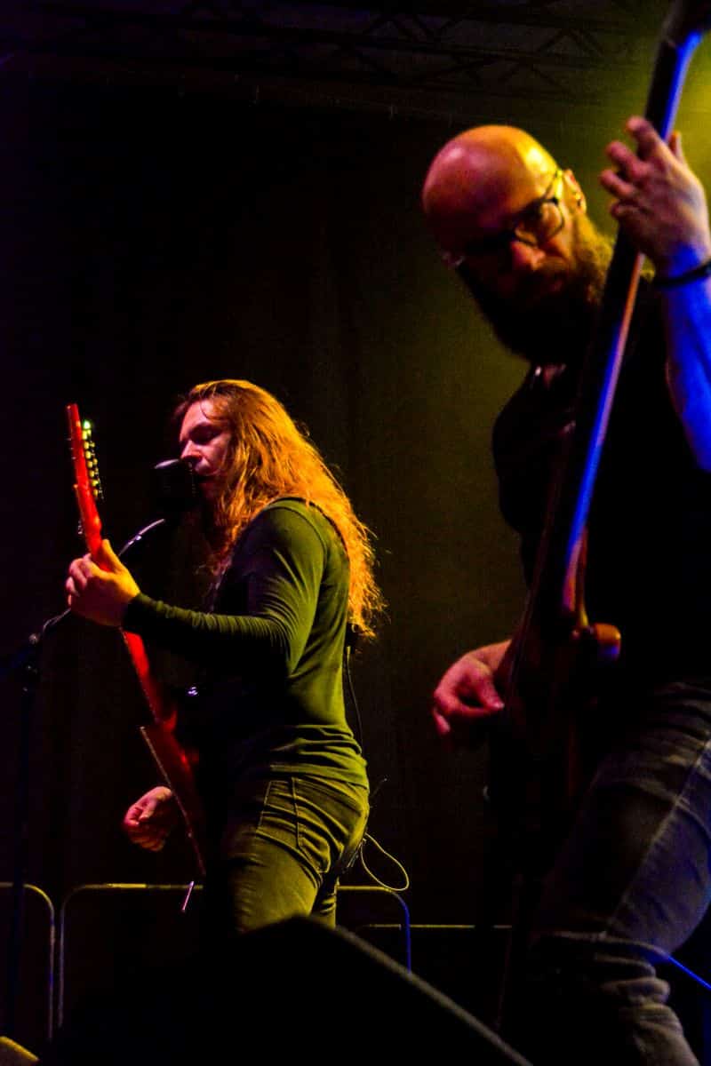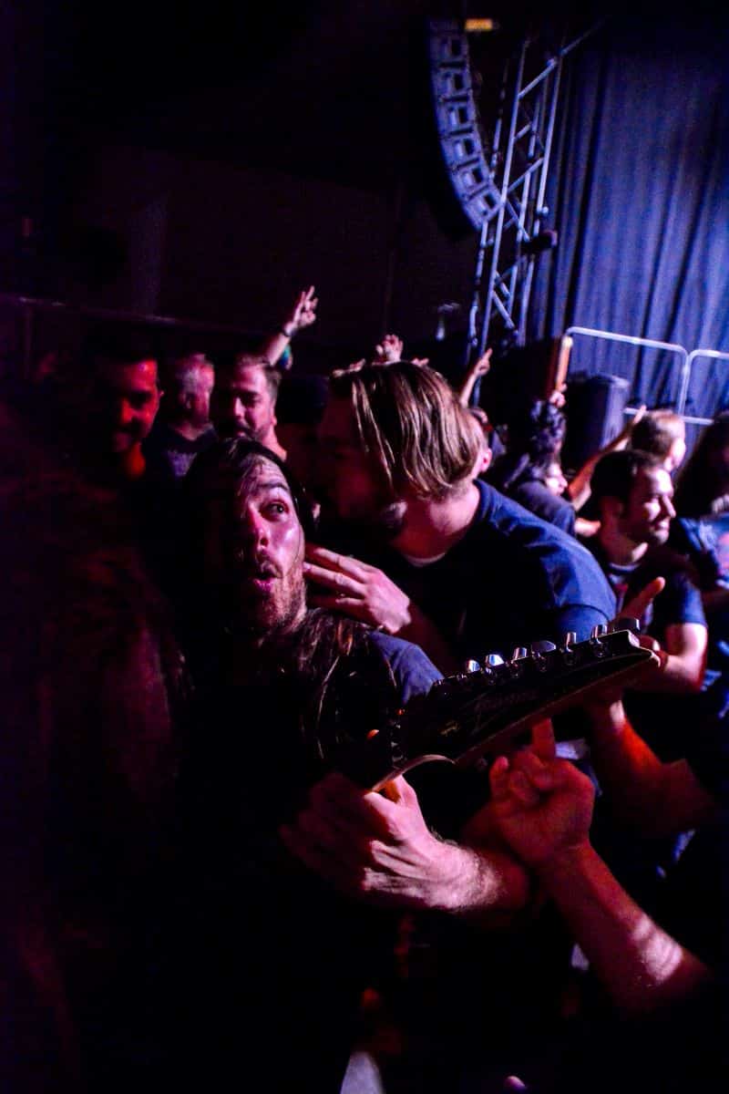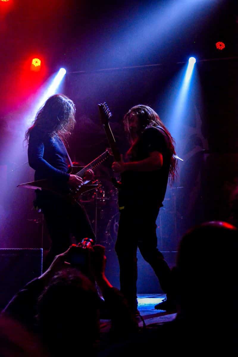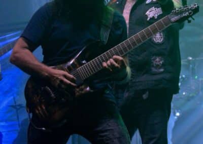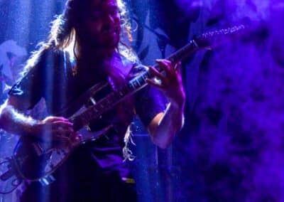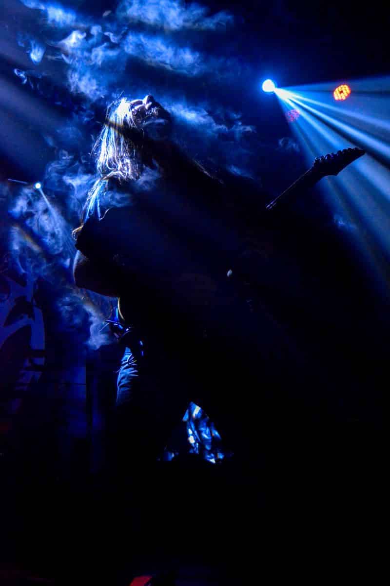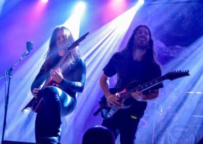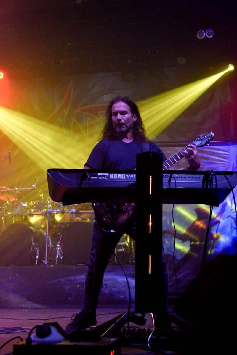 Átszerelés, és következett az est fénypontja, az Obscura. Lendületes nyitás – úgy, ahogy az Steffen-től megszoktuk –, és beindult a buli. A színpadon egy vérprofi gépezet működött, és maga az előadás tökéletesen ötvözte az élő fellépések erejét-dinamikáját-lendületét a felvételek komplexitásával és tisztaságával. Ugye most láttuk először az Obscura teljesen új konfigurációját, és amit ez a kvartett a színpadon művelt, azzal teljesen levett a lábamról. A zenekar szólógitárosa, Kevin Olasz – ne tévesszen meg senkit a vezetékneve, nincsenek magyar felmenői, legalábbis ő ragaszkodott ehhez a verzióhoz – egészen elképesztő dolgokat játszott egészen hajmeresztő technikával. Az extrém metal gitárzenéje és játéktechnikája nagyon sokat fejlődött az utóbbi évtizedek során: megjelent még ezer éve a tapping-elés, megjelent a hibrid pengetés is, de hogy valaki ezt a két eszközt egyszerre használja szólózás során, na, ez számomra újdonság volt. Német barátunk hihetetlen átéléssel játszott, tényleg élvezte azt, amit csinál, és közben mindennel foglalkozott, csak azzal nem, hogy az ujjai alól hogyan folynak ki a zeneileg is és technikailag is csodálatraméltó szólók. Tökéletes párost alkottak Steffen-nel, akinek a szerepe leginkább az ének és a kísérlet volt, bár egy pár bonyolultabb kiállás megvalósítását is magára vállalta. Érdekes volt nézni a pengetési technikáját, különösen a Suicidal Angels működése után: a görögök még az egészen extrémen gyors részeket is downstroke (csak lefelé) pengették – ehhez képest Steffen az Obscura skáláján közepesen gyorsnak minősülő részeket is váltott pengetéssel játszotta.