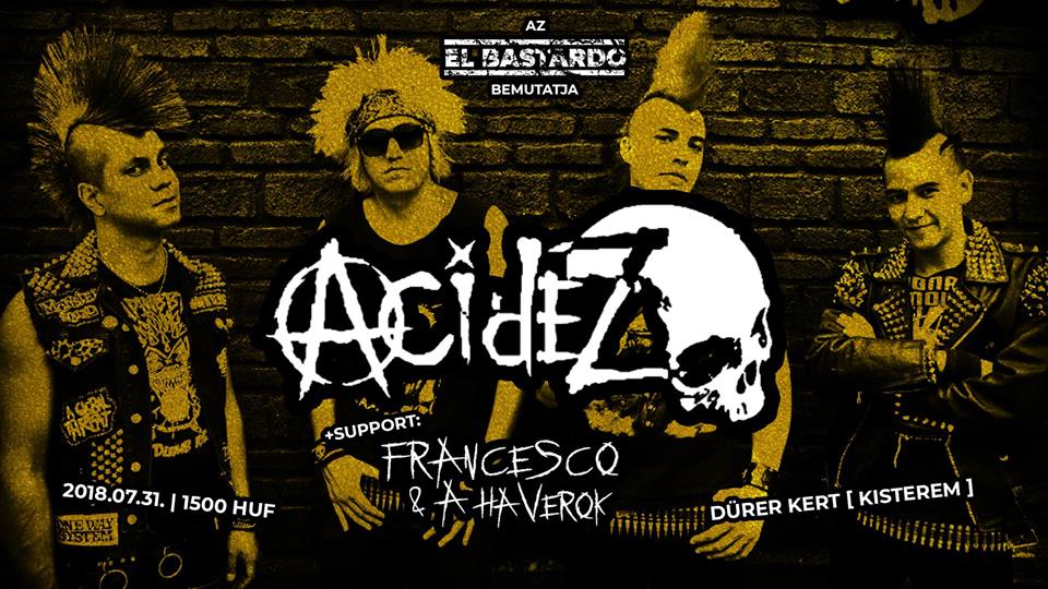 Létezik-e tökéletesebb lezárása a júliusnak egy Acidez koncertnél? A négytagú brigád július 31-én a Dürer Kert kistermében fog koncertet adni a fővárosi punk csapat, a Francesco és a Haverok társaságában.