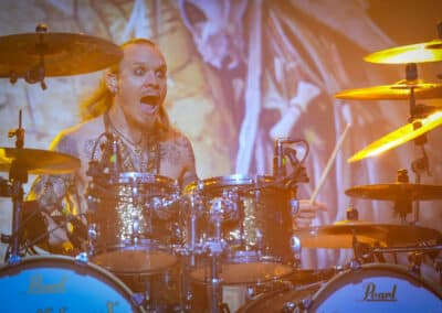 Az AWS koncertje közben felkészült a Korpiklaani, és hamar fel is csendült a népi hangszeres intrójuk, majd az énekessel az élükön, aki egy kézi perkussziós hangszert ütött (bocsi, nem tudom, milyen hangszer volt) fel is vonult a zenekar. Üdítő volt meghallani a folk-metal dallamokat finn dalszöveg kíséretében, ám gyorsan lerombolta az illúzióimat, amikor feltűnt, hogy Jonne Järvelä énekes mintha nem mindig tudná a szöveget, néha nem is szólt az éneke, és egyáltalán nem voltam benne biztos, hogy valamennyire is szomjas. Később kollégám fel is világosított, hogy bár én addig nem vettem észre a tömeg miatt, de Järvelä előtt egyébként egy tényleg gigantikusan bazinagy monitor van felállítva, amiről valószínűleg a szöveget puskázza. Hát na, van ilyen… de azért nekem sokat elvett a koncert élvezeti értékéből.