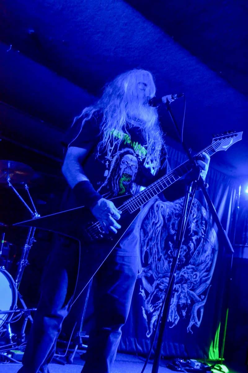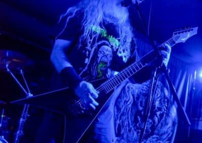 Újabb átszerelés, és az Incantation elkezdte bekészíteni saját magát. Számos, a műfajban etalonnak tekinthető fellépőhöz hasonlóan az amerikaiak is tulajdonképpen hobbizenekarként működnek: egy kisbusszal járják Európát, saját maguknak road-olnak, és mindezt elképesztően élvezik. Az Incantation bizonyos szempontból egyfős zenekar, bizonyos szempontból pedig egy tökéletesen összerakott gépezet, ahol nagyon rendben vannak az egyensúlyok: alapvetően ez egy egyszerű szerkezetű zene, ahol a dob a sebességet és a kísérletet biztosítja, és még véletlenül sem szeretne ennél sokkal több lenni. Az ősz hajú – ősz szakállú, fekete szemöldökű John McEntee a zeneírói, a kísérő gitárosi, az énekesi és a mókamesteri posztokon tolja előre a szekeret, és eközben jól láthatóan lubickol ebben a szerepben. Neki a fellépés nem meló és felelősség; azon már vélhetően évtizedek óta túl vagyunk, hogy elrontja-e vagy sem. Elökörködik és eldumál a közönséggel, és jókat röhög saját magán, amikor mondjuk véletlenül rossz számot konferál fel. A zavart egyébként egy teljesen prózai dolog okozta: a Cryptic Remains fellépéséből a színpadon maradt egy ventilátor, és ennek szele zavarta meg a májsztrót. Kicsit elbeszélgettünk vele a fellépés után, és mint kiderült, ő ilyenkor az egész folyamatra – azaz a fellépésre – egységében figyel, és ha ebből az állapotból valahogy kibillen, akkor megvan a baj. Jelen példában a ventilátor hűtötte, ami zavaró érzés, hiszen „itt harcolni kell, küzdeni és izzadni” – de ugyanúgy hasonló zavart okoz, amikor elkezd külön a gitárra vagy az énekre figyelni, ekkor azonnal elrontja a másikat, állította. Egyszerre viszont – osztott figyelemmel – tökéletesen megy minden, és valóban, tökéletesen ment is John barátunknak: a megszokott stílusában, lassú pengetéssel adta a kíséretet Luke szólói alá (aki akár a fia lehetne, bár az ilyesmit nem illik boncolgatni). Ilyenkor már-már kötelező jelleggel írom le, hogy ez micsoda örömzene, de nem nagyon tudok máshogy nyilatkozni arról, amikor valaki elképesztően bonyolult dolgokat angyali arccal, folyamatos vigyorral a képen játszik megállíthatatlanul… hát ha ez nem örömzene, akkor mi? A basszuskíséretet Chuck Sherwood szolgáltatta; tökéletesen illeszkedett a dallamhoz, ám nem csak egyszerűen egy oktávval mélyebben követte a gitárzene ívét, hanem egyedi ötletekkel hangsúlyozta a dallamvezetést. Majdnem másfél óra jutott az Incantation-re, de ez a 80 perc pillanatok alatt elrepült. Gyors, pörgős számok az életmű korai részére kihegyezve – a dalok java része a 90-es évekből valósi, az utolsó évtizedet összesen két tétel képviselte –  (Devoured Death, Shadows of the Ancient Empire, Lusting Congregation of Perpetual Damnation (Eternal Eden), Forsaken Mourning of Angelic Anguish, Twisted Sacrilegious Journey Into the Darkest Neurotic Delirium, Emaciated Holy Figure, Iconoclasm of Catholicism, Concordat (The Pact) I, Immortal Cessation, Carrion Prophecy, Profanation, The Ibex Moon, Impending Diabolical Conquest, Abolishment of Immaculate Serenity).