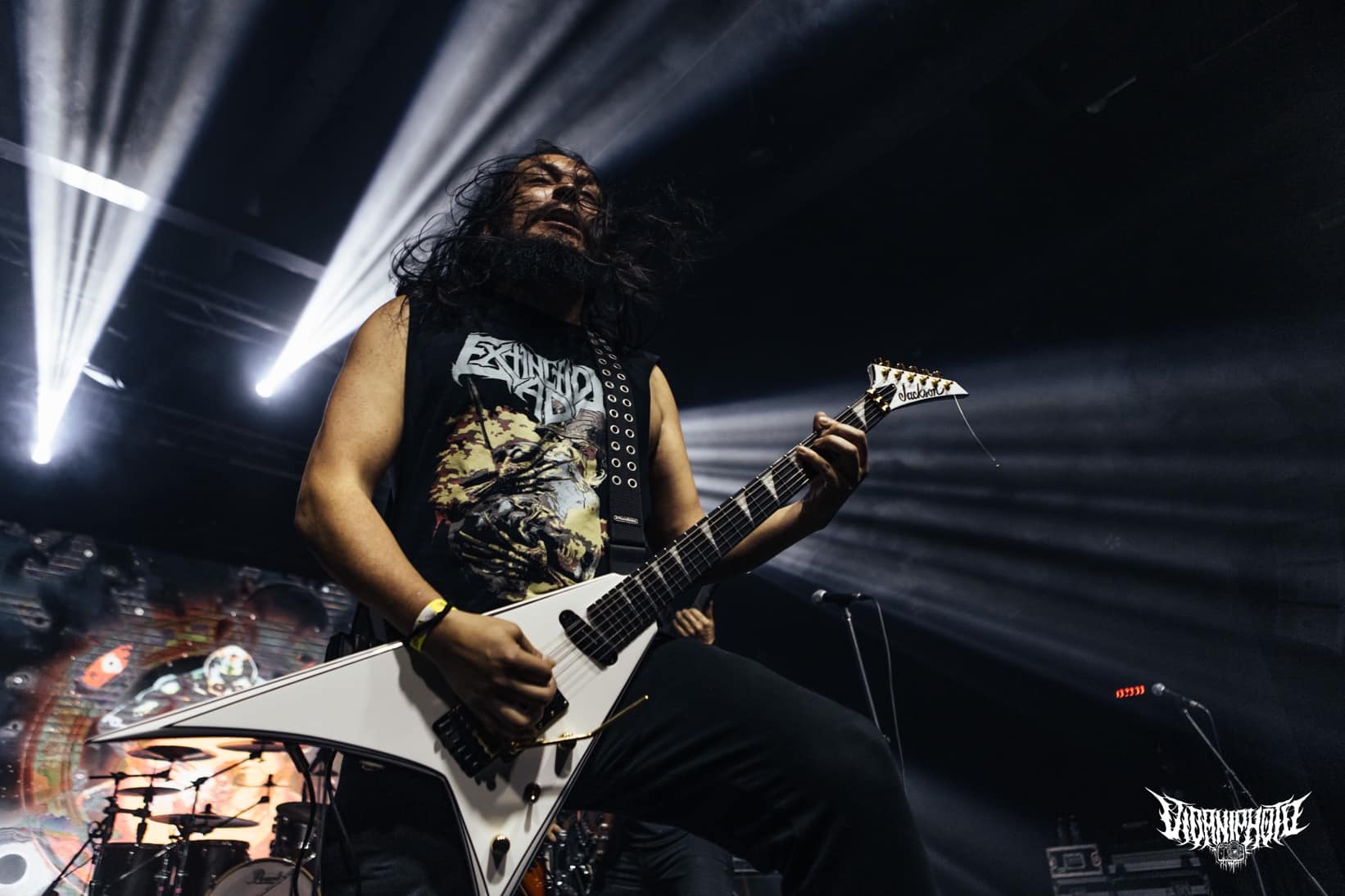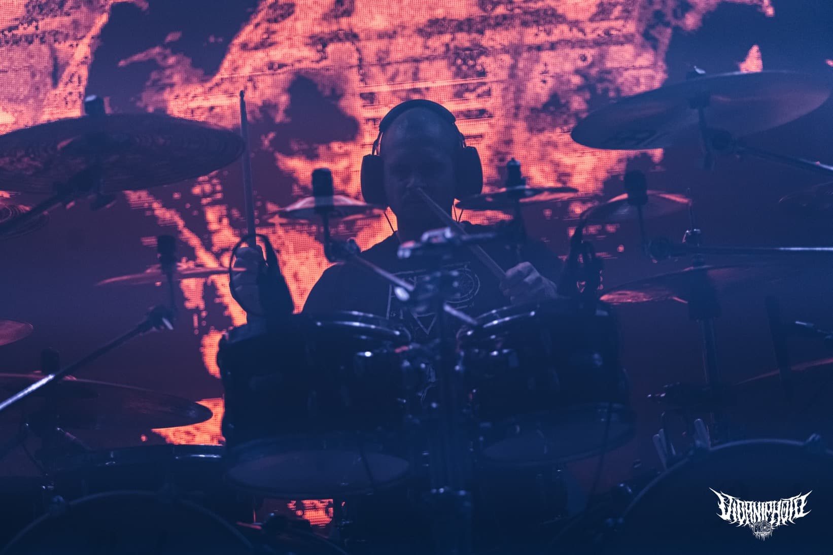 A háttérben a kivetítőn az új album háromarcú / body-horror húsoszlopa nézett vissza ránk, nem gyengén a Scorn című számítógépes játék lényeire / textúrájára emlékeztetve. (Amúgy a game zenéjét, egészen véletlenül Lustmord jegyzi). Már kezdem megszokni, elsőre pedig nagyon nem tetszett, aztán valahogy csak működött ezekkel a vörösre mázolt kereszt-fraktálokkal… Még nem beszéltem a hangosításról és a hangzásról: csillagos ötös munkát végzett a keverős, minden elismerésem érte. Az Ulcerate úgy szólt mint egy mozsárágyú. Kb. lemezminőségben szóltak a dalok és a hozzá illő technikai szinten lettek előadva, az élőzene minden varázsával együtt. Ehhez hasonló őrületes volumenű energiát idén februárban tapasztaltam ugyanitt, a Suffocation alatt.