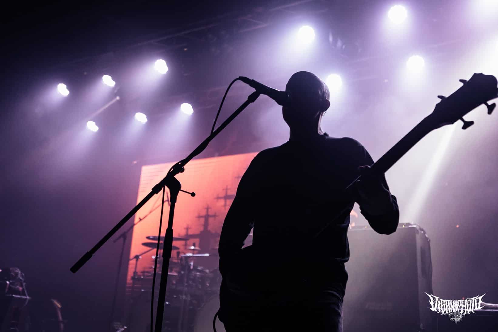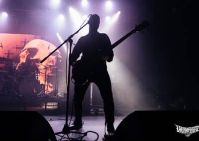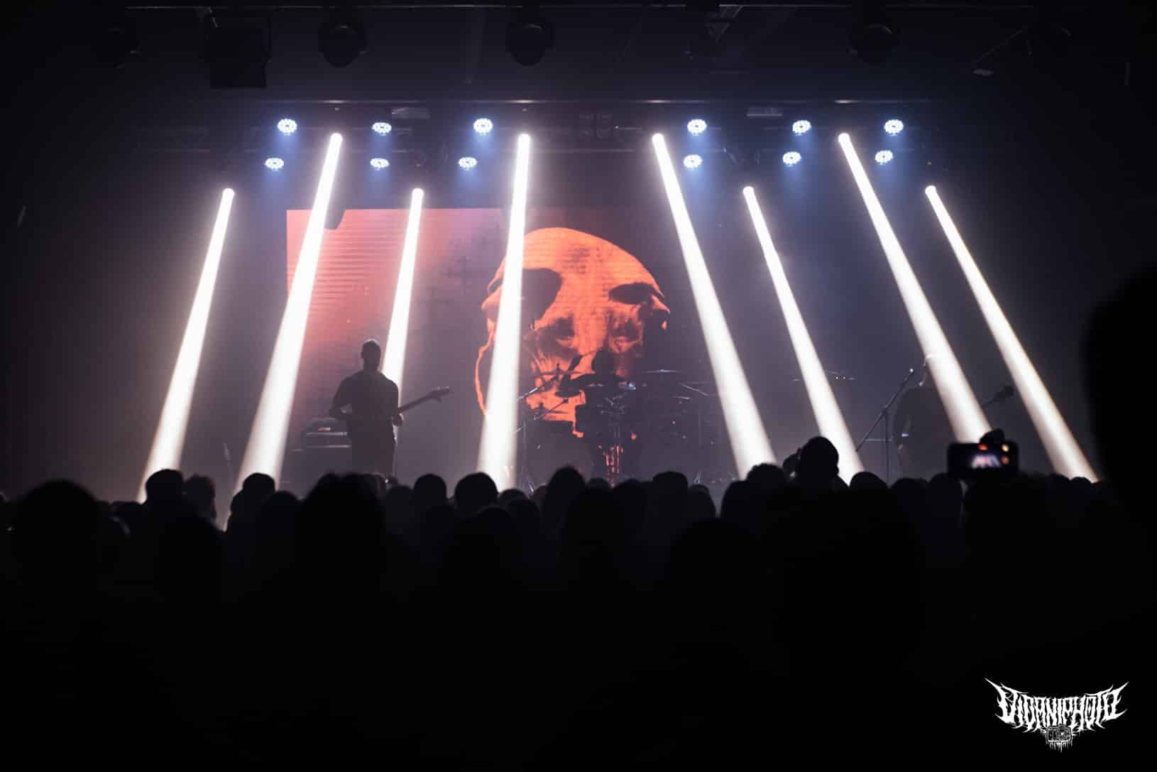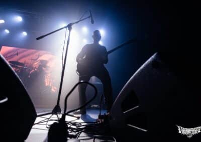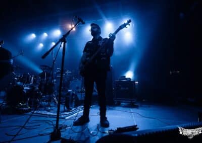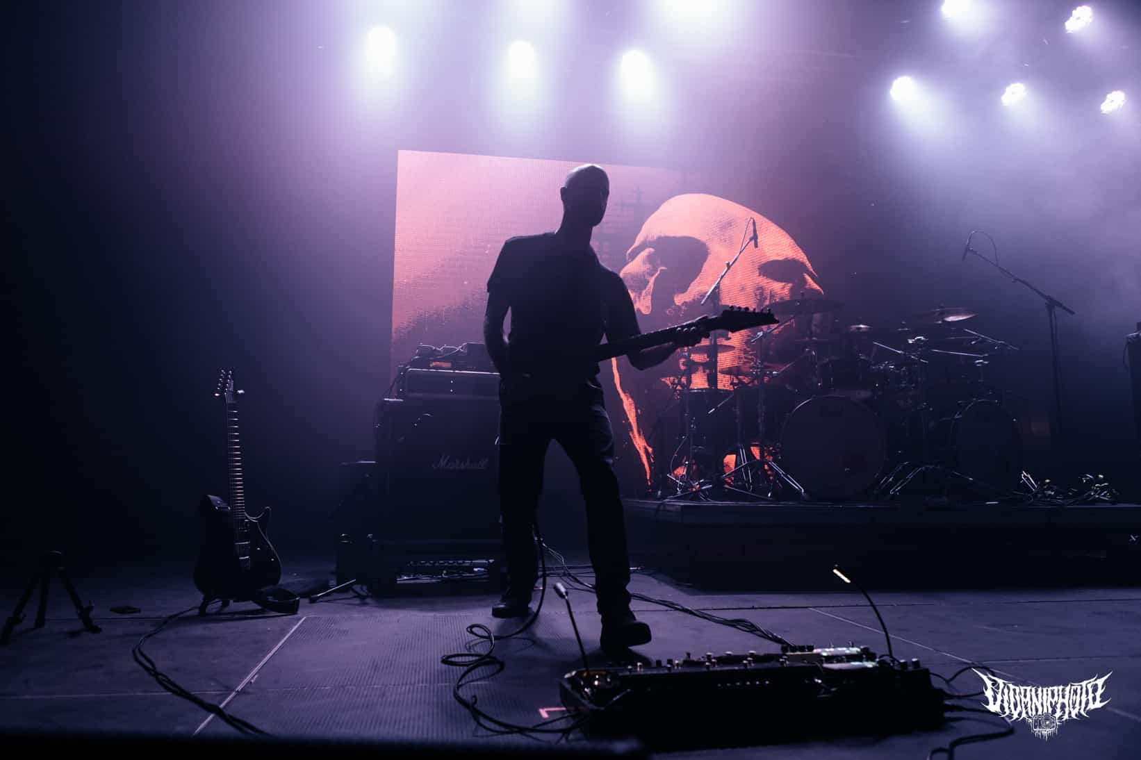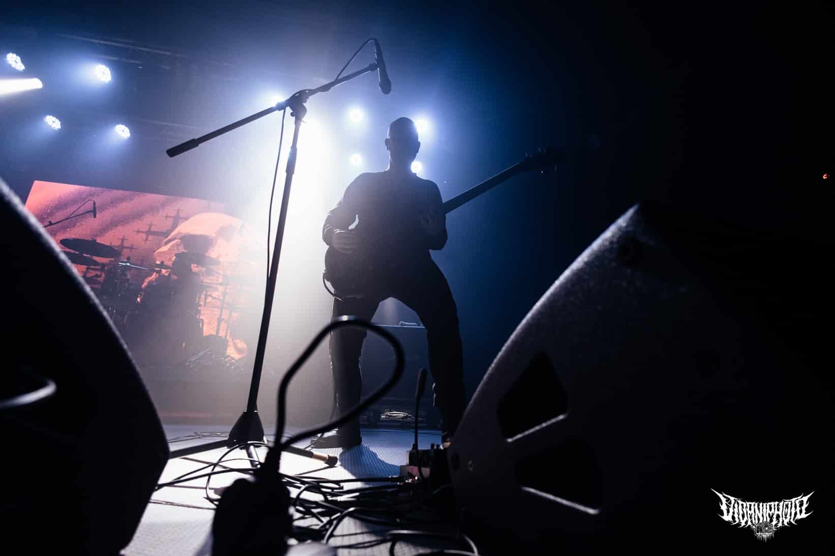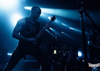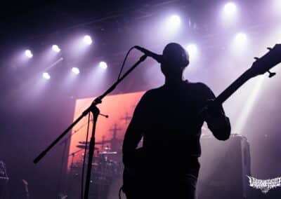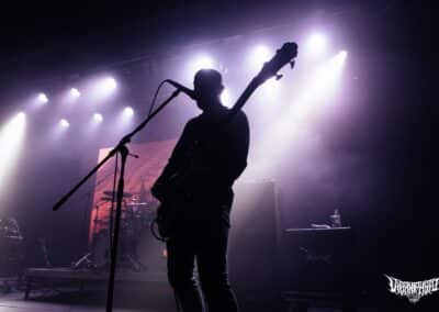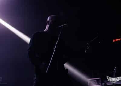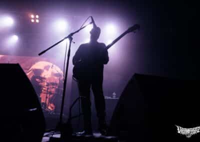 Újabb fejfrissülés következett, majd elfoglaltam helyemet a nézőtéren – szerencsére kényelemesen elfértünk, én olyan fél teremre saccolnám a nézőszámot, ami szerintem egy ennyire underground buli esetében egészen jó – majd egy teljesen másik világba csöppentem. Az Ulcerate, mint kiderült már harmadjára jár nálunk (teljesen megfeledkeztem a 2014-es Wormed és Gigan társaságában lezajlott buliről), én 2017-ben láttam őket először, akkor még a régi Dürerben. Utazásaim során rengeteg dark ambient zenét hallgatok, sok kedvenc van, a Lustmord az egyik, a Heresy, Rising és a Dark Matter albumokat különösen szeretem, újabban pedig a Trinity pörög. Egy olyan komoly kaliber esetében mint az Ulcerate, fontos egy bizonyos atmoszféra létrehozása, egy mindset, amihez elengedhetetlen elem a megfelelő “ráhangoló” zene. A Marduk is előszeretettel használ ambient-industrial introkat / átkötőket a blokkjai között, melyek többnyire az Arditi nevéhez fűzödnek. Általuk máshogy domborodik ki a zene éle. Máshogy hat. Az Ulcerate átszerelése közben, azt éreztem, hogy ez az “egész” mintha mindig is itt lett volna, mintha már láttam volna… rettentő ismerős és otthonos volt a táj, amit a háttérben megbújó hangok / morajok festettek. Nem kis meglepetésemre pontosan a Trinity album dalai duruzsoltak, Lustmord összetéveszthetetlen, kinematografikus soundja uralta a teret, egészen addig a pontig mígnem a To Flow Through Ashen Hearts kezdőtémája kezdett kibontakozni belőle.