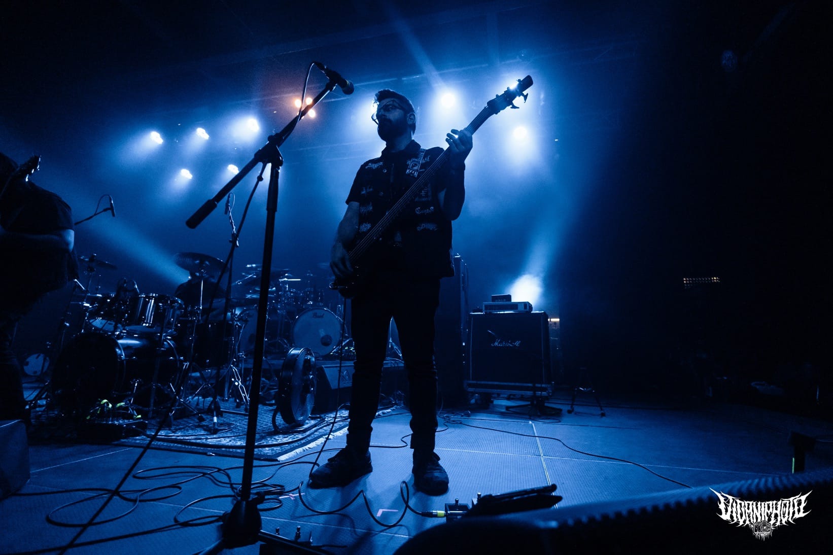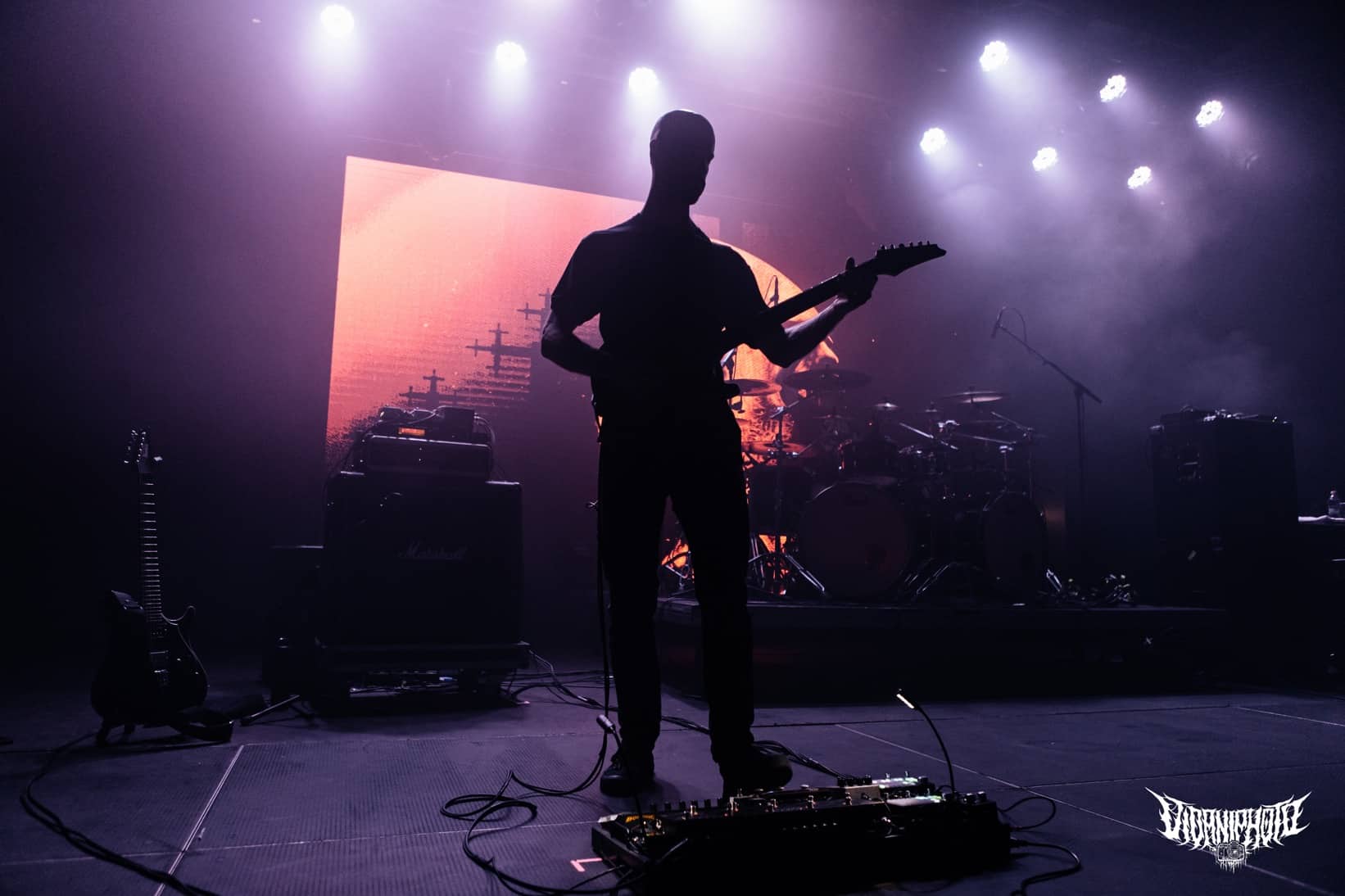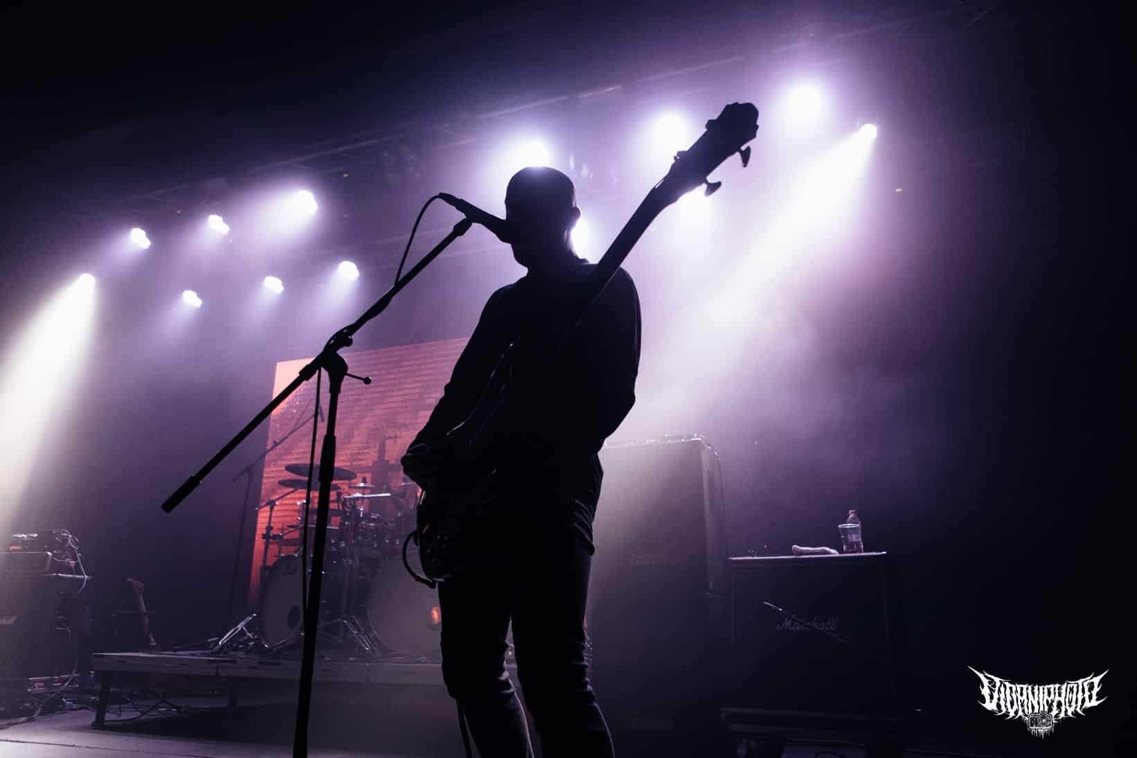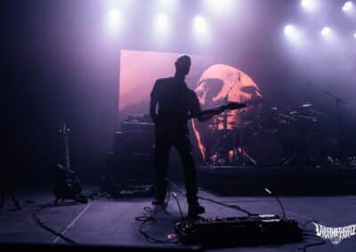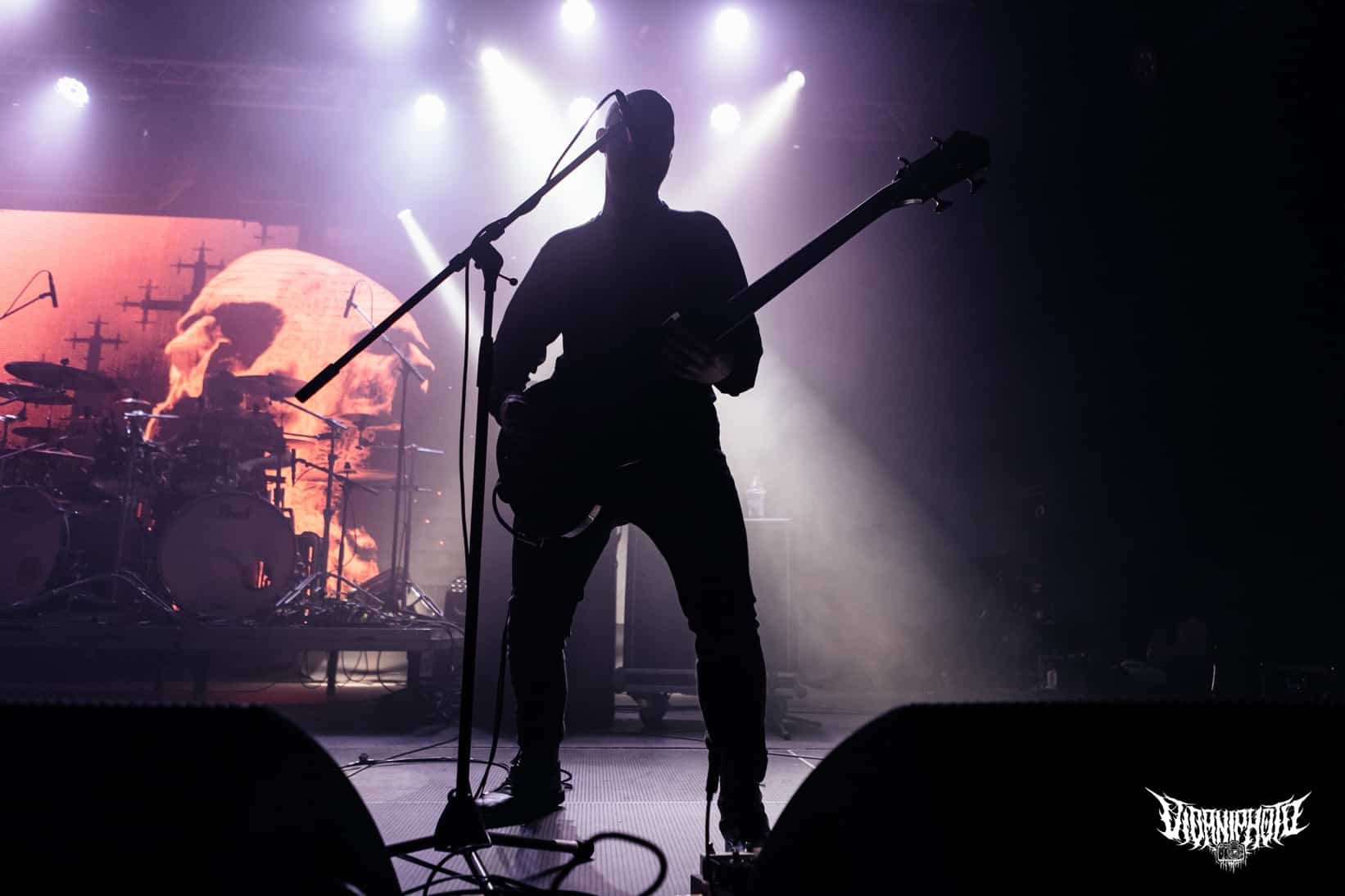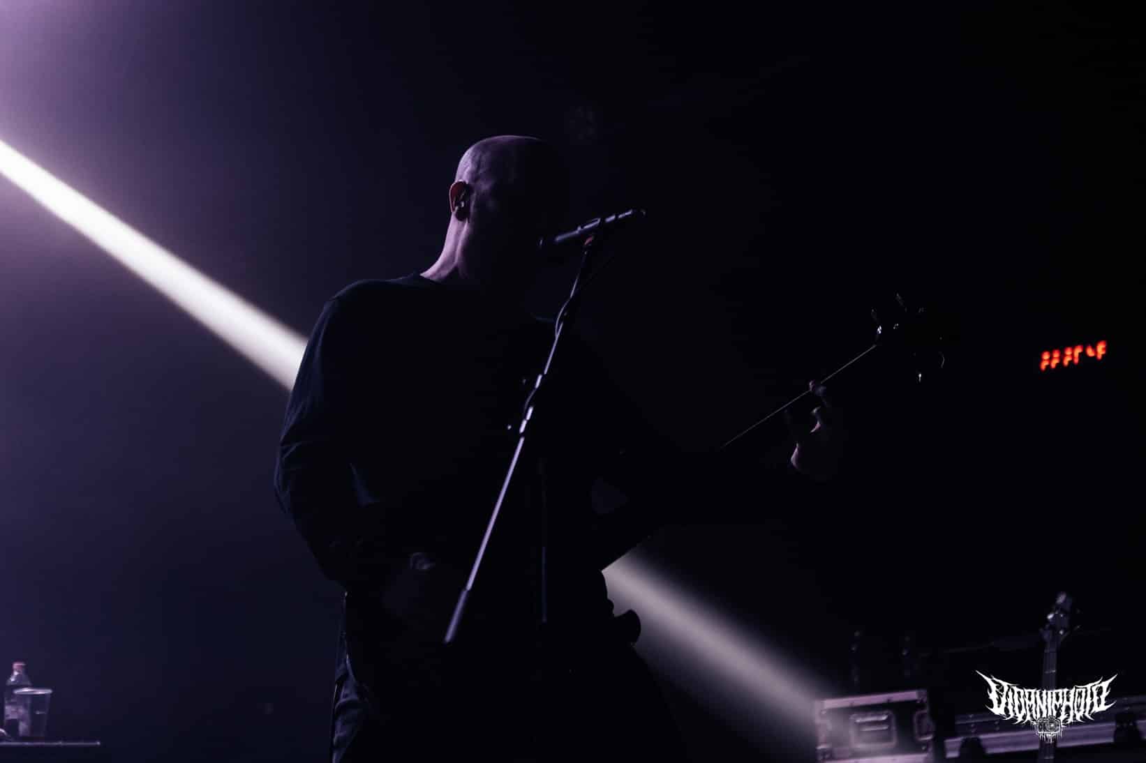 Újabb fejfrissülés következett, majd elfoglaltam helyemet a nézőtéren – szerencsére kényelemesen elfértünk, én olyan fél teremre saccolnám a nézőszámot, ami szerintem egy ennyire underground buli esetében egészen jó – majd egy teljesen másik világba csöppentem. Az Ulcerate, mint kiderült már harmadjára jár nálunk (teljesen megfeledkeztem a 2014-es Wormed és Gigan társaságában lezajlott buliről), én 2017-ben láttam őket először, akkor még a régi Dürerben. Utazásaim során rengeteg dark ambient zenét hallgatok, sok kedvenc van, a Lustmord az egyik, a Heresy, Rising és a Dark Matter albumokat különösen szeretem, újabban pedig a Trinity pörög. Egy olyan komoly kaliber esetében mint az Ulcerate, fontos egy bizonyos atmoszféra létrehozása, egy mindset, amihez elengedhetetlen elem a megfelelő “ráhangoló” zene. A Marduk is előszeretettel használ ambient-industrial introkat / átkötőket a blokkjai között, melyek többnyire az Arditi nevéhez fűzödnek. Általuk máshogy domborodik ki a zene éle. Máshogy hat. Az Ulcerate átszerelése közben, azt éreztem, hogy ez az “egész” mintha mindig is itt lett volna, mintha már láttam volna… rettentő ismerős és otthonos volt a táj, amit a háttérben megbújó hangok / morajok festettek. Nem kis meglepetésemre pontosan a Trinity album dalai duruzsoltak, Lustmord összetéveszthetetlen, kinematografikus soundja uralta a teret, egészen addig a pontig mígnem a To Flow Through Ashen Hearts kezdőtémája kezdett kibontakozni belőle.