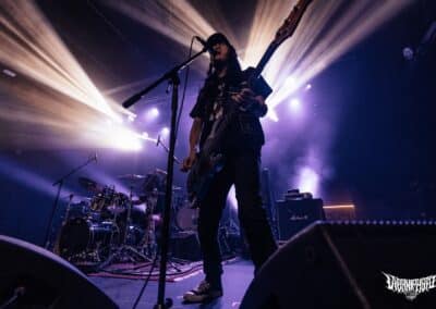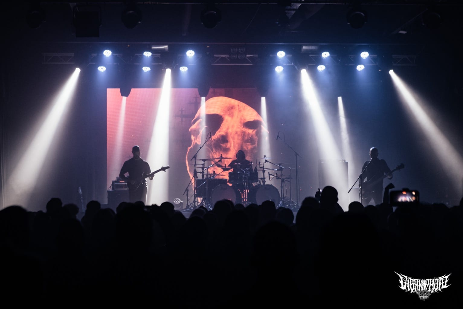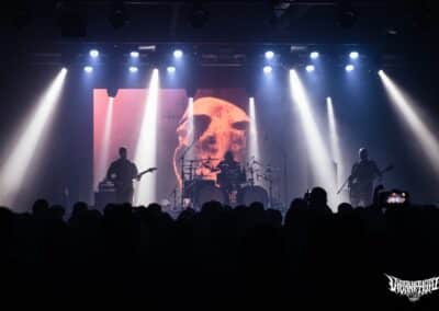 A 90 perces setlist az utolsó két albumra épült, bár nekem a szívem csücske a Vermis / The Destroyers of All kettőse, onnan bármit játszanak az arany, de nem akarok elégedetlennek látszani. A Stare into Death and Be Still és a Cutting the Throat of God rendkívűl sötét matériák, nehezen nyíló szelencék, sok – sok odafigyelést igényelnek, nem fognak egyből hatni. Élőben az ezekről játszott számok őrületes erővel taglózták le az embert, nem is tudom, mikor éreztem utoljára ilyet. Az atmoszférikusabb / progosabb részekkel szinte az űrbe lőttek ki bennünket, volt, hogy teljesen álomszerűvé vált az egész, de végig ugyanabban a jellegezetes szférában maradva, ami csak őket jellemzi. Jamie Saint Merat mellett ki kell emelnem, Michael Hoggard gitárosukat, aki az évek során rengeteget fejlődött. Eddig sem volt egyszerű nyomonkövetni amit ő játszik, de több gitár-layerben gondolkozik, önmagához képest színesebben penget – már amennyire be tud engedni a karmazsin vörös és obszidián feketén kívűl bármit is ez a muzsika magába. Paul Kelland basszeros / énekesről se feledkezzünk meg: kinézetre mint egy fizikaszakos tanár vagy vegyészmérnök, de ami orgánum ami kijön a torkán, attól ökölbe szorul a kezed. Érzed a keserűséget. Érdekes, hogy több lett most a visszhang a vokáljain az utóbbi albumokon, több benne a düh és az érzelem is, élőben remekül hozta ezt, nem volt benne hiba. Inkább hangulati elem az ének sok helyen, nincs túltolva. Azért az olyan elementáris horderejű nótákat hallani élőben, mint a Further Opening the Wounds, The Dawn Is Hollow, a Dissolved Orders (!) vagy a Stare Into Death and Be Still az egy leírhatatlan élmény. Ezen ott kell lenned fizikálisan, a tudatod / pszichéd pedig úgy mozog, ahogy akar illetve amerre a trió mozgatja… Az újlemezes dalok szinte egybeolvadtak a Stare Into Death and Be Still album számaival, elképesztő koherenciát létrehozva. Zárásként ismét megkaptuk az Everything Is Fire súlyos címadóját, fel sem fogtam, hogy másfél óra ilyen gyorsan eltelt.