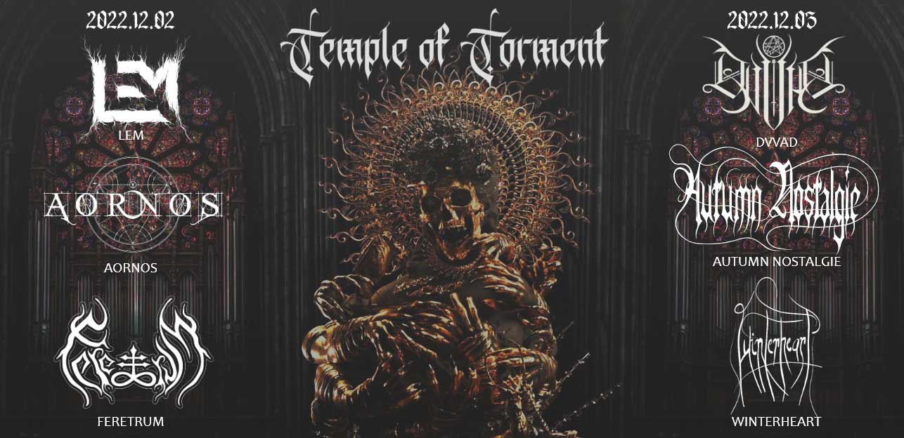 December 2-ától és 3-áig terjedően hiánypótló, és itthon egyedinek számító eseményre kerül sor Szegeden, a Városi Rock Klubban, Temple of Torment néven az Emphera Booking szervezésében. Magyar előadókat felsorakoztató kétnapos black metal mini fesztivál várja a műfaj elkötelezett rajongóit. Az időben kiterjesztett zenei programon kívül italakciók és tombola is gondoskodik a mini fesztivál hangulatról, a merch gyűjtők igényeit pedig az eseményen részvételi szándékát jelző Metal Ör Die Records hivatott kiszolgálni. Hat underground zenekar biztosítja a sötét fellegek által beárnyékolt szórakozást, a műfaj jelentősebb irányzatait lefedve.