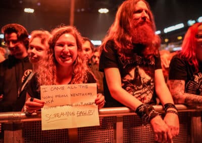 A hatalmas arénát megközelítve már hallottuk az utcai árusok és merchpult felől bömbölő előhangoló Sabaton lejátszási listát, és hamar rettentő tömegben találtuk magunkat. A bejárat előtt kettészakadtunk, mivel a dán nyelvű legutóbbi, instrukciókat tartalmazó e-mailből azt bogarásztuk ki, hogy a fotósok a B-szektorban mennek be, az újságírók pedig az A-ban. Elindultam az A-bejárat felé, és kisebb szívszélhűdéssel konstatáltam a kígyózó kilométeres sort, de aztán szerencsére előre tudtam ügyeskedni. Itt a biztonsági őr néni mindenáron ki akarta velem dobatni a frissen vett ételeimet, én pedig mindenáron ragaszkodtam hozzá, hogy márpedig dolgozni jöttem és biztos, hogy nem dobom kukába a vacsorámat és másnapi reggelinket. Miután a vitánk nem vezetett célra az után sem, hogy kézzel-lábbal mutogattam neki a ‘Presse’ feliratot a jegyemen és a sajtós szalagot a csuklómon, hívta egy kolléganőjét, aki már tisztábban látszott érteni a problémámat, és nagyon segítőkészen és empatikusan megmutatta, hogy ugyanott kellett volna bemennem, mint Kristófnak, bár a jegyemre nem az a bejárat van írva. Így megkönnyebbültem, és itt már a lehető legsimábban jutottam be a sajtószobába, ahol a fotósok már éppen indultak a körbevezetésre. Kaptunk egy nagyon cuki kis szobát szekrényekkel, ahova elhelyezhettük a táskáinkat és kabátokat, valamint még kávét és teát is ihattunk. (De nem ittunk.) (Csak elcsentem egy teafiltert szuvenírnek.) A helyiségbe beengedő biztonságiőr az egyik legkedvesebb volt, akivel valaha találkoztam, és ez szinte mindenkire igaz, akivel itt kapcsolatba léptünk.