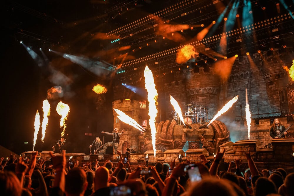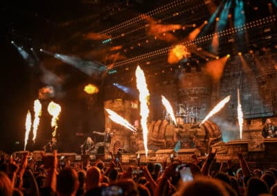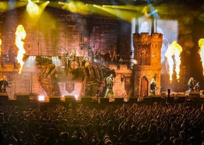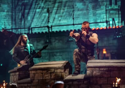 Közben leereszkedett egy hatalmas híd a kisebb emelvény és a színpad között, amelyen több szám alatt is tudtak oda-vissza közlekedni a zenészek. Az első két dalt, ami a Templars és a The Last Stand voltak, követően ismét megjelent Dzsingisz kán a színpadon, és felvezette a Hordes of Khan című számot. Az összesen 19 számos szett során többször is megjelentek a hadvezérek előadni pár dialógust a dalok között. Ez néha arra is szolgált, hogy a Sabaton tagjai teljesen át tudjanak öltözni – ezt egyszer mondjuk egy szempillantás alatt tették meg, máig nem tudom, hogyan. A díszlet és a showelemek jelentős részét képezte a pyrotechnika, sok-sok tűz, tűzijáték, robbanások, majd megjelentek ágyúk is, és ezeket szintén elsütötték. A Stormtrooper című számnál különösen sok volt a tűzijáték, és még bombákat is bevetettek. Egyébként ez a szám volt az egyik, ami a legjobban tetszett nekem a koncerten.
