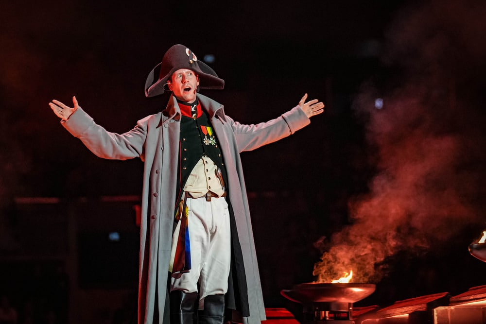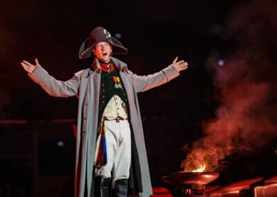 Az átszerelés után a Sabaton nem csapott egyből a húrok közé, mint ahogy a legtöbb zenekartól megszokhattuk. A díszlet nem igazán változott, csak eltűnt a könyv és megjelent a dobszettet tartó három hatalmas kéz. A küzdőtéren álló közönség tagjai között, a hangos-fényespult mögött felállítottak egy kisebb színpadot, és itt kezdte meg előadását a Sabaton. Felvillant a fejfény, és megjelent a kisszínpadon Napoléon Bonaparte, aki bele is kezdett önfényező, komikus monológjába. Nem sokkal később csatlakozott hozzá Julius Caesar, majd Dzsingisz kán, végül templomos lovagok is. A történelmi személyek elkezdtek egymással vitatkozni, kakaskodni, Cézárt le is szúrták (micsoda traumafelszakítás). Ez az egész színjáték több mint negyedóráig tartott, és őszintén kezdett kicsit kellemetlen lenni nekem. De aztán végre felvonult a kisszínpadra néhány, fáklyákat tartó templomos, akik egyszer csak hangszereket kaptak a kezükbe, és lerántották magukról a leplet, azaz a sisakot: ők maguk a Sabaton-tagok voltak. Hannes Van Dahl dobost kihagyták a buliból, hiszen ő már a színpadon várta a kisműsor végét, hogy elkezdhesse ütni a dobokat az óriáskezek ölelésében. Két dalt ezzel a távolságtartó felállással adtak elő.