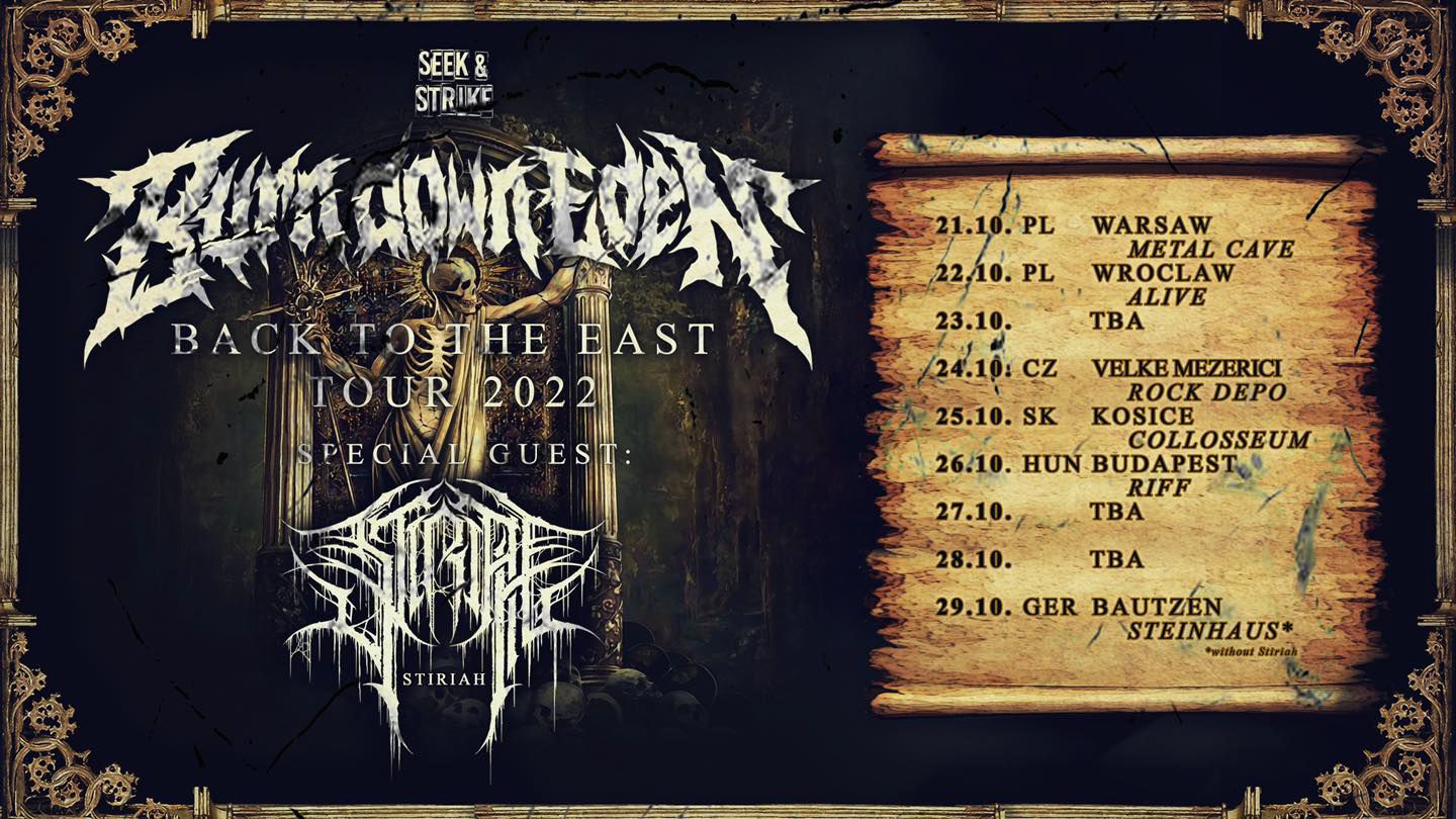 Október 26-án, a Sepultura fellépésével egy napon igazi zenei csemegében lehet részük azoknak, akik pörgősebb, dallamos zúzás hívei – aznap ugyanis Burn Down Eden fellépés lesz a Riff-ben. A Burn Down Eden egy ötfős metál brigád Németországból, amelyik a brutalitást, a harmóniát, a technikai elemeket és a kifinomult szövegvilágot ötvözve festi meg az emberiség csúf tükörképét. A bandát három barát, Tom, Jules és William alapította 2012-ben, a lengyel határtól nem messze található Forst nevű városkában. Punk rock gyökereikre építve fejlesztették képességeiket, olyan együttesektől merítve inspirációt, mint az Iron Maiden, a Slayer, a Wintersun, a Children of Bodom és a Darkest Hour. A zenekar Robert (dob) és Niklas (basszusgitár) csatlakozásával vált teljessé. Az eredmény dühöngő, ám dallamos death metál lett; haraggal teli svéd riffek démoni örvénye, gyors, technikás szólók, kíméletlen, impulzív dobolás, groove-os basszusjáték és őszinte, kritikus dalszövegek elegye, amiben a régi In Flames, az At the Gates és a The Black Dahlia Murder rajongói sok örömüket fogják lelni.