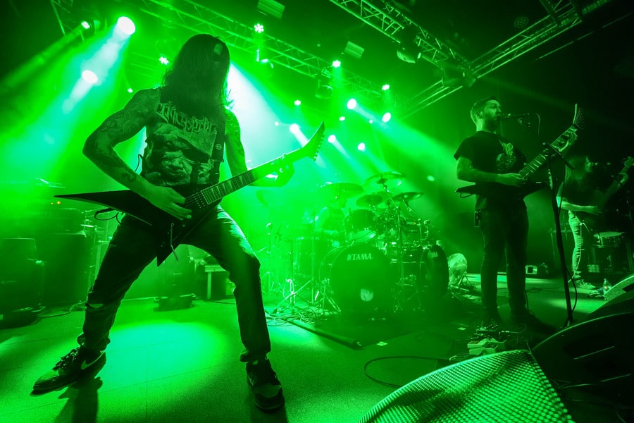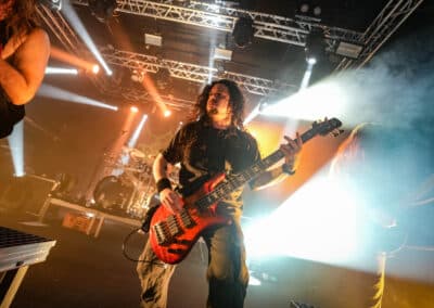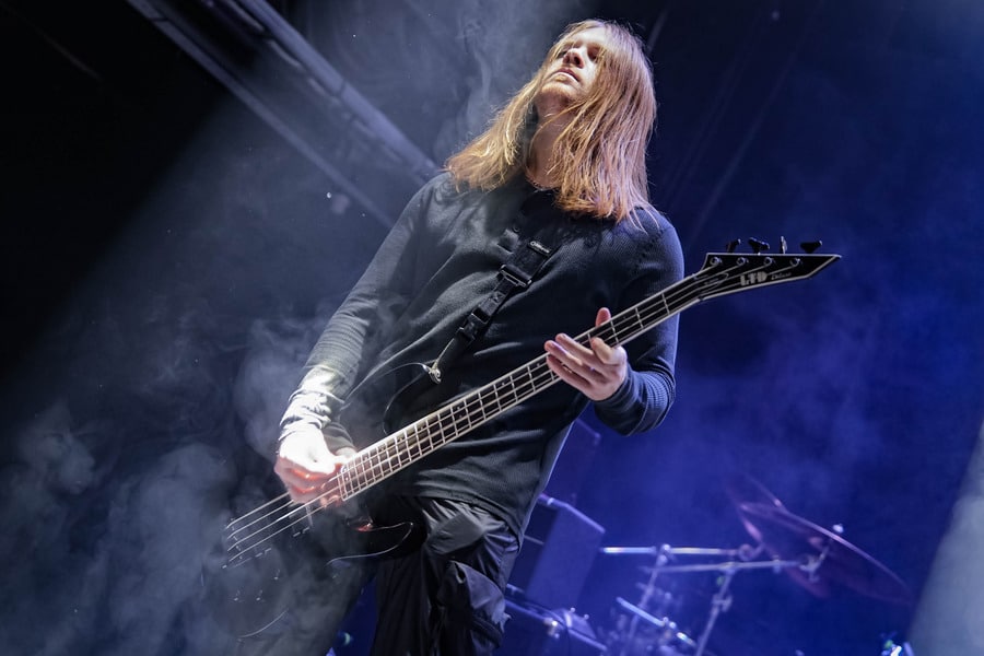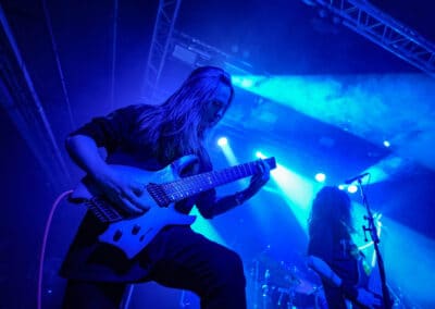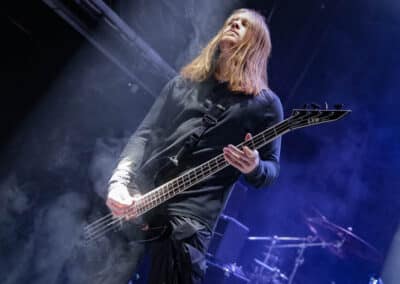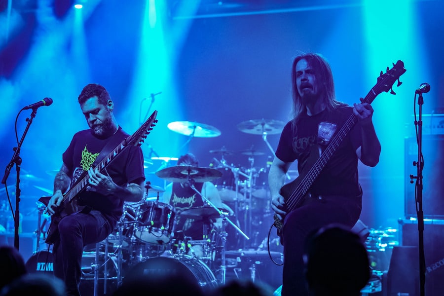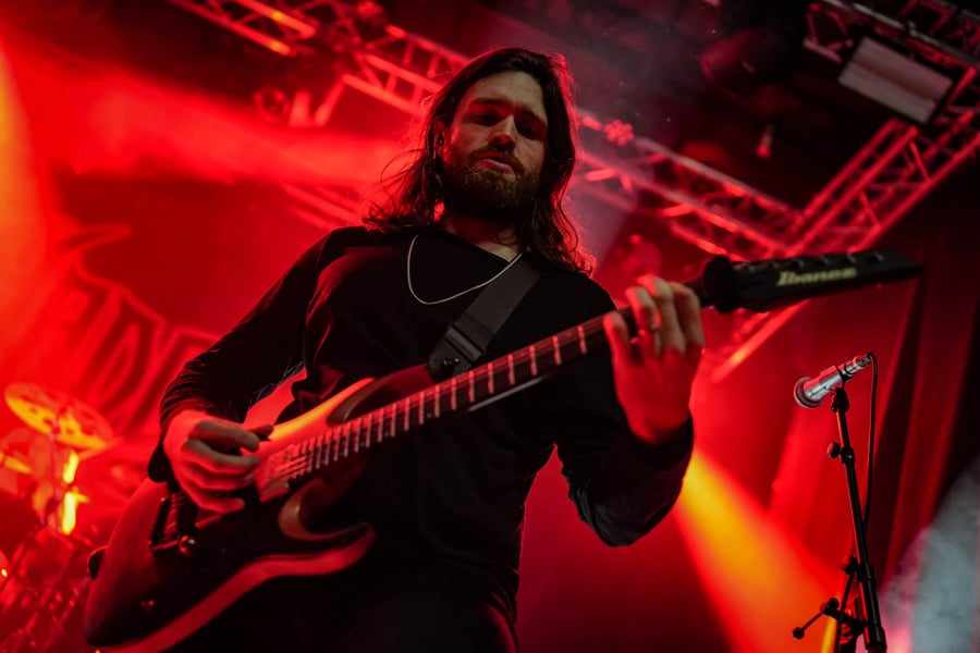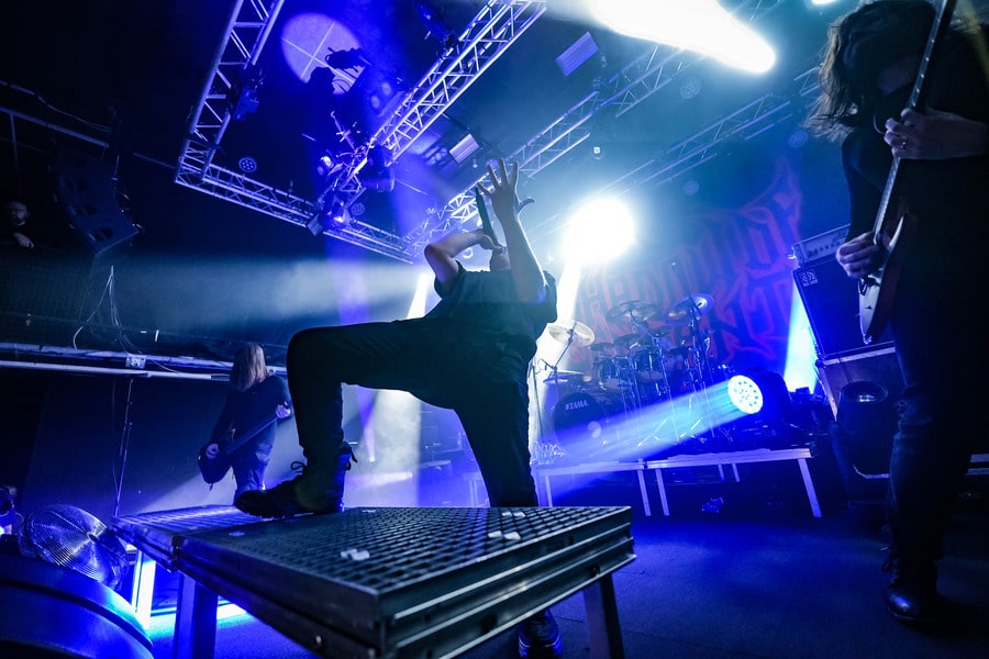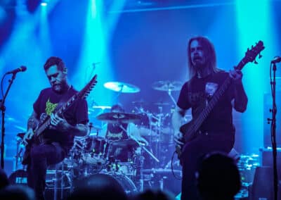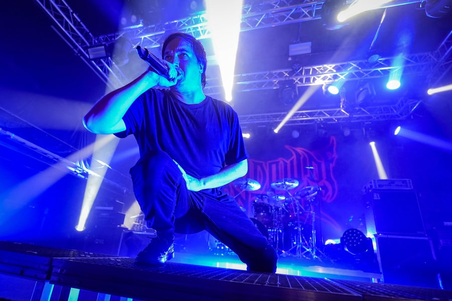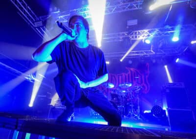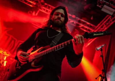 A harmadik zenekar, érkezésünk fő oka a szintén amerikai Shadow Of Intent volt, akik kicsit modernebb köntösben hozták el a deathcore darálást. Az első észrevételem egy nagyon kívülálló gondolat volt, mégpedig az, hogy amint megjelent az énekes a színpadon, azt kérdeztem magamban, „ez nem a Samu a Heedless Elegance-ből?”… Nem, valószínűleg nem ő volt, sokkal inkább Ben Duerr a Shadow of Intentből. Vagy közelebbről megnézve lehetett volna Kovácsovics Máté a Mudfieldből is… Maradjunk Bennél, aki szuper frontember, hanyag eleganciával (!) és hörgési technikák széles skálájával közvetíti az összes dühöt, ami felgyülemlik benne. A mély growloktól kezdve a magas screameken át egészen a Donald-kacsa-hörgésig mindent alkalmaz. Bryce Butler dobos is kitett magáért, hihetetlen pontossággal ütötte a technikás, baromi gyors dobtémákat, és közben fejeket vágott – iszonyú cuki egy ember.