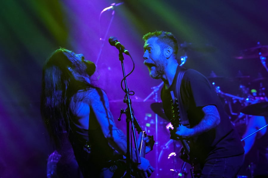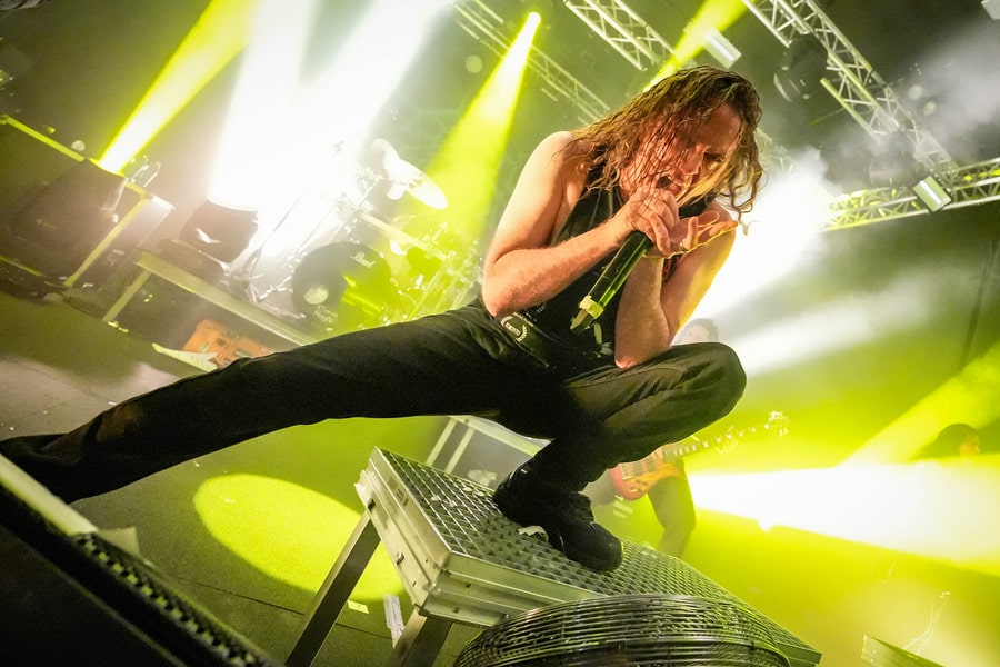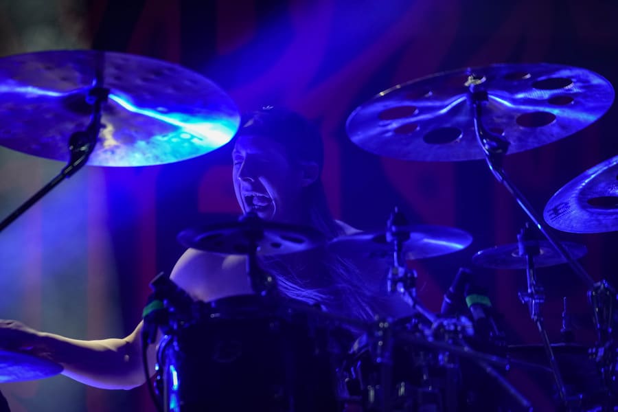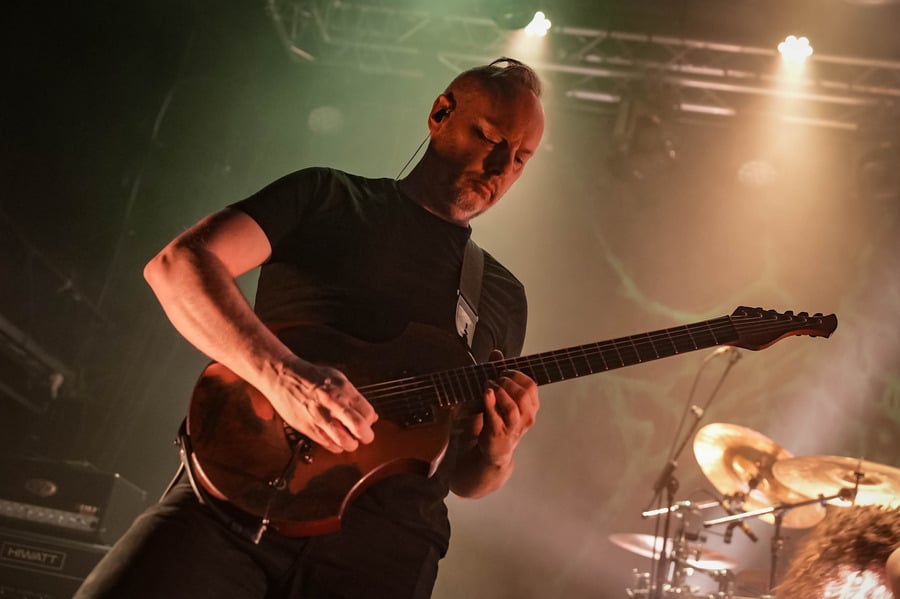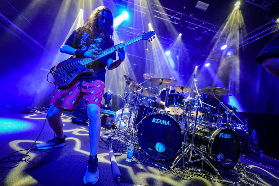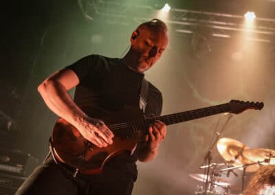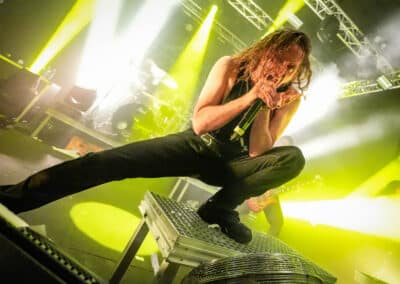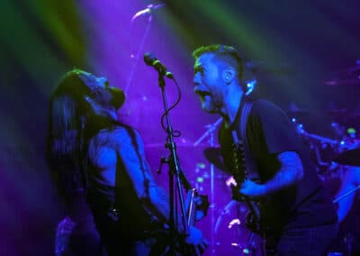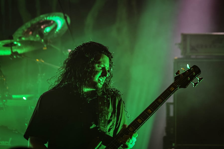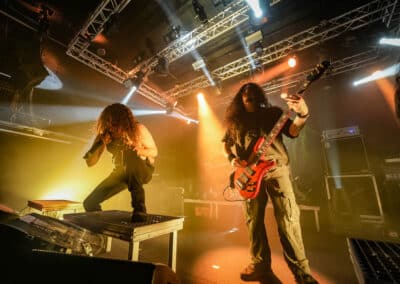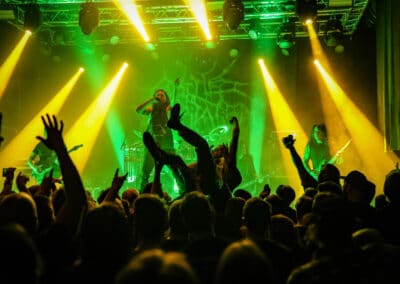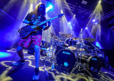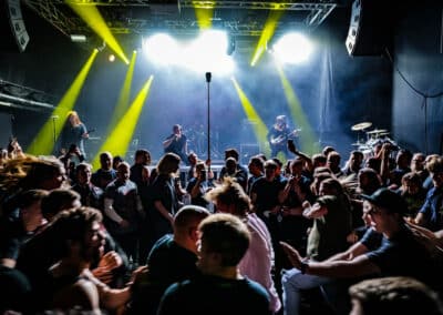 A harmadik zenekar, érkezésünk fő oka a szintén amerikai Shadow Of Intent volt, akik kicsit modernebb köntösben hozták el a deathcore darálást. Az első észrevételem egy nagyon kívülálló gondolat volt, mégpedig az, hogy amint megjelent az énekes a színpadon, azt kérdeztem magamban, „ez nem a Samu a Heedless Elegance-ből?”… Nem, valószínűleg nem ő volt, sokkal inkább Ben Duerr a Shadow of Intentből. Vagy közelebbről megnézve lehetett volna Kovácsovics Máté a Mudfieldből is… Maradjunk Bennél, aki szuper frontember, hanyag eleganciával (!) és hörgési technikák széles skálájával közvetíti az összes dühöt, ami felgyülemlik benne. A mély growloktól kezdve a magas screameken át egészen a Donald-kacsa-hörgésig mindent alkalmaz. Bryce Butler dobos is kitett magáért, hihetetlen pontossággal ütötte a technikás, baromi gyors dobtémákat, és közben fejeket vágott – iszonyú cuki egy ember.