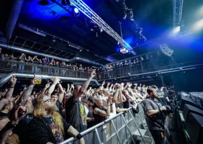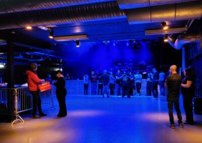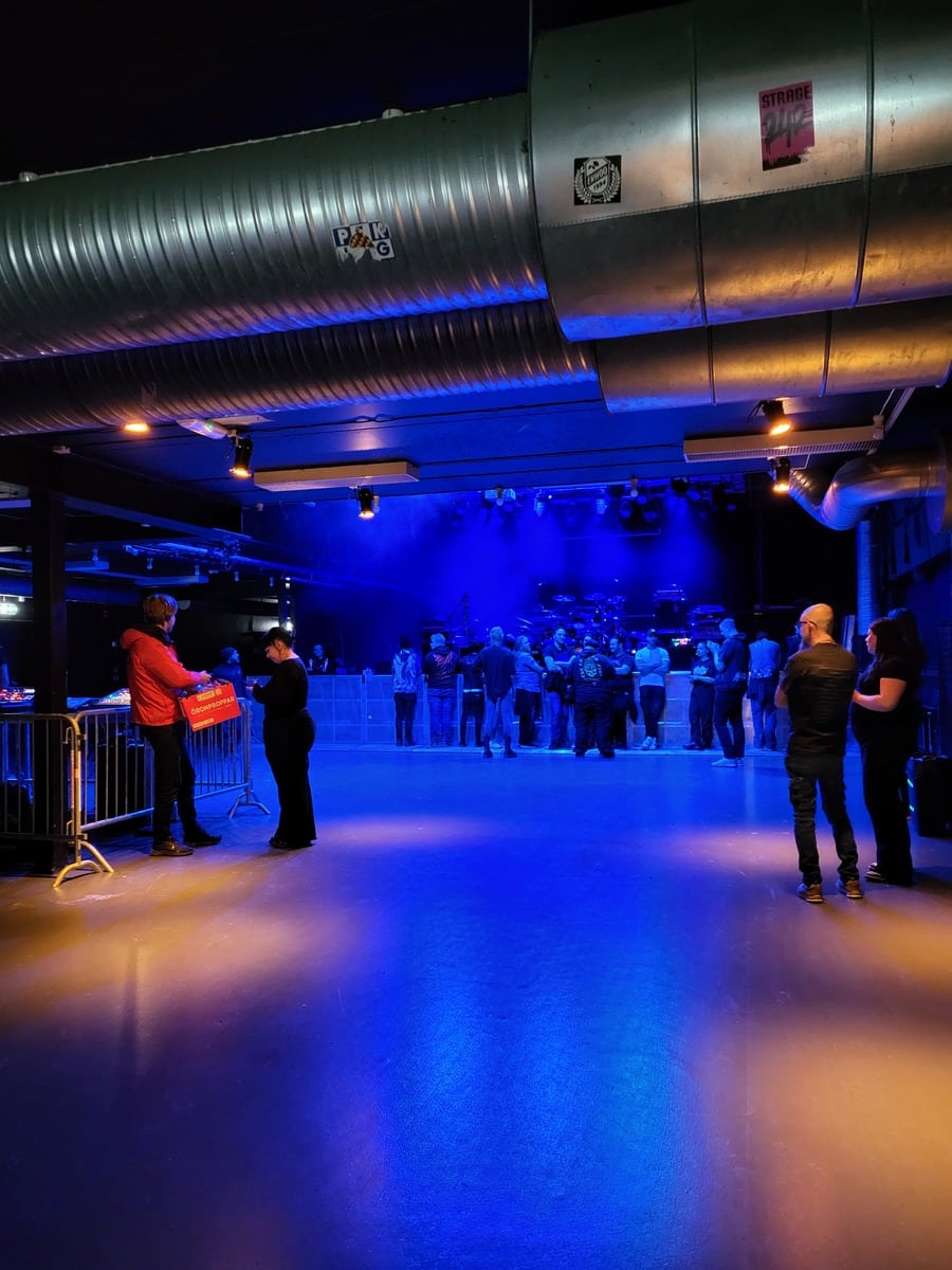 A Fryshuset koncertterme közepesen nagy, talán picit lehet kisebb, mint mondjuk az Analog Music Hall nagyterme. Emeletes, alul van a színpad, mosdók, felül erkély, italpult, pár állóasztal. Konkrétan ennyi, nincs túltolva a berendezés. Nekem emiatt egy kicsit rideg is volt az egész. A színpadtól balra található egy koedukált mosdó, ahova a backstage–színpad útvonalát keresztezve jutsz el, szóval néha a pakoló zenészeken át szlalomozol… Ez kicsit furcsán van megoldva, de persze én csöppet sem bántam. Itthon még koedukált mosdót sem láttam, úgyhogy ettől picit zavarba jöttem, de amúgy menő. A wc-kben van radiátor, a csapokból jön rendes melegvíz.