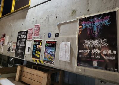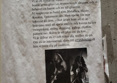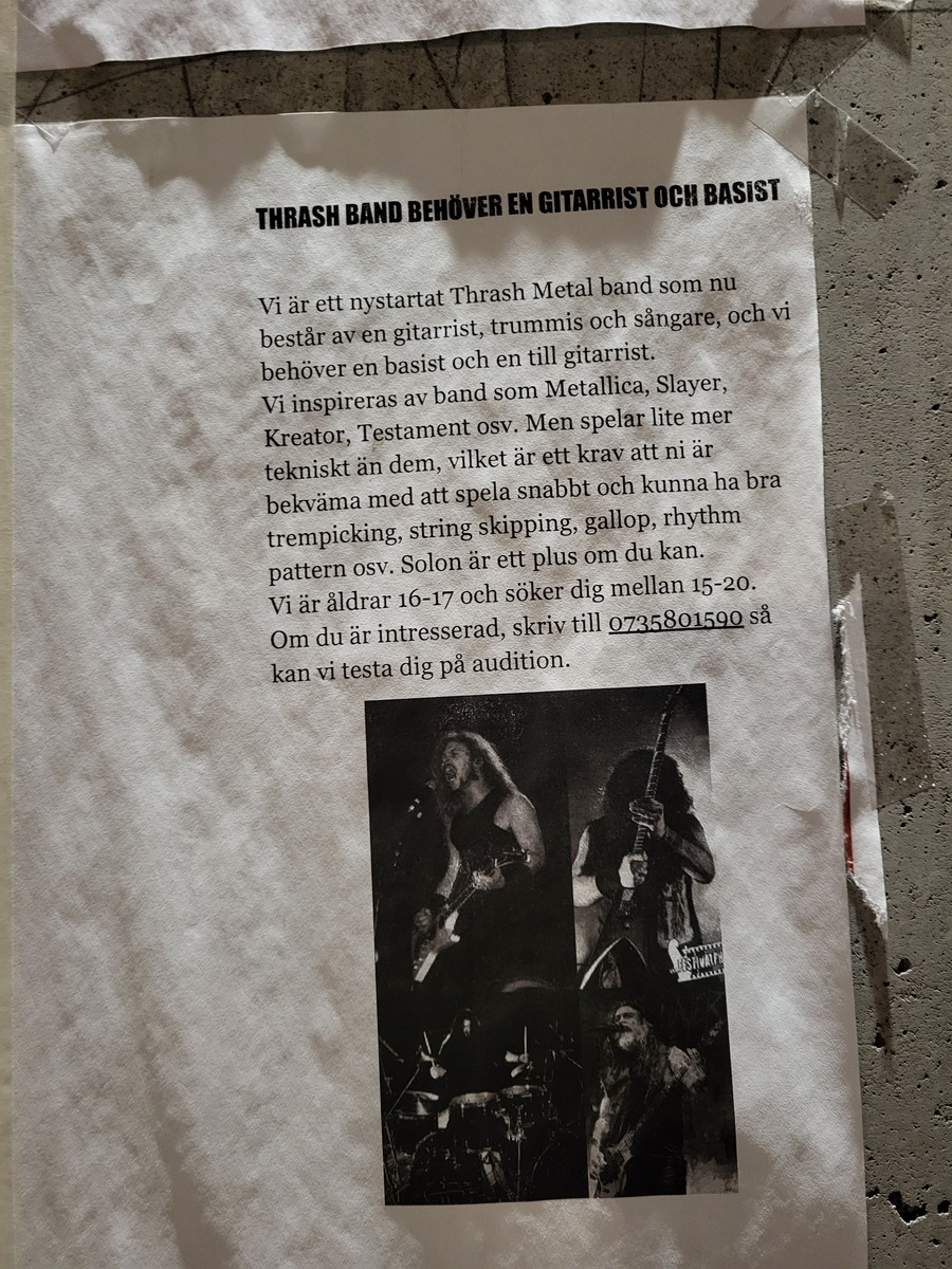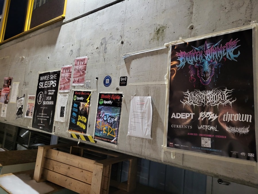 Útközben ettük a finom étket, és két hosszú hajú, bakancsos, felvarrókkal tűzdelt mellényű srác keresztezte az utunkat, őket követve simán eljutottunk a Fryshuset Klubbenig, ami nemcsak egy zenei klubból áll, hanem egy fiatalokat segítő szervezet egyik helyszíne sportarénával és iskolákkal. A klub bejárata előtt már viszonylag hosszú sor állt. Amíg befejeztük a salátát, megnézegettük a tagokat kereső zenekarok hirdetéseit a falon. Rengeteg volt, tök jó volt látni. (Utóbbiról lásd lejjebb a csodás telefonos képeimet.)